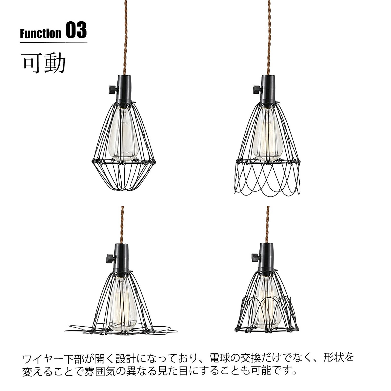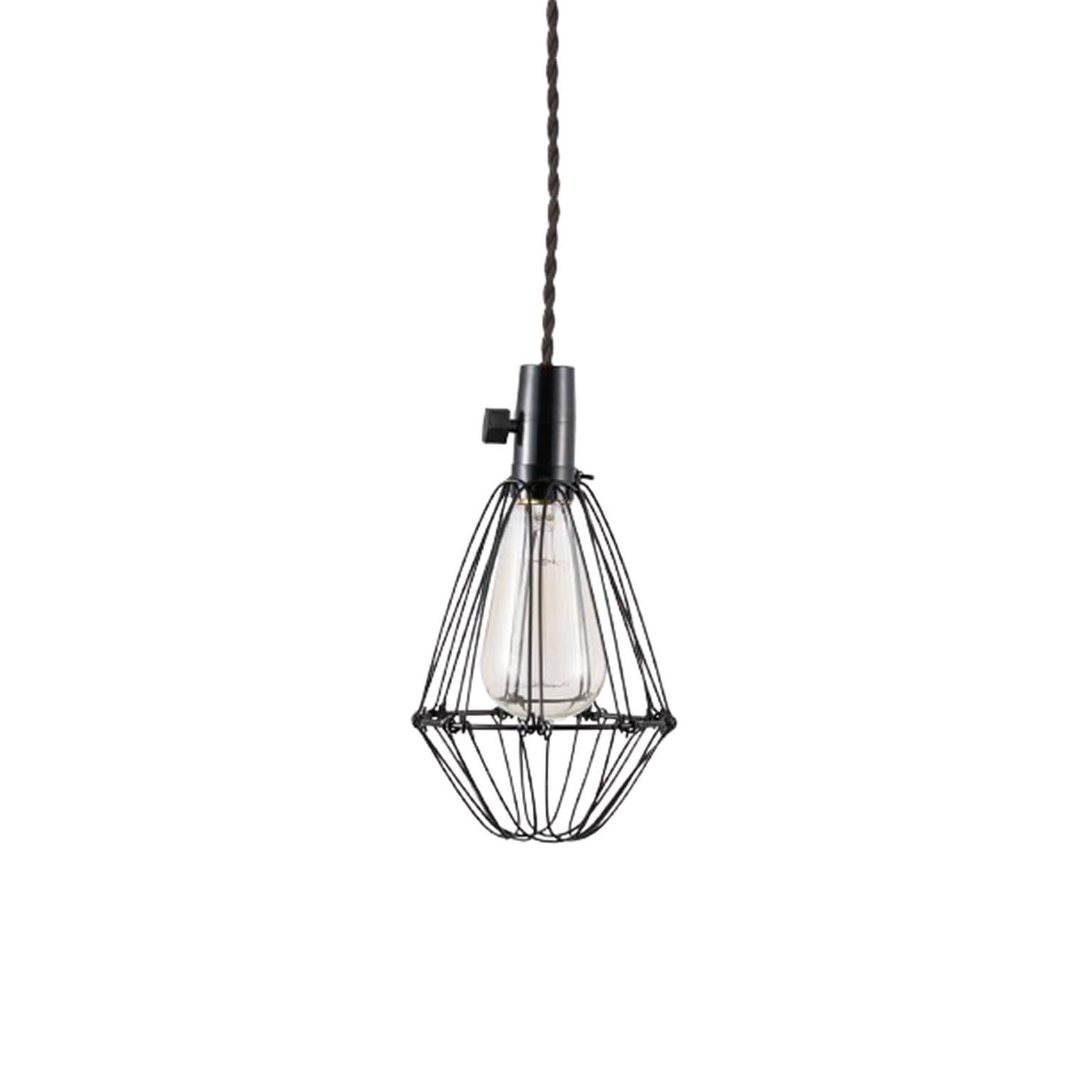 レトロ感のあるツイストコードと灯具部分のロータリースイッチ。シェードはガレージ感のあるスチールワイヤーを組み合わせて趣きある雰囲気に仕上げた1灯タイプのペンダントライト。ワイヤー下部が開く設計になっており、電球の交換だけでなく、形状を変えることで雰囲気の異なる見た目にすることも可能です。多灯吊りで連続使用するのも良し、狭小スペースで単灯使用も雰囲気抜群。シェードはブラックですが、コードがブラック、もしくはブラウンの2色からお選びいただけます。
