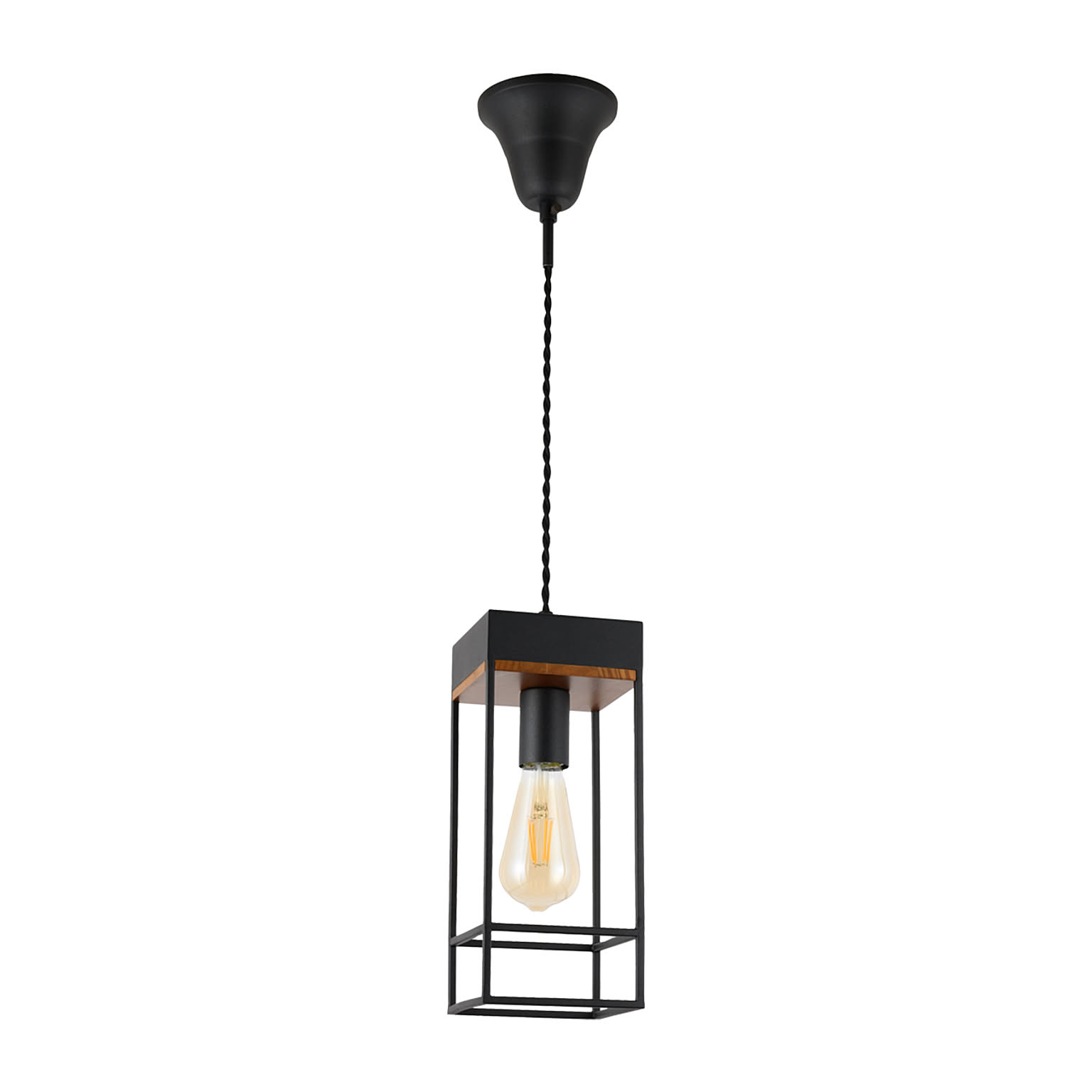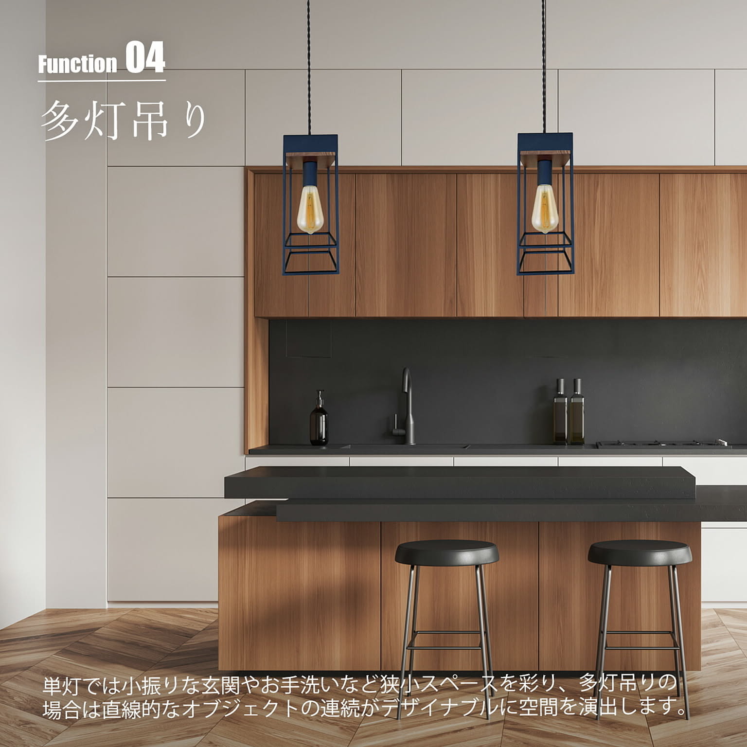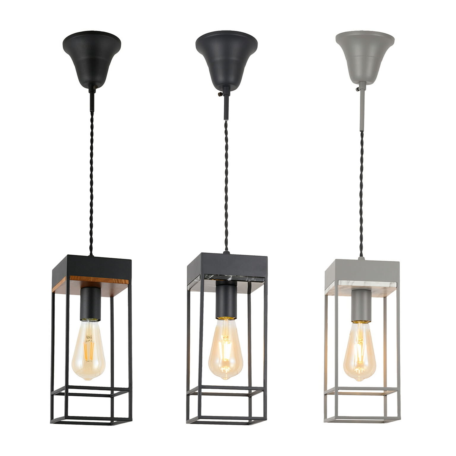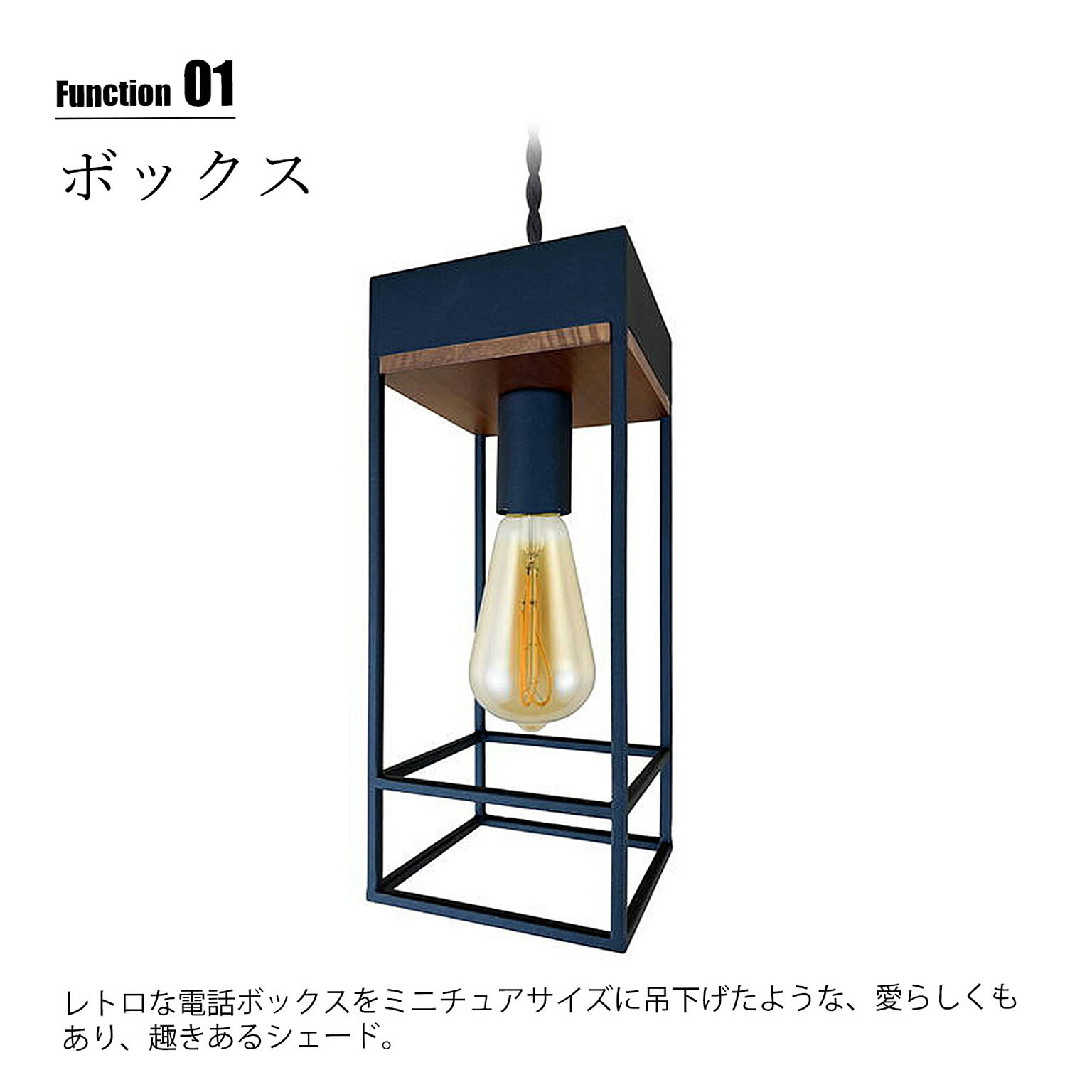 レトロな電話ボックスをミニチュアサイズに吊下げたような、愛らしくもあり、趣きあるペンダントライト。宙に浮く立方体が空間のアクセントとなり、単灯では小振りな玄関やお手洗いなど狭小スペースを彩り、多灯吊りの場合は直線的なオブジェクトの連続がデザイナブルに空間を演出します。シェード内側、ソケットの付け根部分は大理石や木目調の塗装を施し高級感もプラスしています。使い方次第でレトロでもあり、モダンでもある稀有なデザインで、多様なシーンにマッチします。