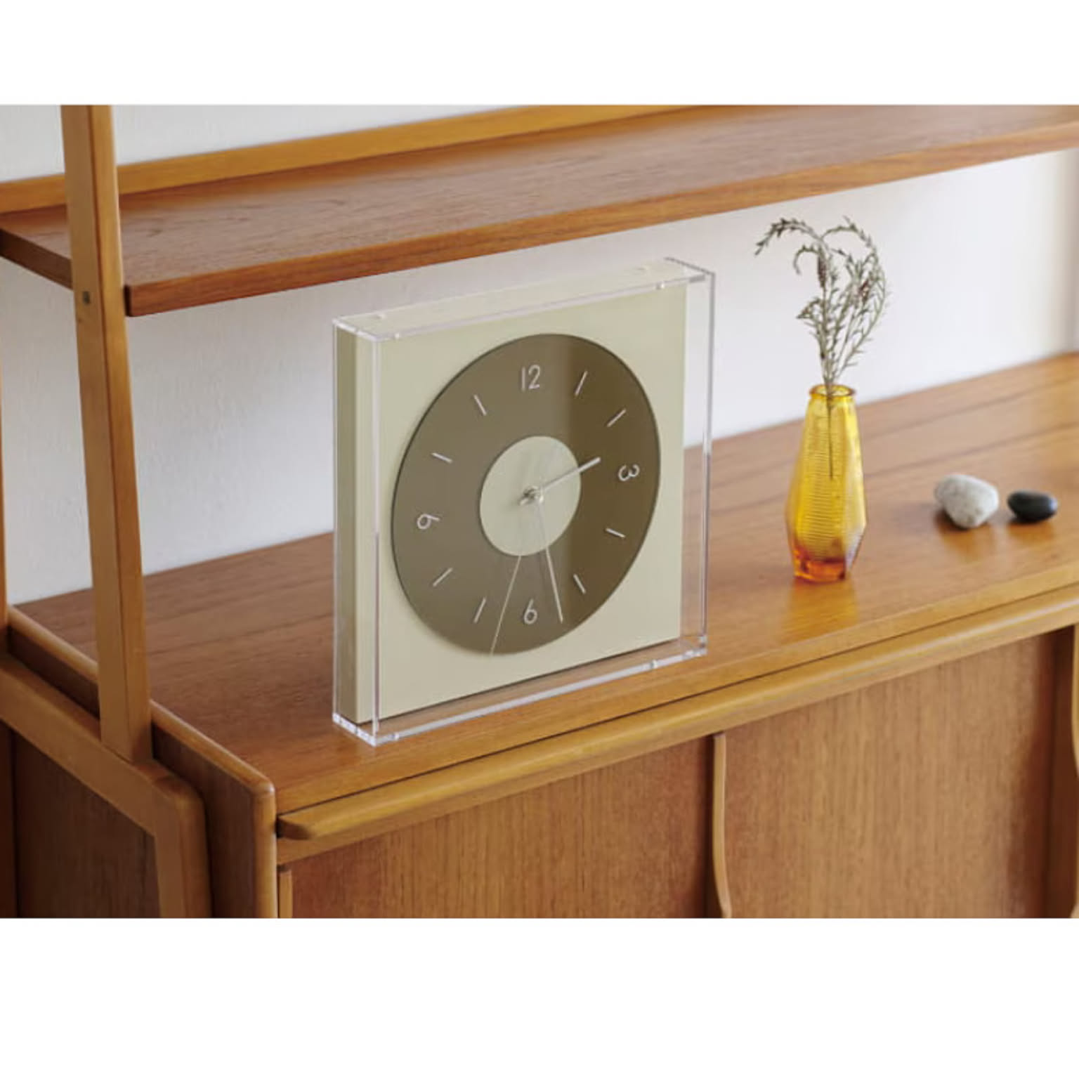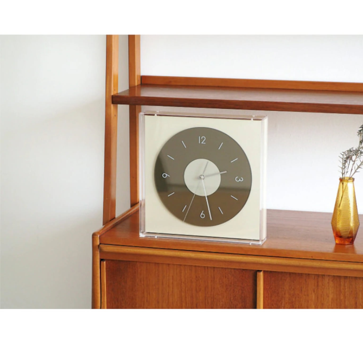レコードプレイヤーをモチーフにしたレトロフューチャーのエッセンスあふれるデザイン。 レコード針をイメージした秒針が透け感のあるブラウンのアクリルプレートの上を滑らかに回り、心地よいBGMのように空間を彩ります。 ※充電池はお使いいただけません 単3乾電を池使用ください(乾電池は付属しません)