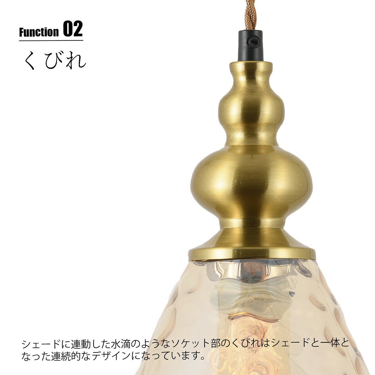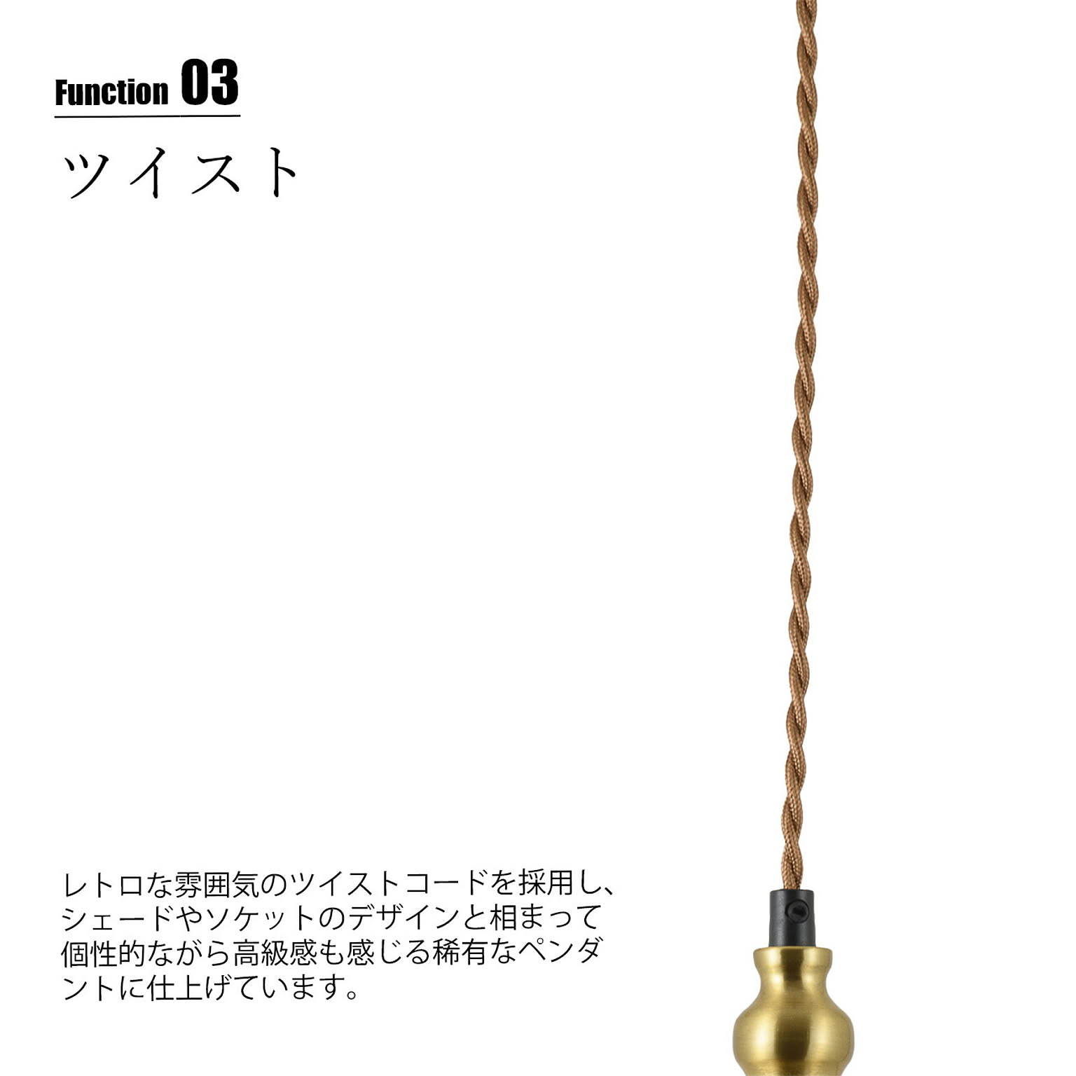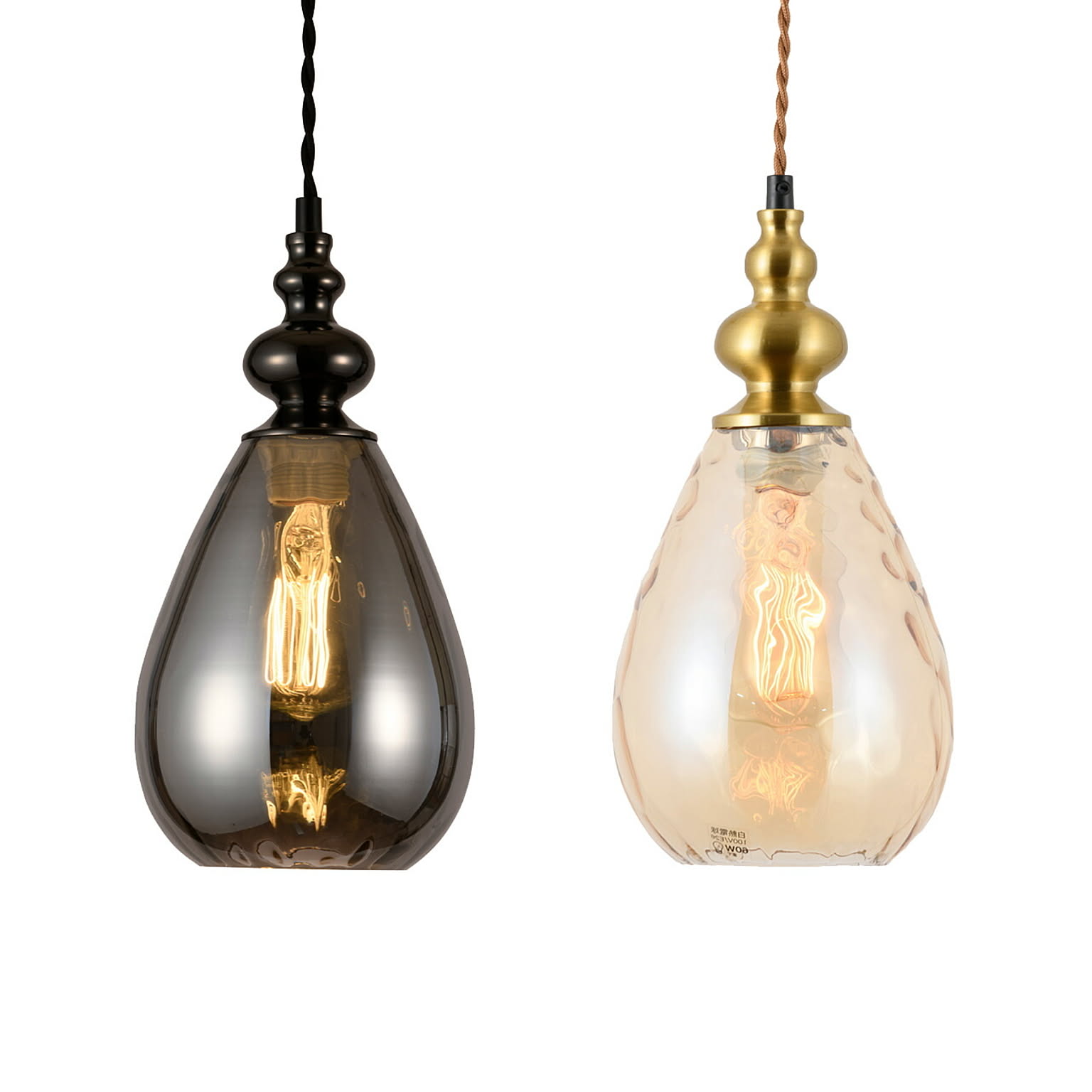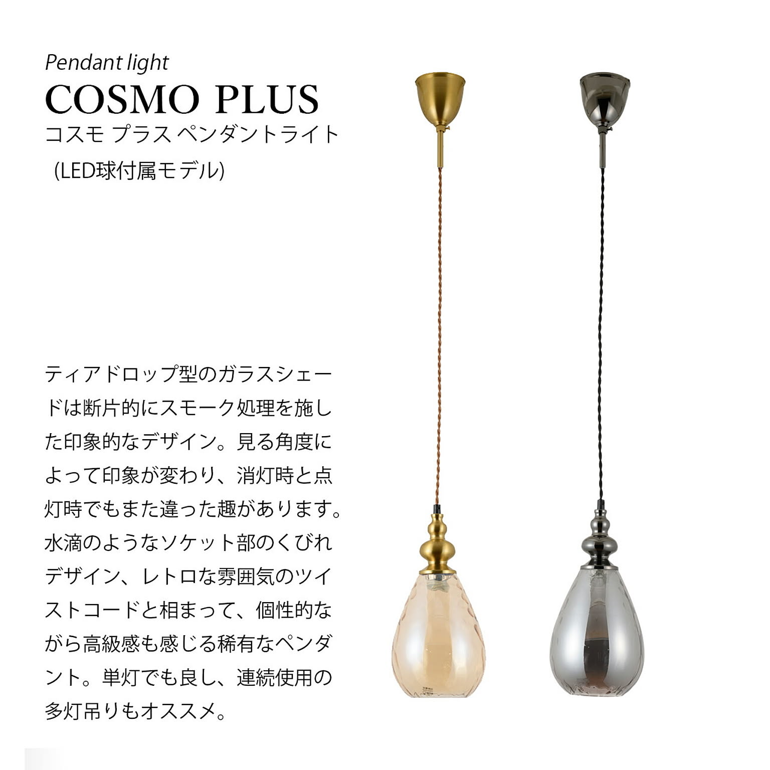 ティアドロップ型のガラスシェードは断片的にスモーク処理を施した印象的なデザイン。見る角度によって印象が変わり、消灯時と点灯時でもまた違った趣があります。水滴のようなソケット部のくびれデザイン、レトロな雰囲気のツイストコードと相まって、個性的ながら高級感も感じる稀有なペンダント。単灯でも良し、連続使用の多灯吊りもオススメ。