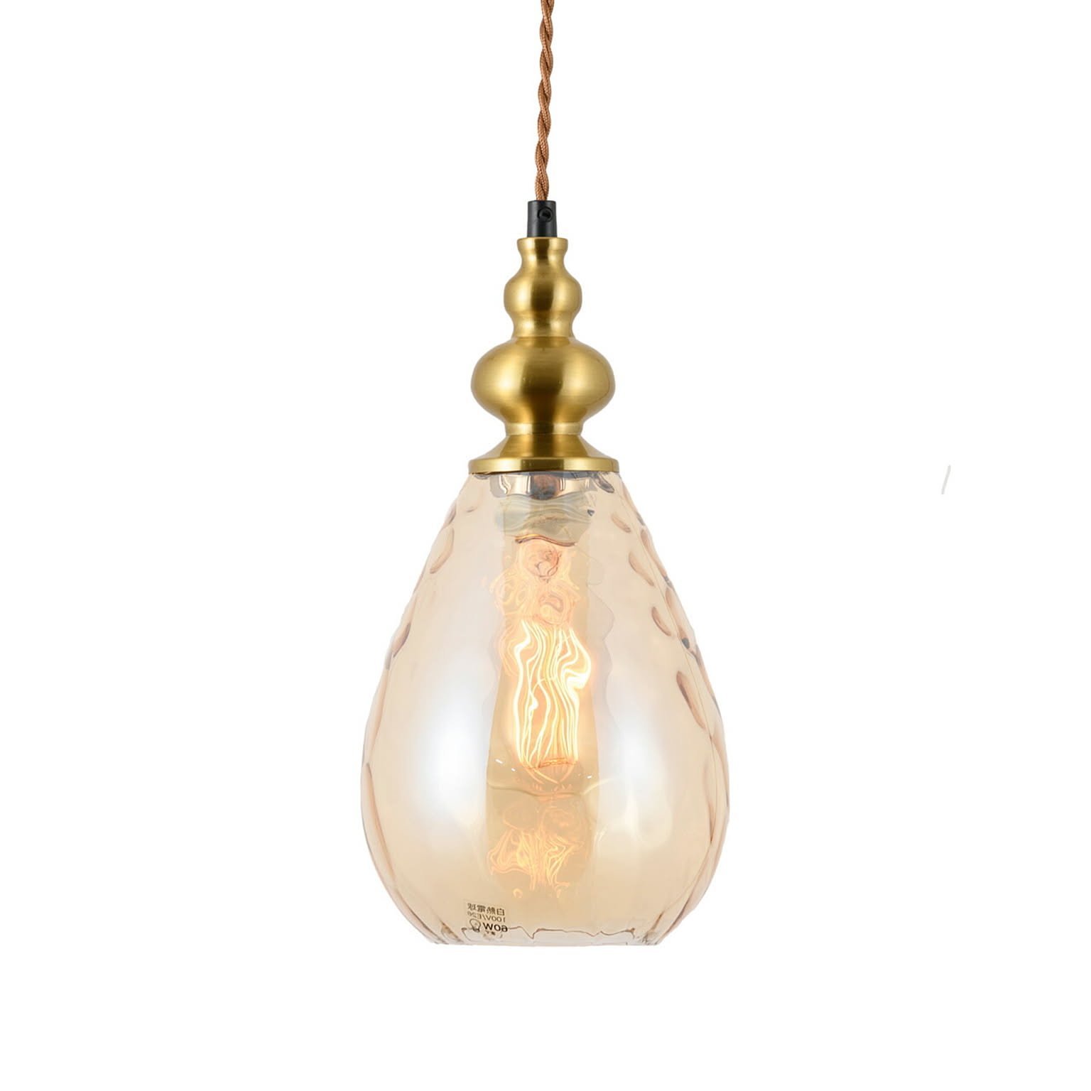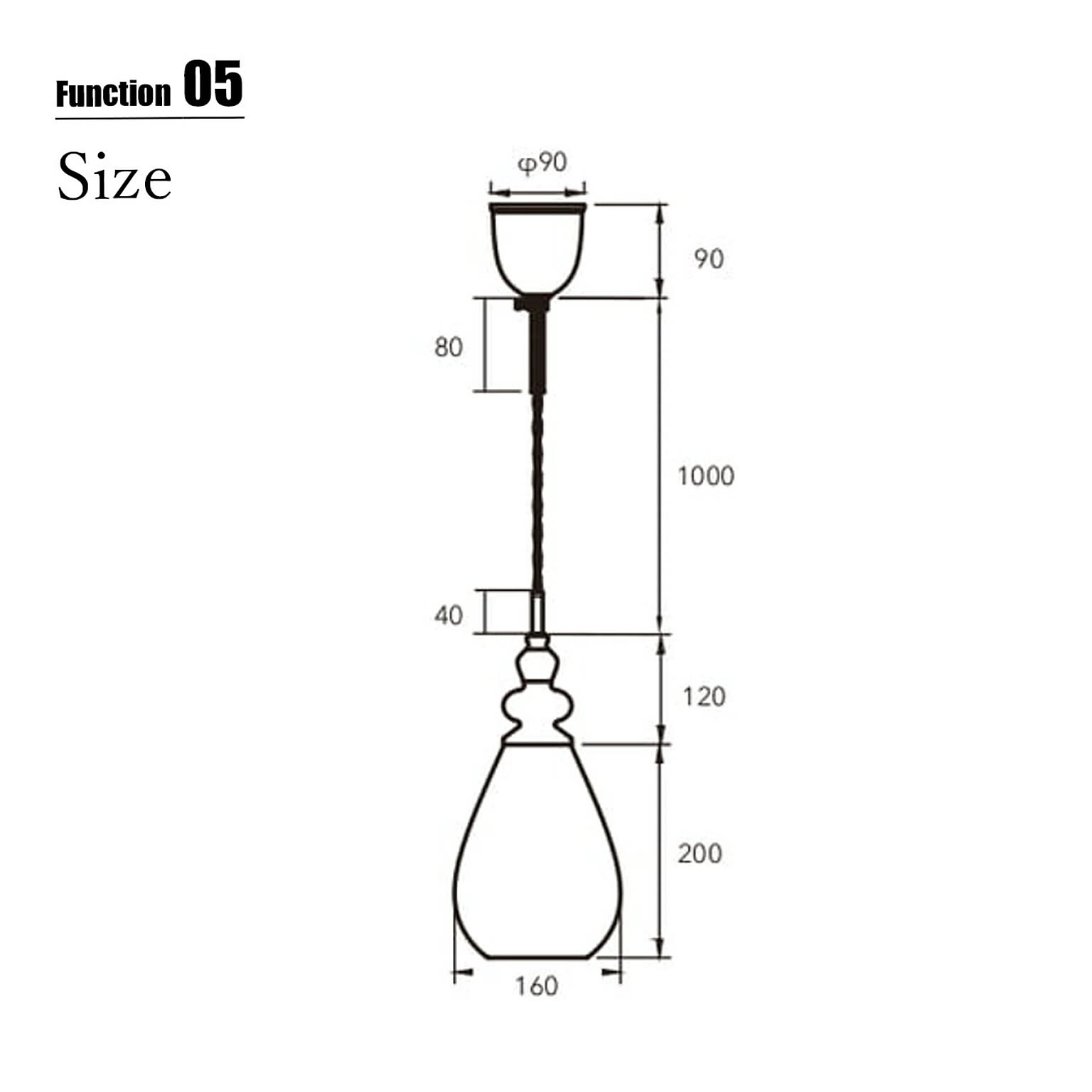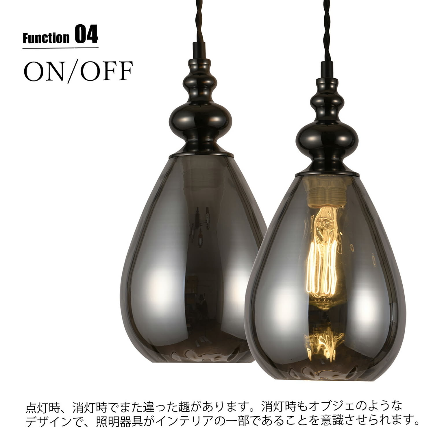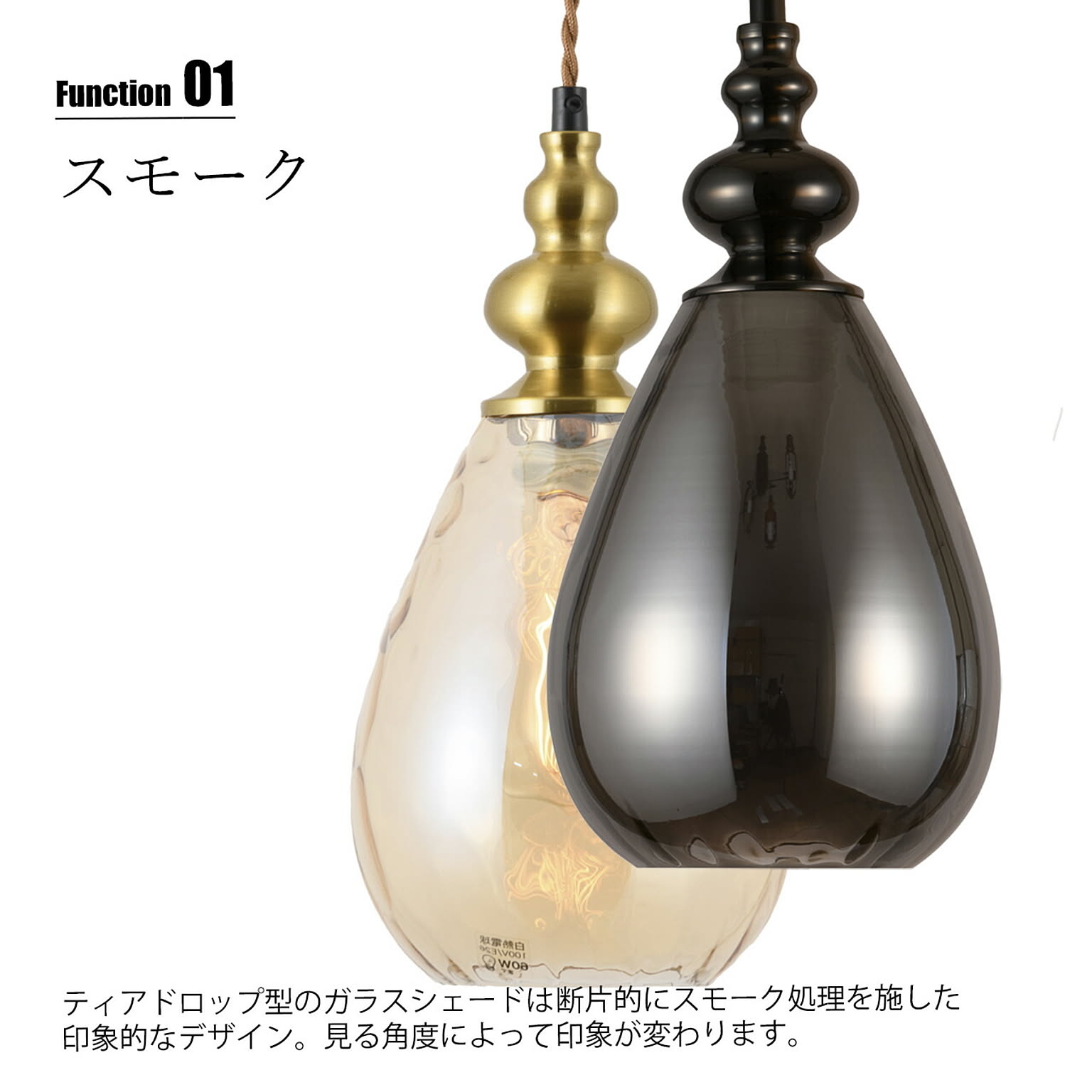 ティアドロップ型のガラスシェードは断片的にスモーク処理を施した印象的なデザイン。見る角度によって印象が変わり、消灯時と点灯時でもまた違った趣があります。水滴のようなソケット部のくびれデザイン、レトロな雰囲気のツイストコードと相まって、個性的ながら高級感も感じる稀有なペンダント。単灯でも良し、連続使用の多灯吊りもオススメ。