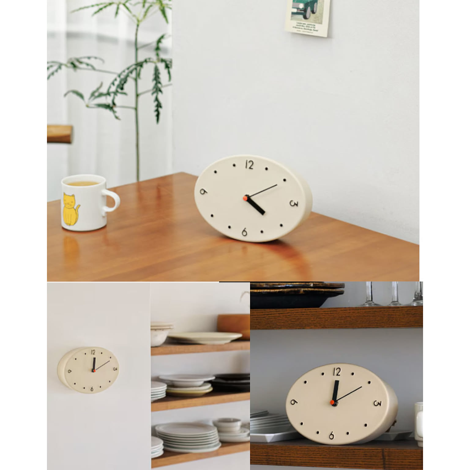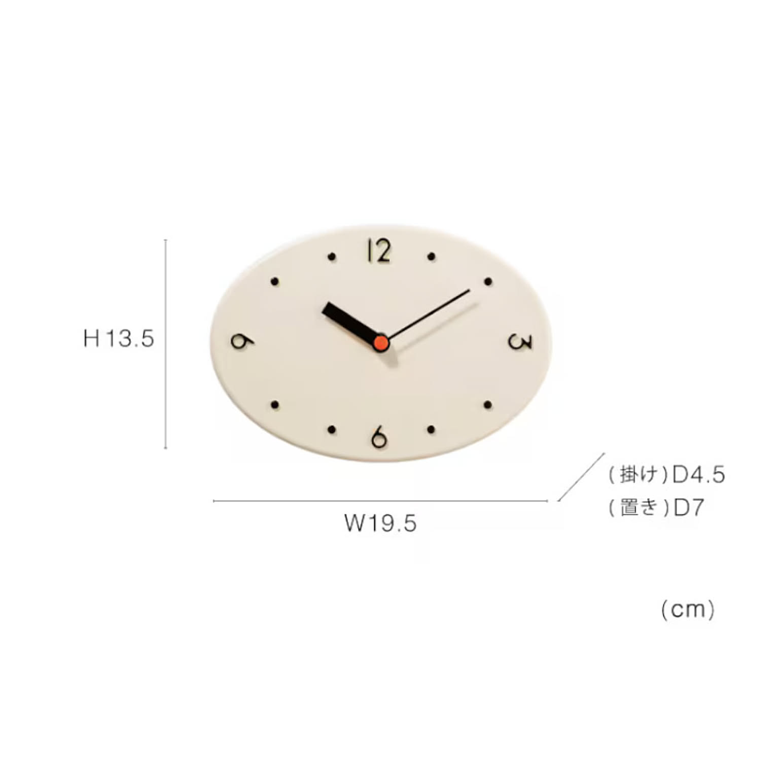◆寸法 (掛けた場合)約W19.5×H13.5×D4.5cm (置いた場合)約W19.5×H13.5×D7cm ◆素材 ポリレジン 重 量 0.6kg ◆機能 スイープムーブメント 置き掛け2way仕様 壁掛け用木ネジ付
