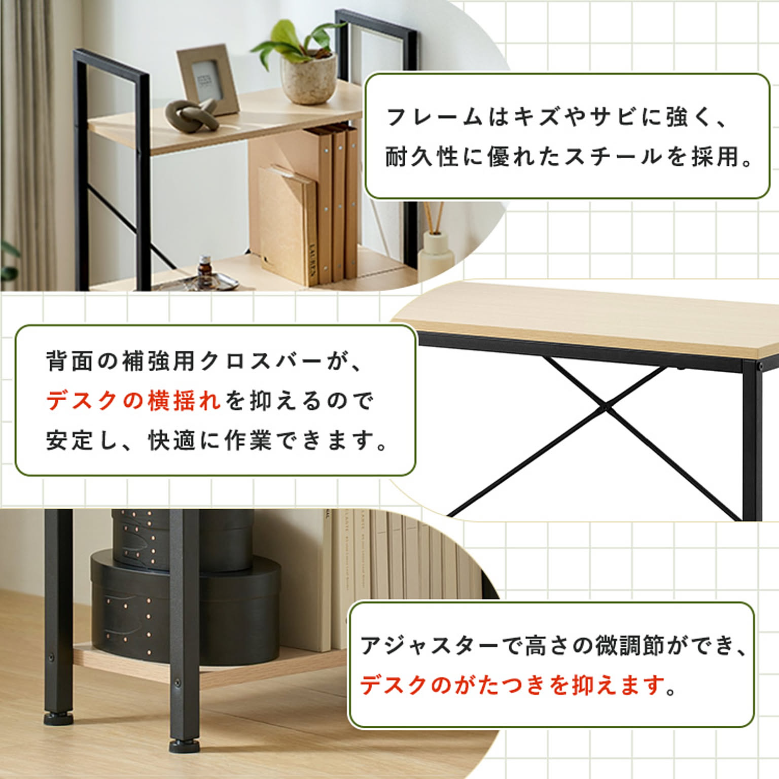 脚部はアジャスター付きで、がたつきを防止します。