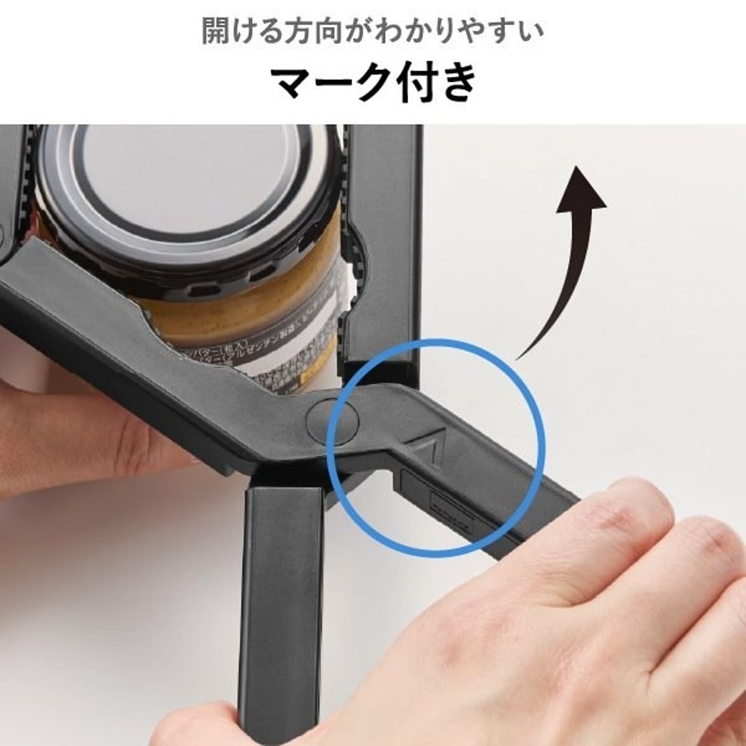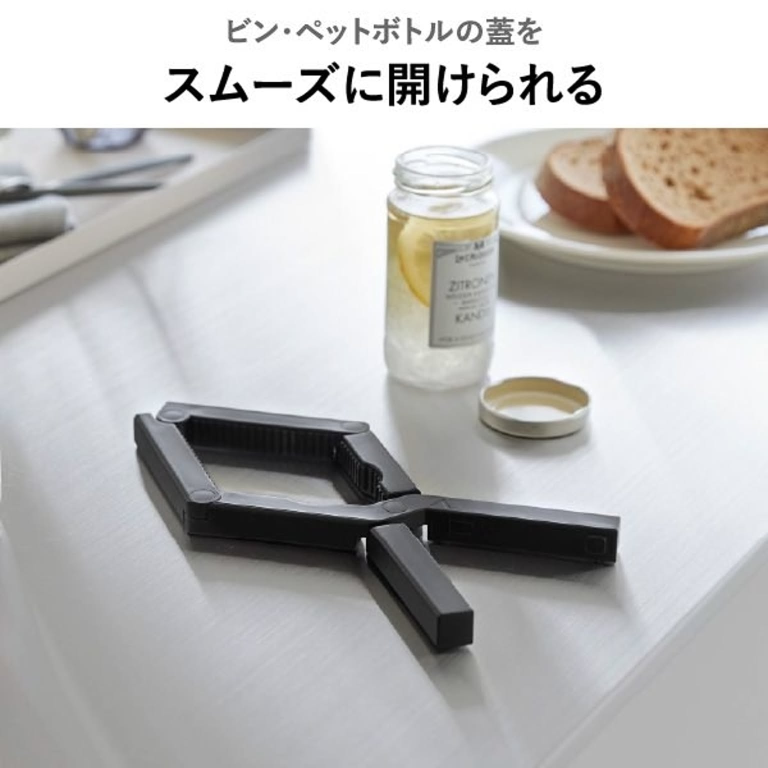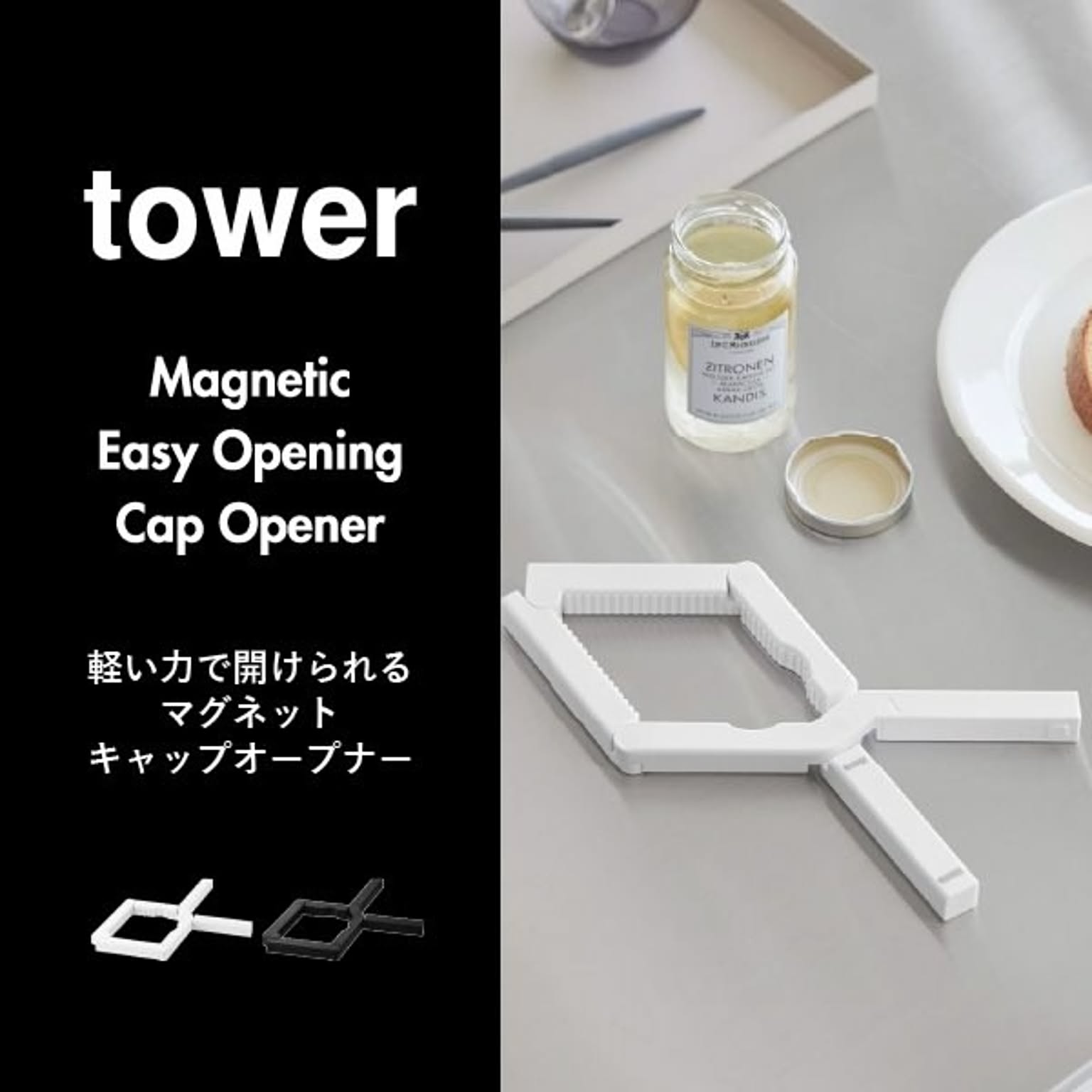 ビンやペットボトルの蓋を開けるときに便利な、towerシリーズのキャップオープナーです。ハンドルを握って回すだけで、スムーズに蓋を開けることができます。軽い力で簡単に蓋を開けられるので、高齢者の方や力の弱い方にも安心してお使いいただけます。キャップオープナーのハンドルは、高齢者の方でも握りやすく、蓋を開けるときの負担を軽減します。ネイル中の方も、爪を傷つける心配がないのでおすすめです。キャップオープナー内側の凸凹で蓋をしっかりホールドするため、使い心地も快適です。こちらのキャップオープナーは、さまざまなサイズの蓋に対応しています。ジャムやサプリメントなどのビンの蓋やペットボトルの蓋など、高齢者の方が日常的に使うアイテムに対応しているのは嬉しいですね。ハンドルには、開ける方向がわかりやすいマーク付きで、高齢者の方も迷わず開けられます。マグネットが内蔵されており、そのまま冷蔵庫などに貼り付けて収納できます。キャップオープナーは、畳むととてもスリムなので、場所を取らずに収納できます。シリコーンの滑り止め付きでずり落ちにくく、マグネットが付く壁面にしっかり固定できます。モノトーンのシンプルなデザインのキャップオープナー。ホワイトとブラックの2色からお選びいただけます。山崎実業 タワーシリーズのおしゃれなボトルオープナー、蓋開け便利グッズをお探しの方にもぴったり。毎日の生活で「蓋が固くて開けられない」という高齢者の方のお悩みを、無理なく解消してくれるキャップオープナー。高齢者の方はもちろん、家族みんなで使える便利なアイテムです。