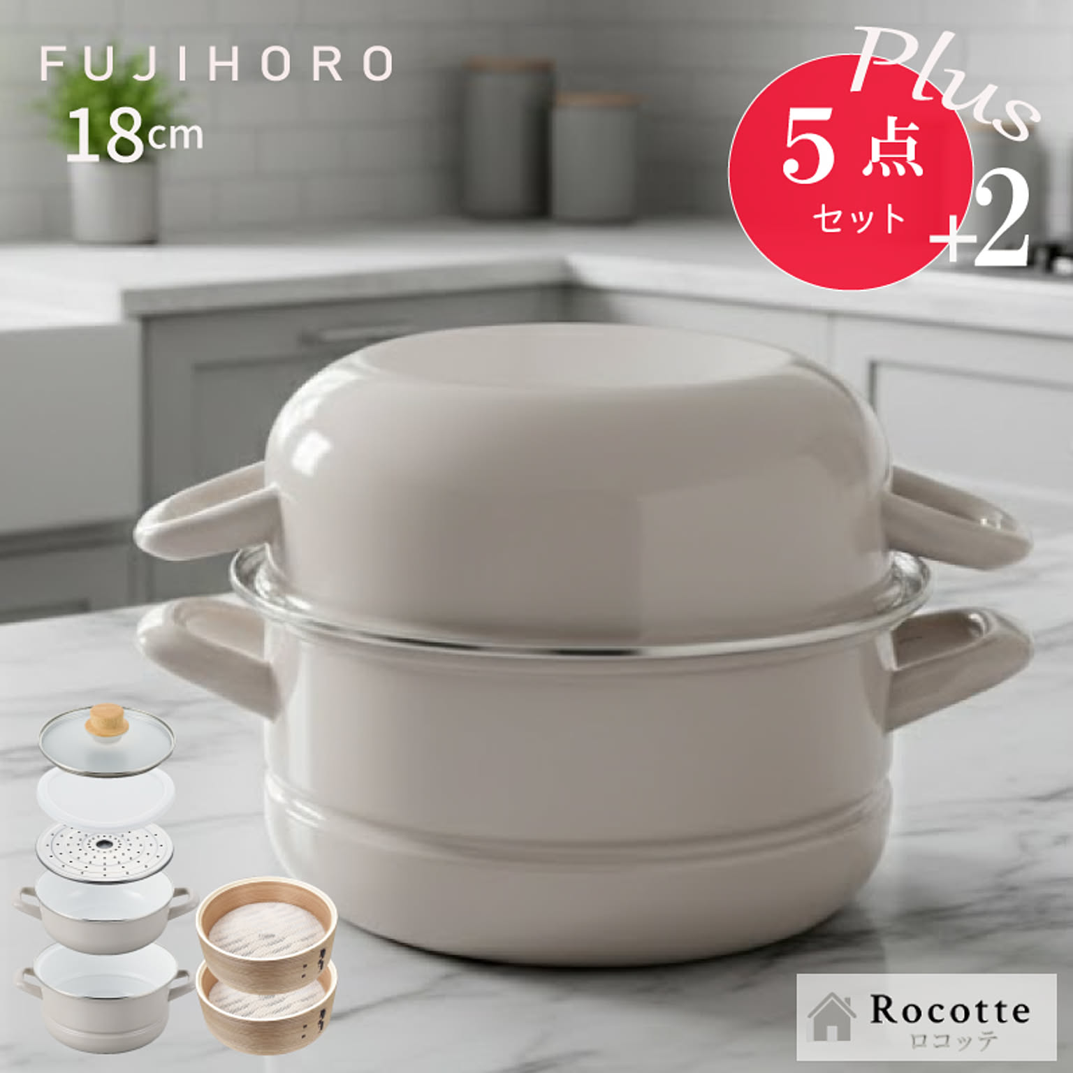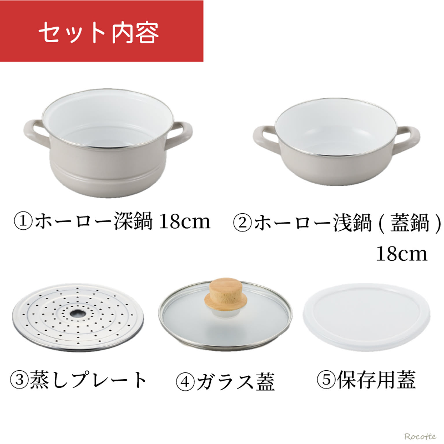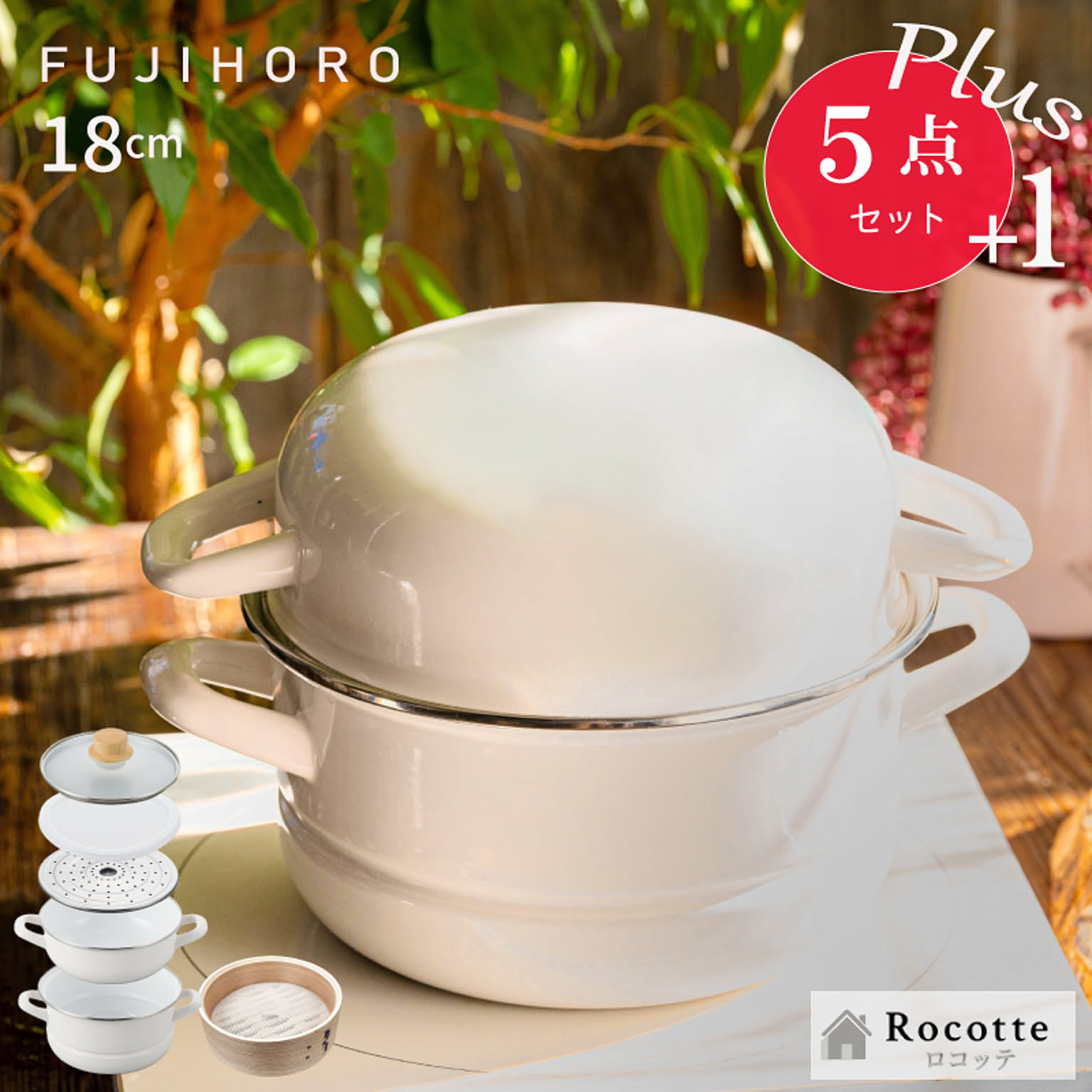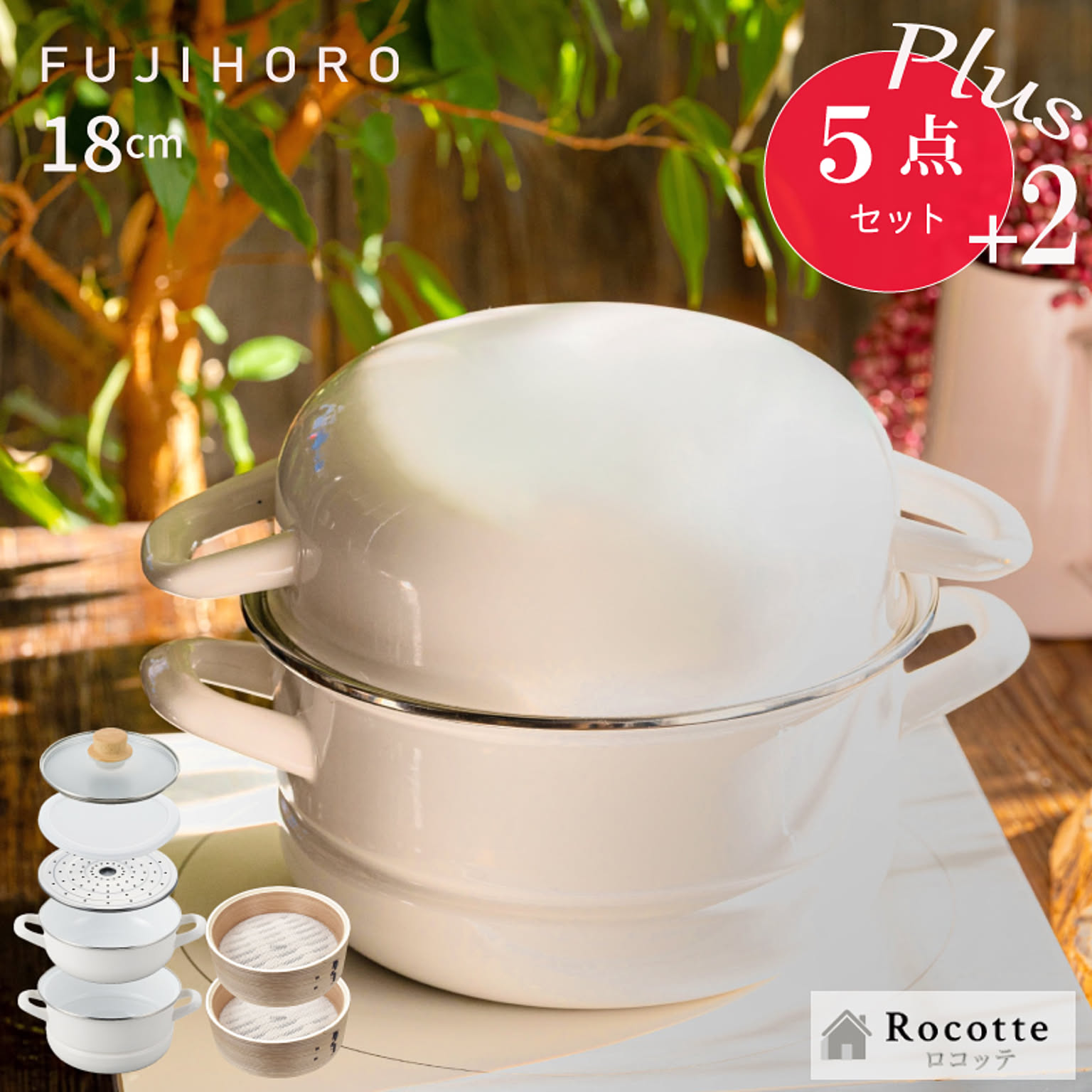 | セット内容 | 鍋本体(深鍋)、蓋鍋(浅鍋)、ガラス蓋、保存用蓋、蒸しプレート ※オプション販売:せいろ |
