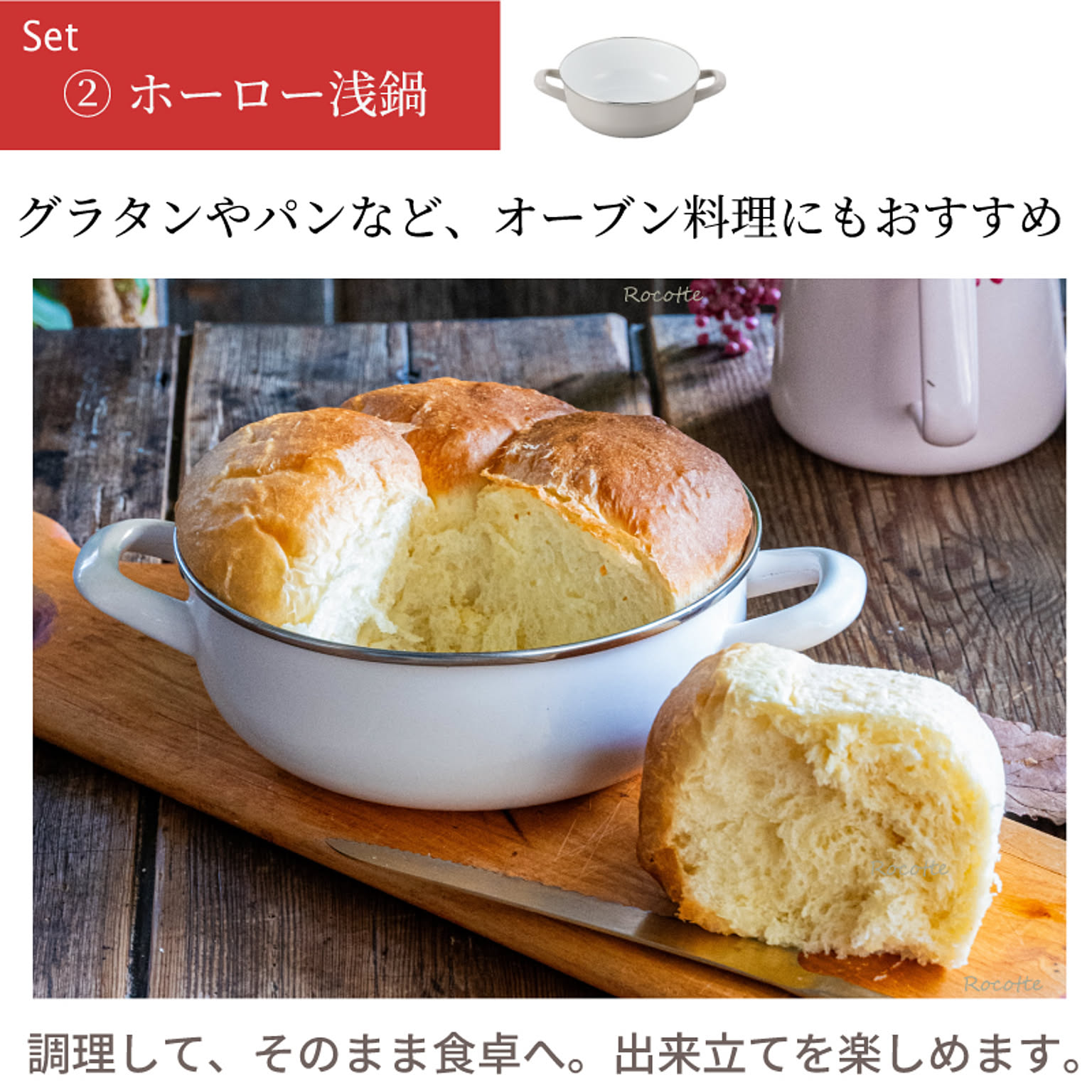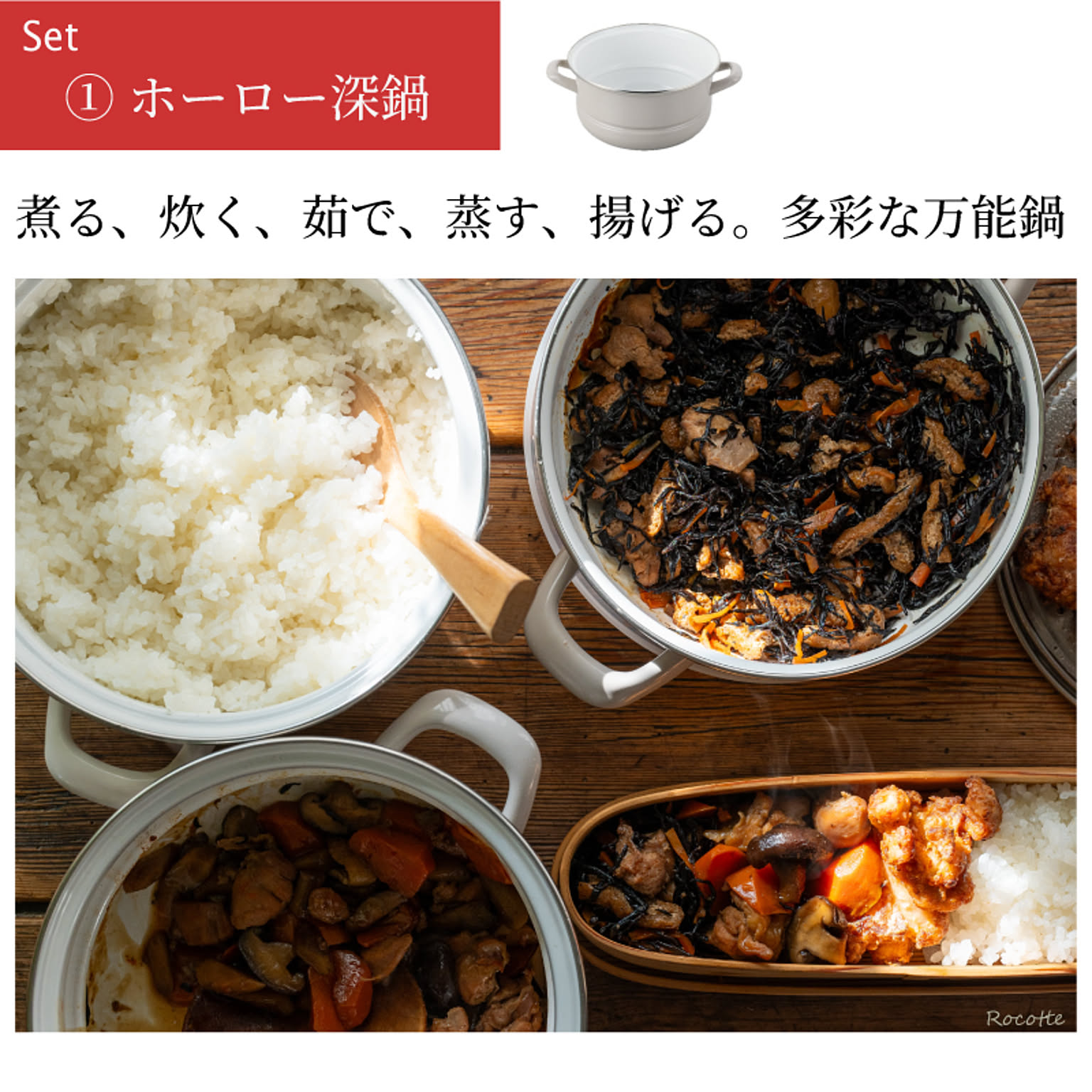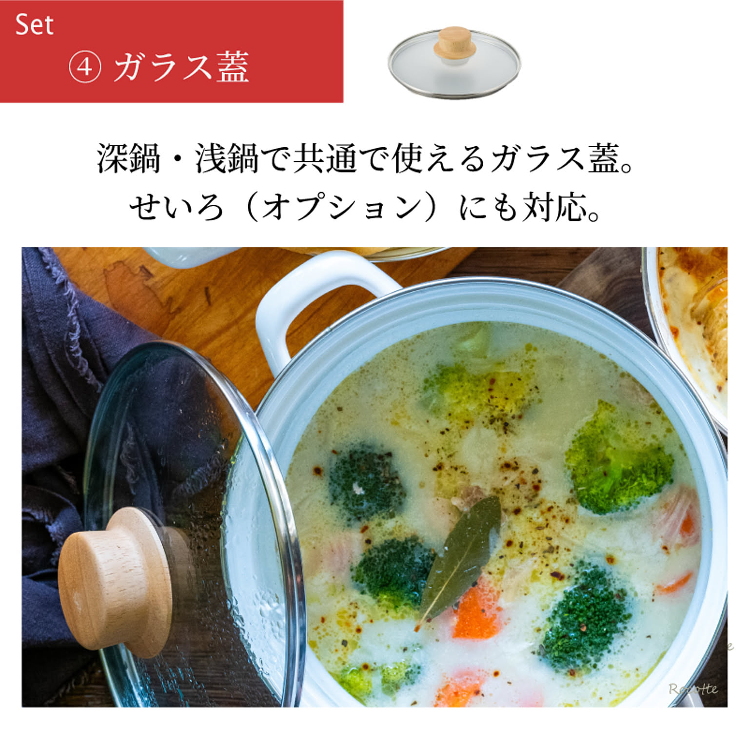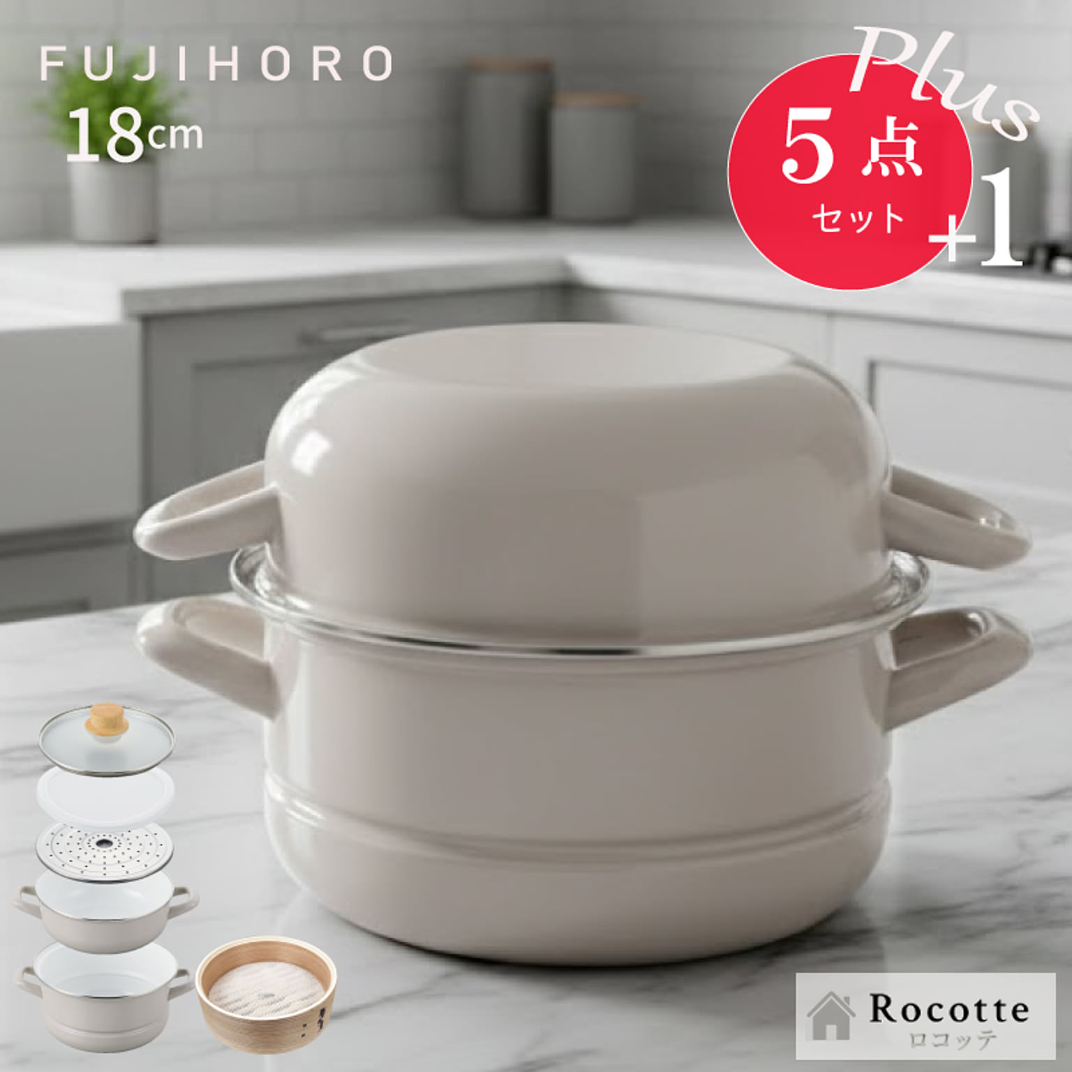 | セット内容 | 鍋本体(深鍋)、蓋鍋(浅鍋)、ガラス蓋、保存用蓋、蒸しプレート ※オプション販売:せいろ |