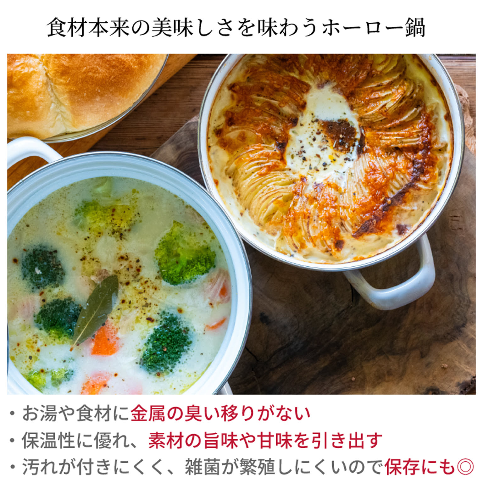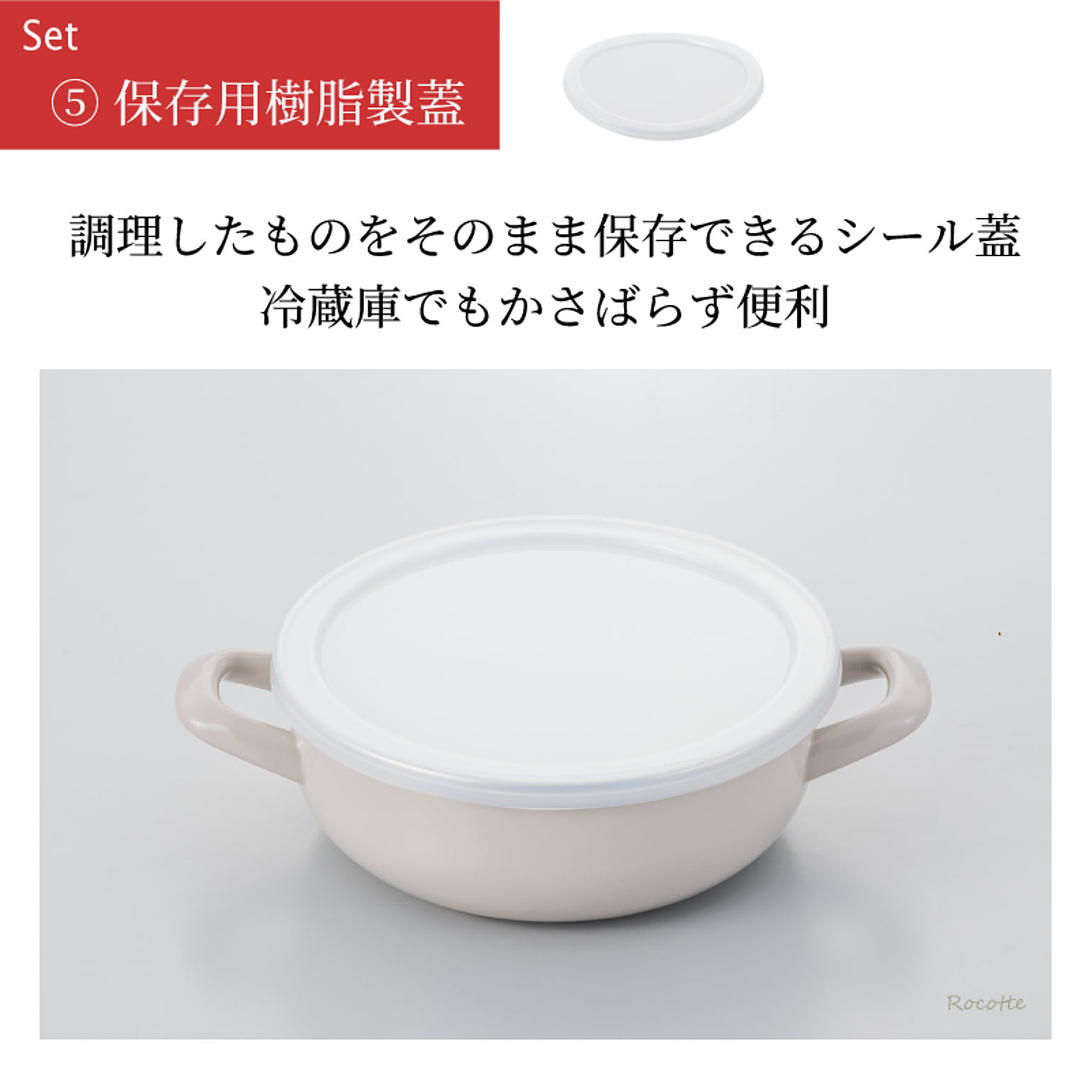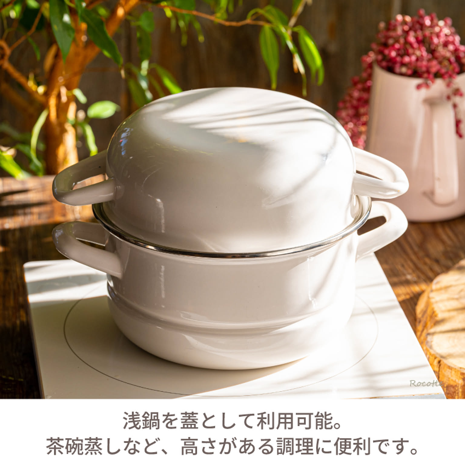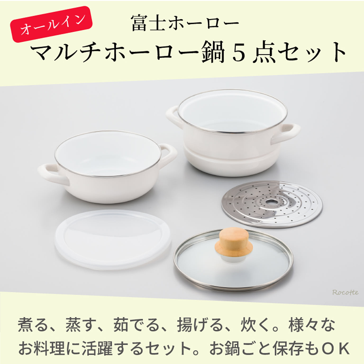 | 素材詳細 | ●鍋本体:ホーロー用鋼板(ホーロー加工) ●蒸しプレート:ステンレス ●ガラス蓋:強化ガラス ※ フチ:ステンレス/つまみ:木材 ●保存蓋:ポリエチレン |