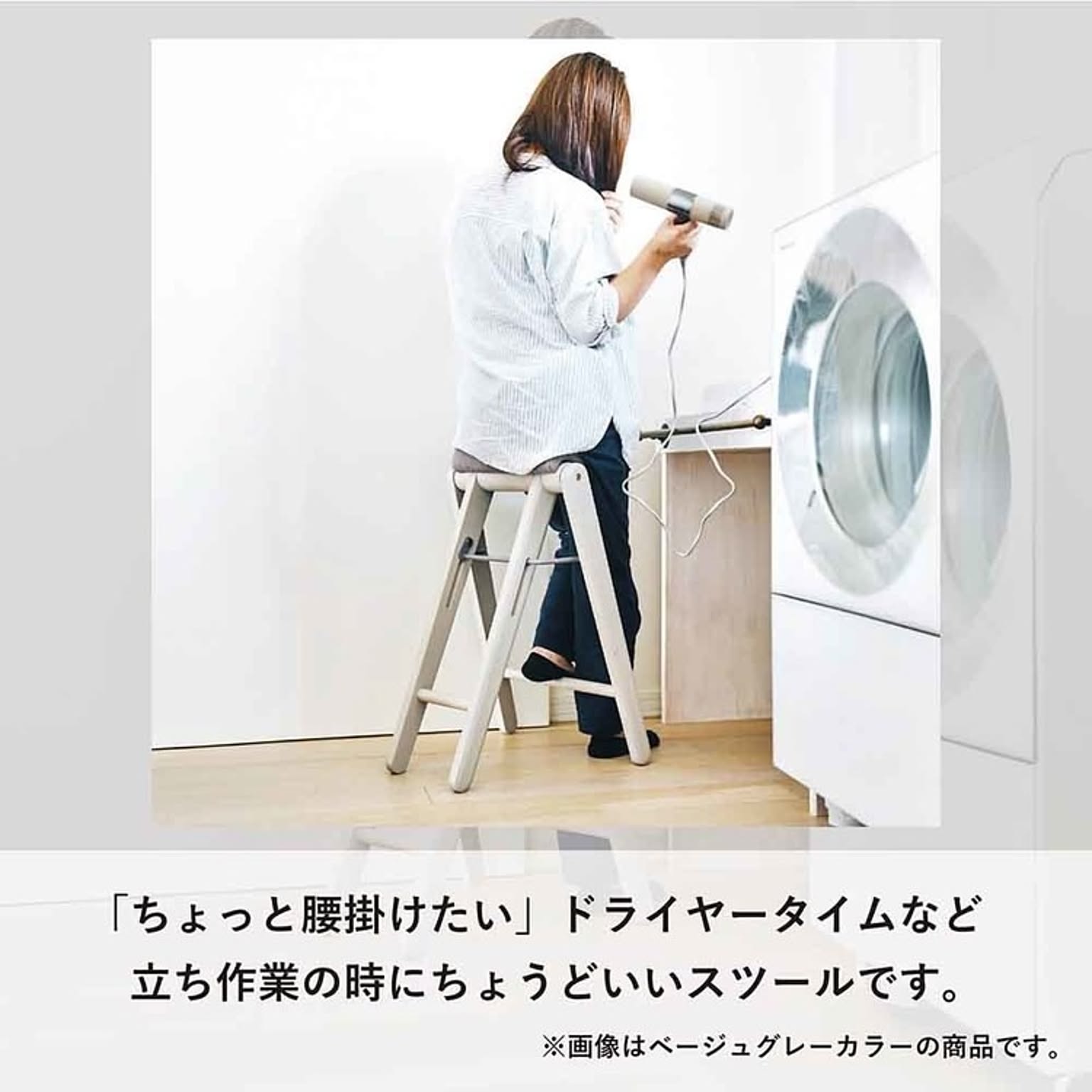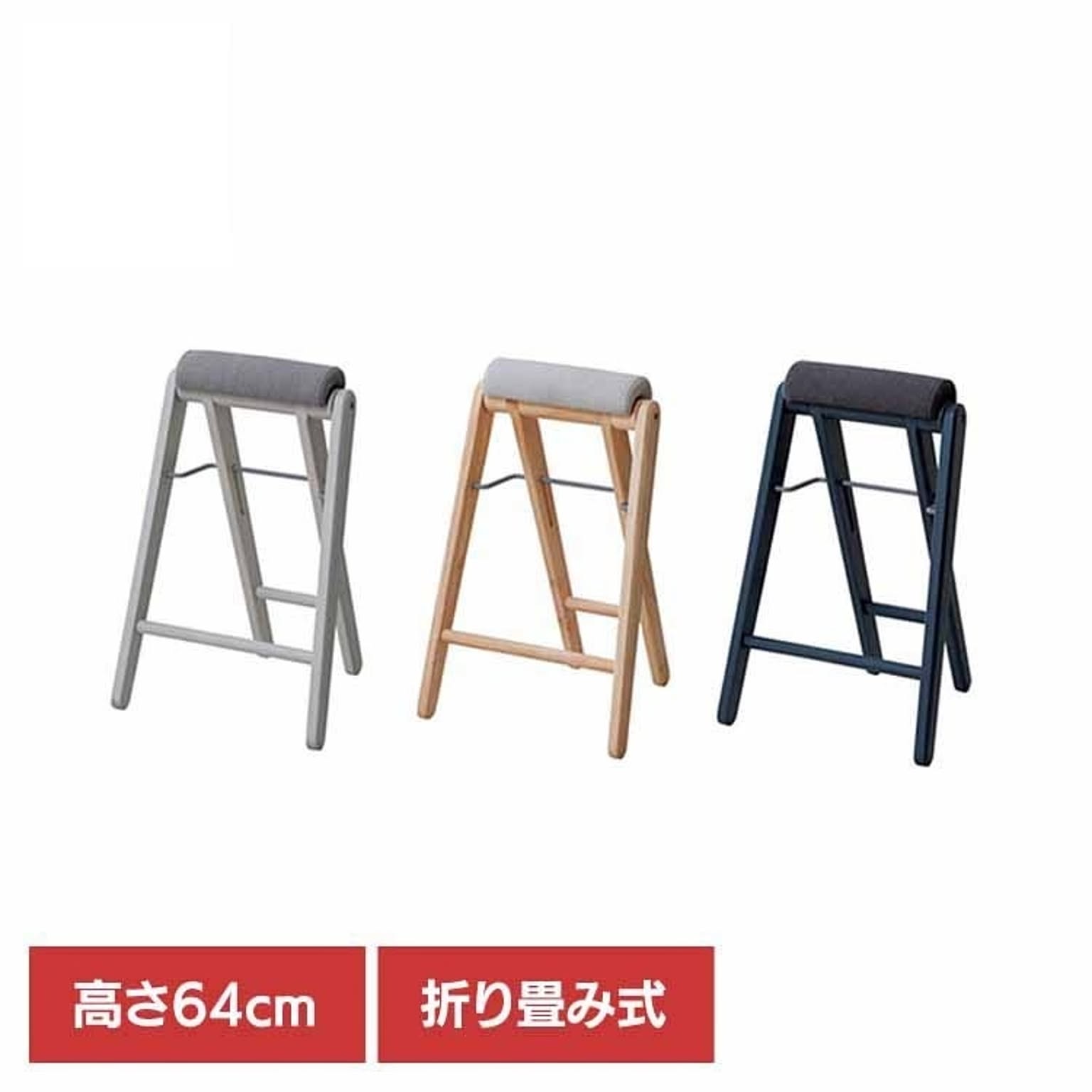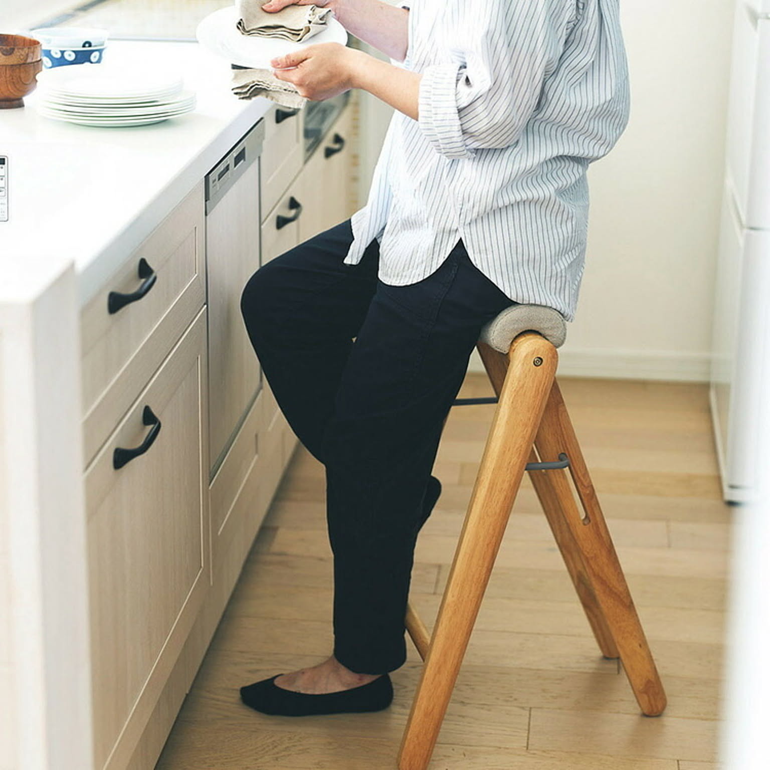 キッチンやドライヤースツールとして使える、折り畳みハイスツール。 次の動作にも移りやすいチョイがけタイプです。 ●商品サイズ(cm) 本体外寸:幅約43×奥行約42×高さ約64 座面サイズ:幅約30×奥行約10×高さ約3.5 折り畳み時:幅約43×奥行き約10.5×高さ約69 ●商品重量 約3.5kg ●材質 張地:布(ポリエステル100%) フレーム:天然木(ラバーウッド、t25mm)塗装
