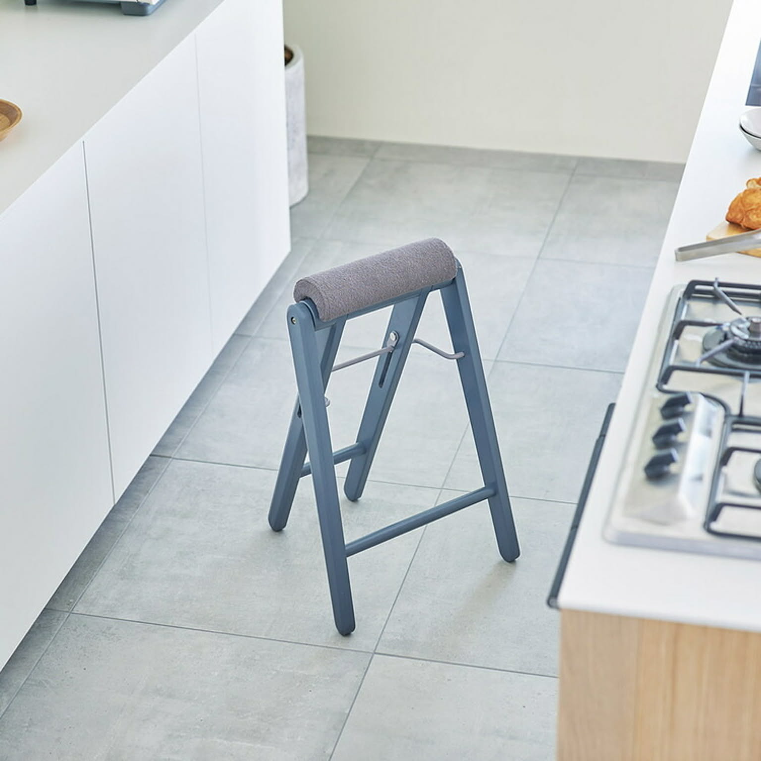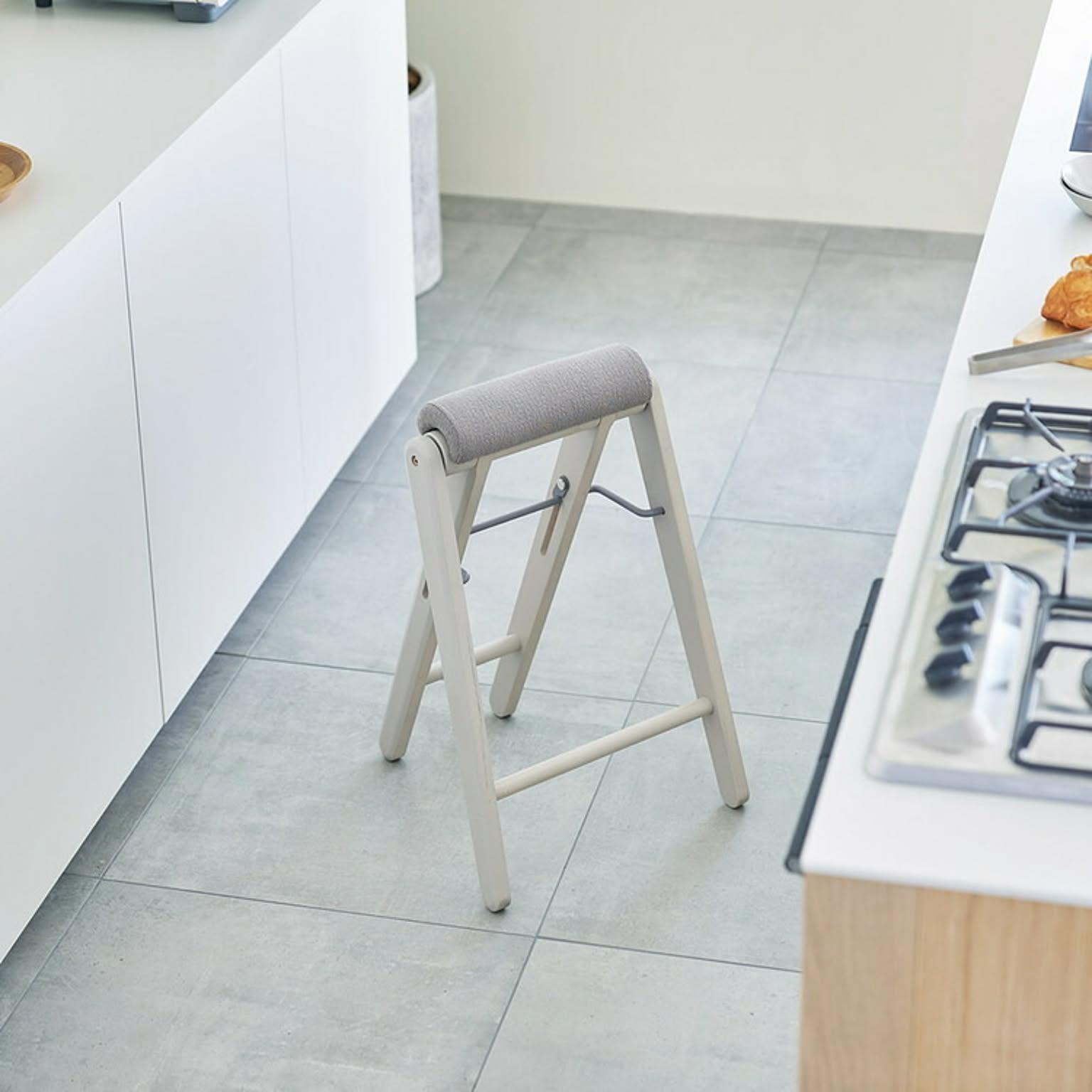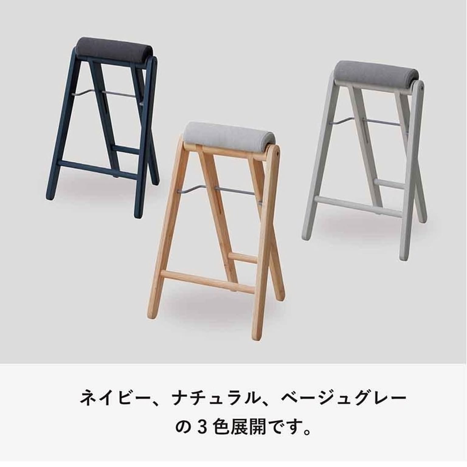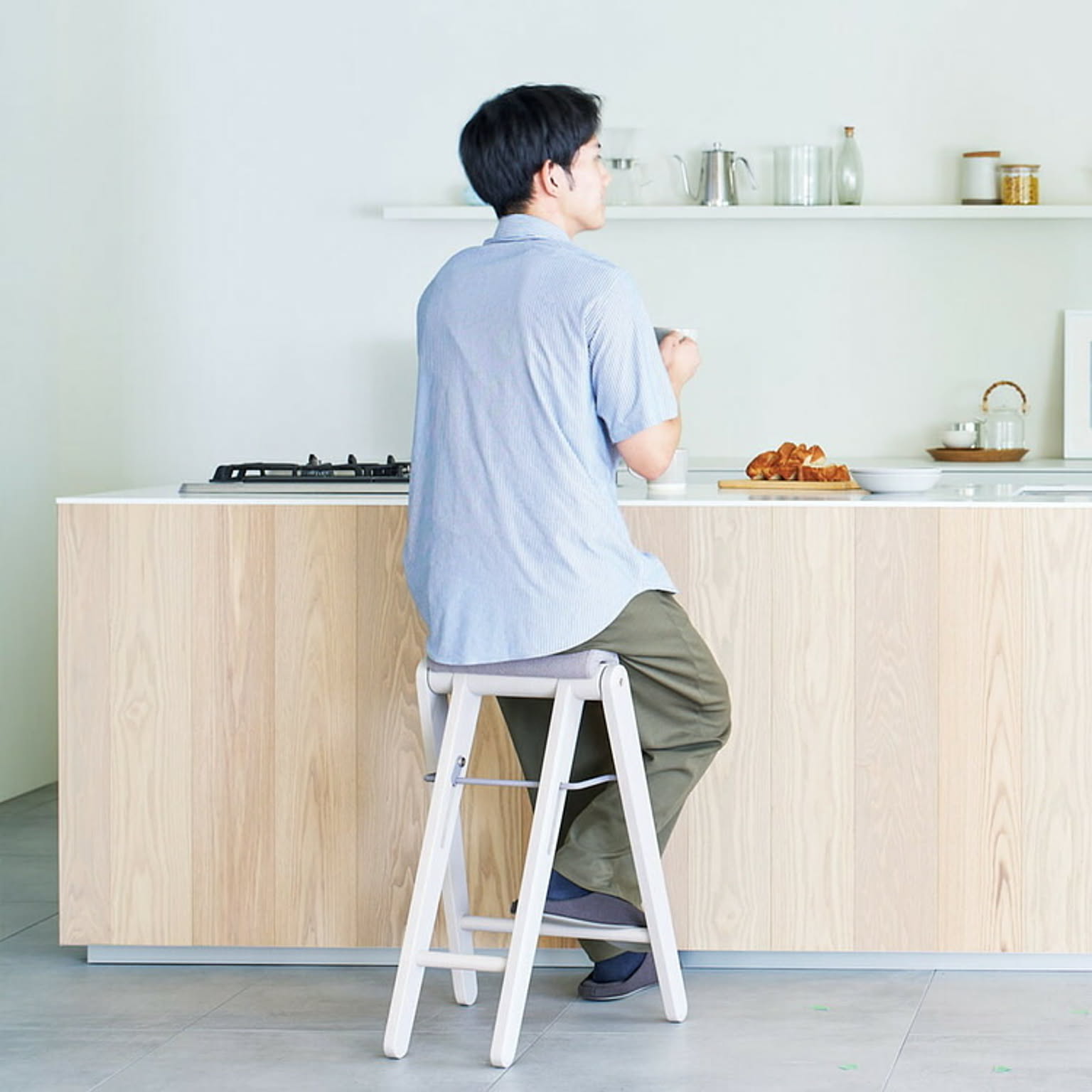 キッチンやドライヤースツールとして使える、折り畳みハイスツール。 次の動作にも移りやすいチョイがけタイプです。 ●商品サイズ(cm) 本体外寸:幅約43×奥行約42×高さ約64 座面サイズ:幅約30×奥行約10×高さ約3.5 折り畳み時:幅約43×奥行き約10.5×高さ約69 ●商品重量 約3.5kg ●材質 張地:布(ポリエステル100%) フレーム:天然木(ラバーウッド、t25mm)塗装