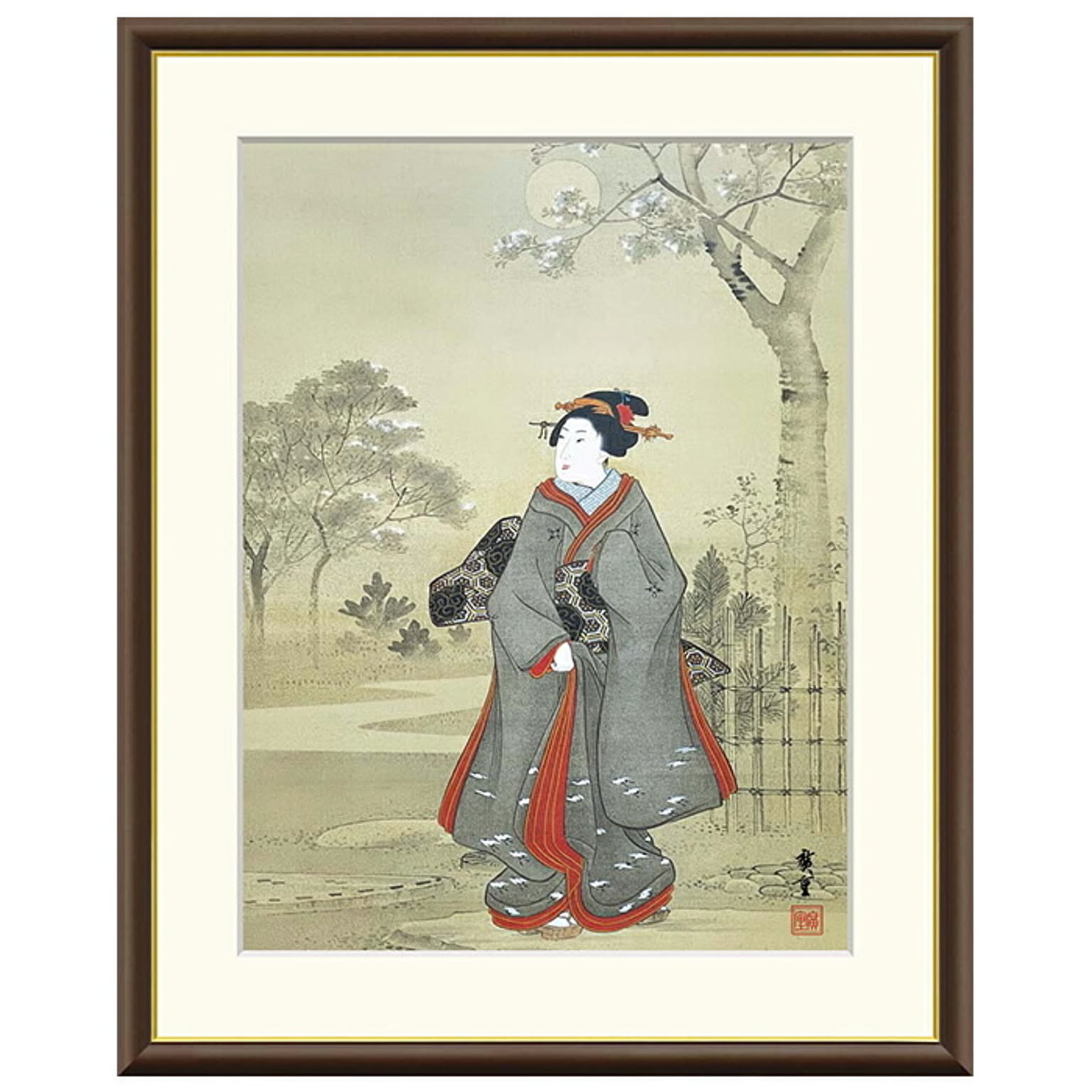 額絵 月夜観桜美人図 歌川広重 42x34cm 三幸