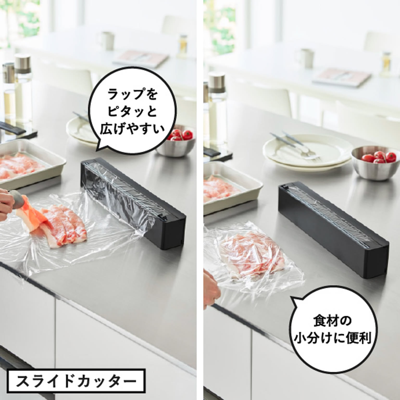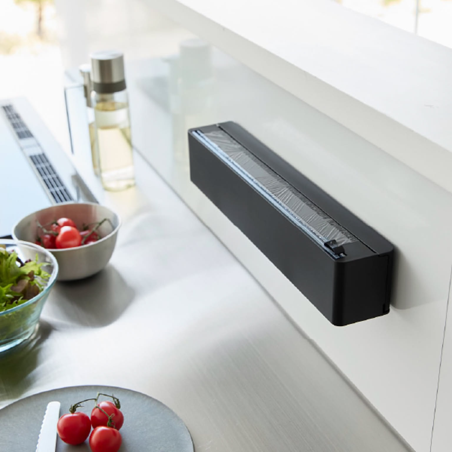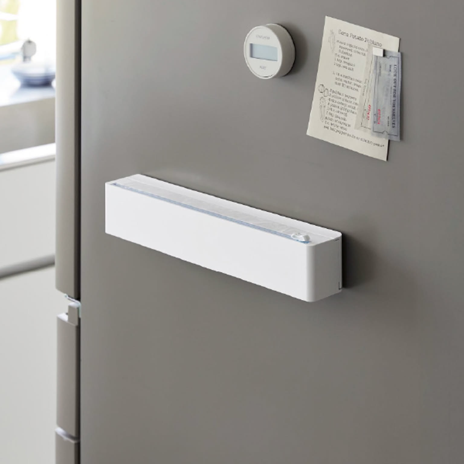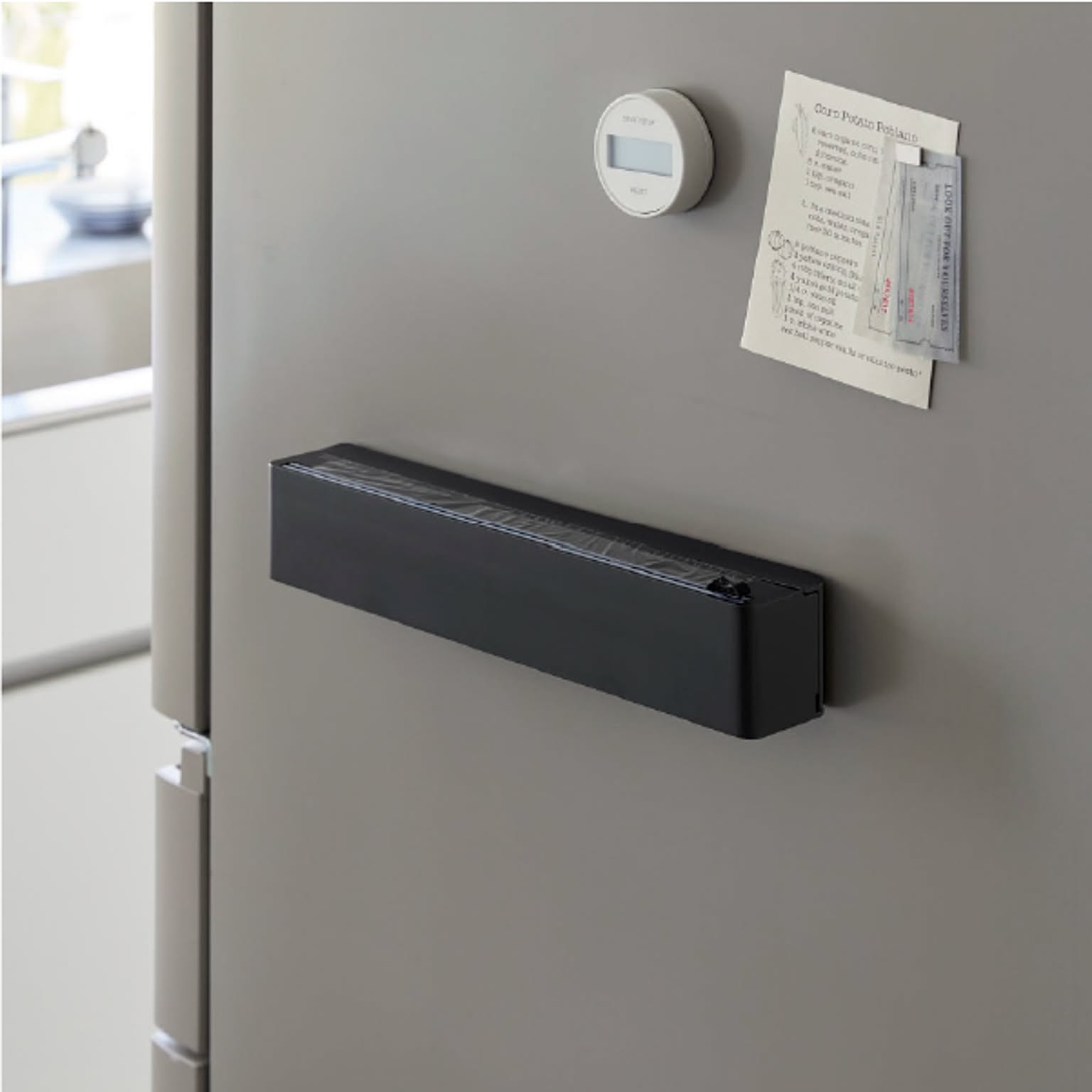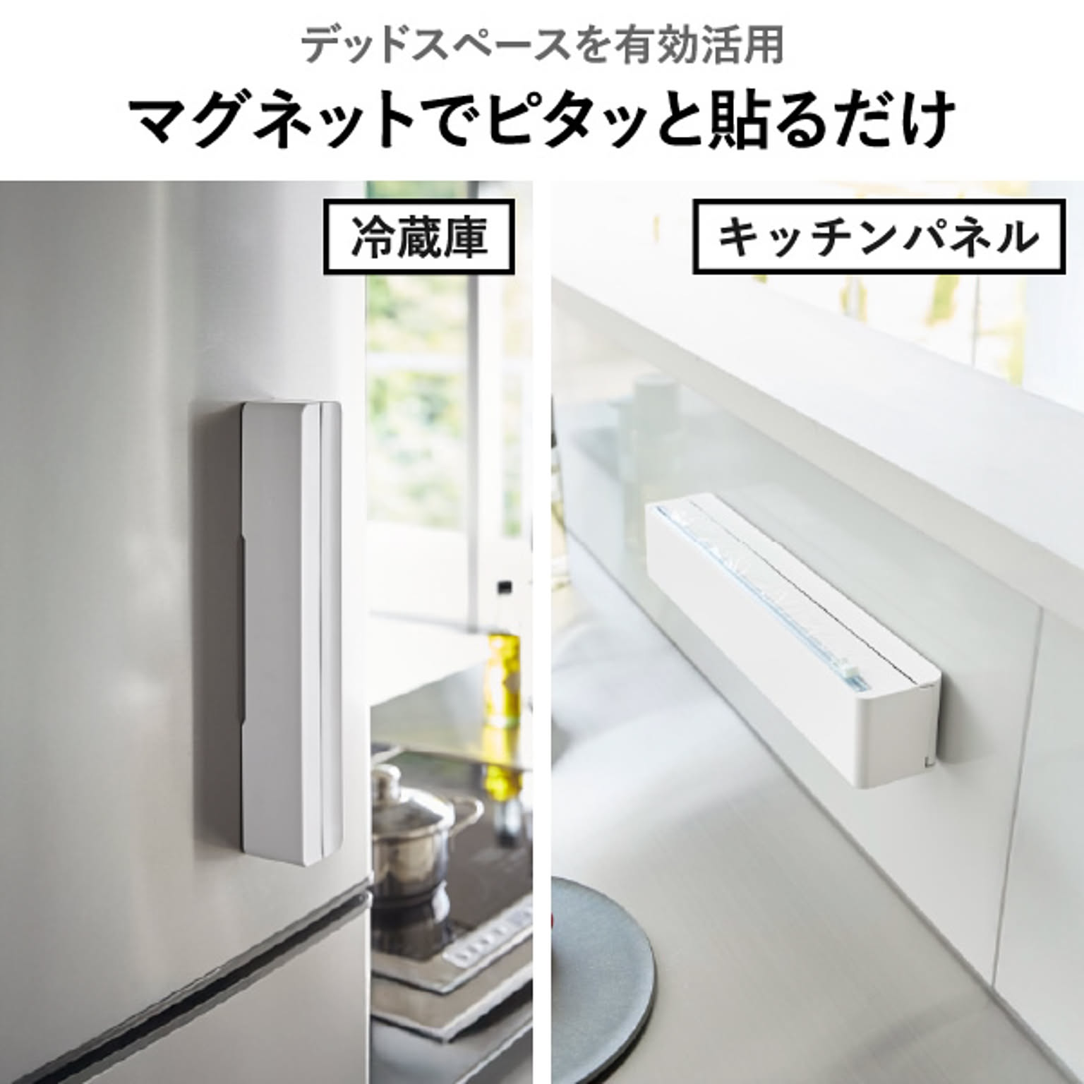 カラフルなパッケージが多く、使用頻度も高いラップは、どうしてもキッチンに生活感が出やすいアイテム。そんな悩みを解決してくれるのが、見た目と使いやすさを両立したこのラップホルダーです。市販の詰め替え用ラップをケースに入れるだけで、出しやすさが変わり、キッチン全体の印象もすっきり。マグネットで冷蔵庫やキッチンパネルなどにすっきり設置できます。ケース本体は樹脂製でお手入れも簡単。汚れてもサッと拭くだけなので、清潔に保ちやすいのも嬉しいポイントです。ラップだけでなくアルミホイルにも対応しており、消耗品をまとめて管理できるラップホルダーとして活躍します。スライドカッター付きは、スライド式の内蔵カッターで、簡単&安全にカット。左右どちらからでも使えて、切りやすさにこだわりたい方におすすめです。毎日使うものだからこそ、見た目にも使い心地にもこだわりたい。そんな方におすすめの、シンプルで機能的なラップホルダーです。マグネットで浮かせて、使いやすく、暮らしをすっきり整えてみませんか。