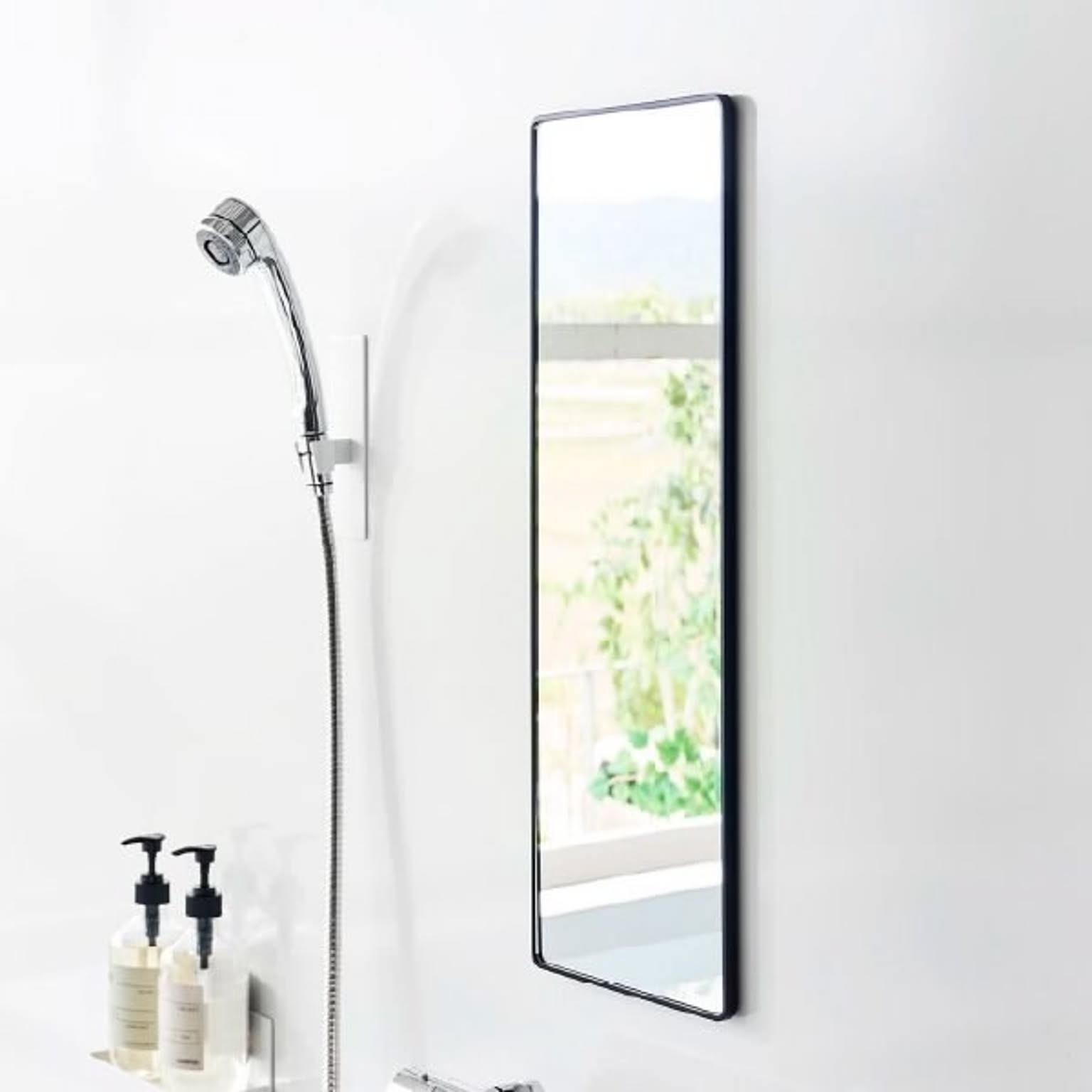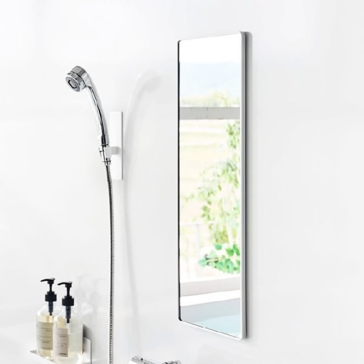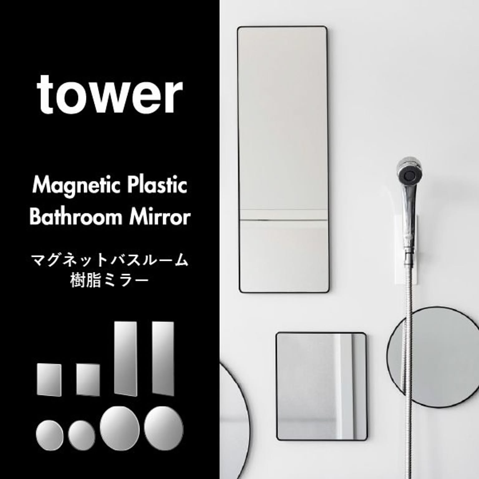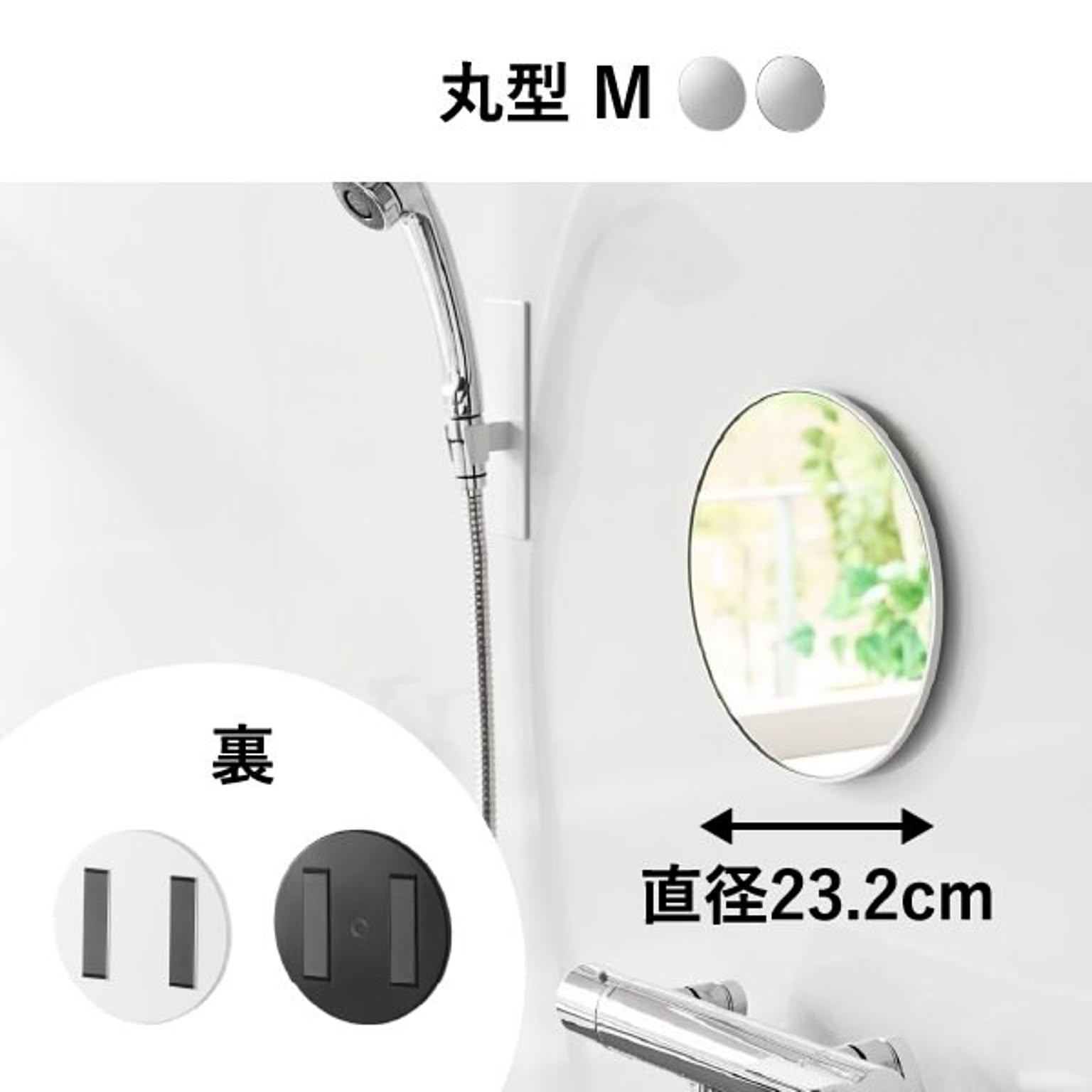 浴室壁面に設置できる、towerシリーズのおしゃれなマグネットバスミラーです。背面の強力な磁石で、風呂鏡をしっかり固定できます。マグネットバスミラーには滑り止めが付いているため、ずり落ちにくくストレスフリー。風呂鏡は、落としても割れにくい樹脂製です。ガラスミラーに比べて衝撃に強く、割れにくいのが特徴。万が一破損しても飛散しにくく、ケガのリスクが低いため、小さなお子様のいるご家庭でも安心してご使用いただける風呂鏡です。厚さは6mmと、薄手の樹脂ミラーに比べて歪みが出にくく、映りが安定している点もポイントです。バスルームの雰囲気に合わせて、角型と丸型の2種類からマグネットバスミラーのデザインをお選びいただけます。風呂鏡のサイズは、それぞれMサイズとLサイズをご用意しました。マグネットバスミラーには曇り止めフィルム加工が施されており、浴室内でも快適にご使用いただけます。風呂鏡のフレームに指を掛けて簡単に取り外せるので、お掃除の際の移動もスムーズ。日常的に使いやすいよう設計されたマグネットバスミラーで、いつでも清潔なバスルームを保てます。モノトーンのシンプルなデザインも魅力。角型の風呂鏡は洗練された印象を与える定番デザイン、丸型の風呂鏡は柔らかくあたたかみのあるデザインです。ガラスのような見た目でありながら割れにくく、浴室に適したマグネットバスミラー。山崎実業 タワーシリーズの割れにくい姿見や壁掛け全身鏡をお探しの方にもおすすめです。機能性とデザイン性を兼ね備えたマグネットバスミラーで、上質なバスタイムを。