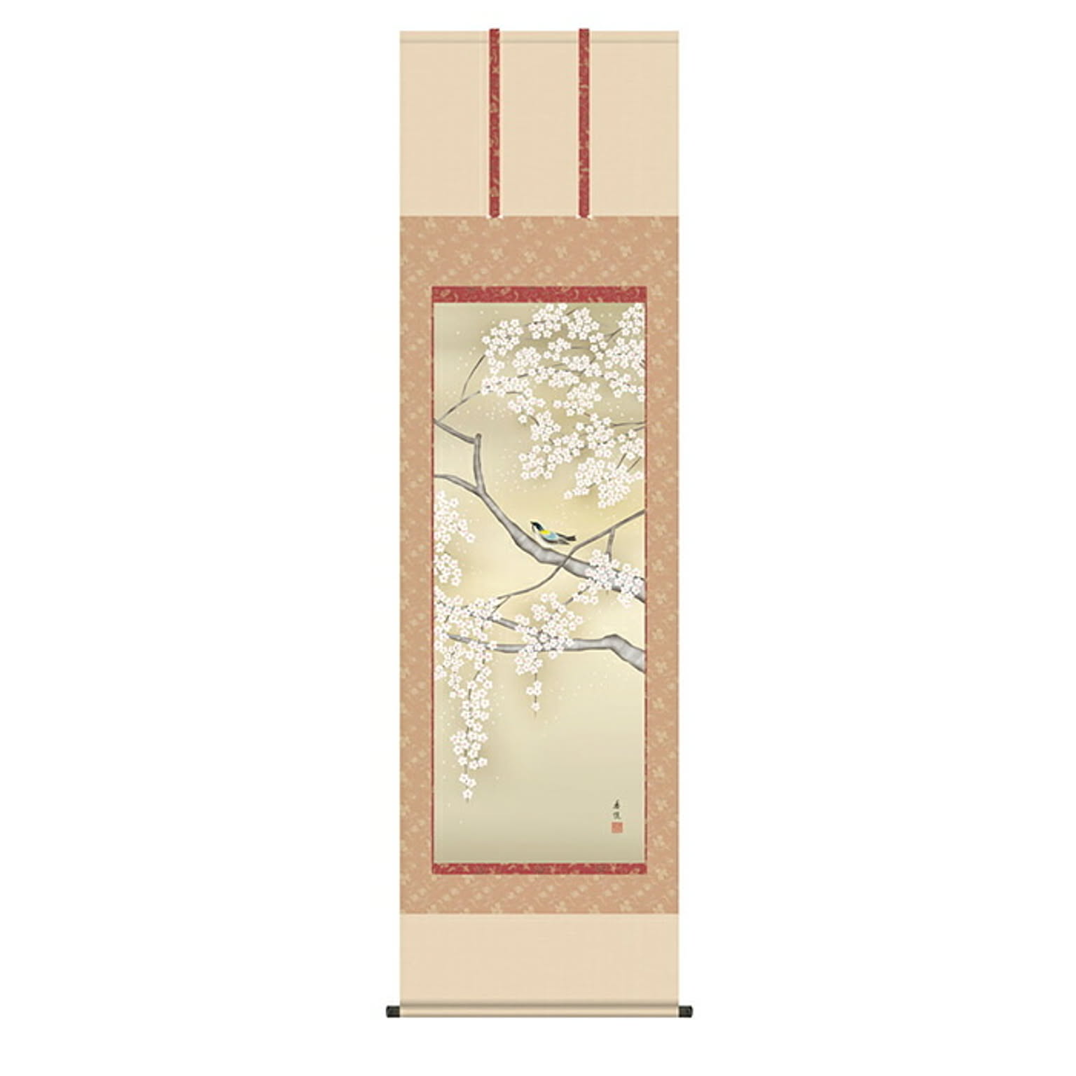 掛け軸 桜花に小鳥 西尾香悦 54.5x190cm 三幸