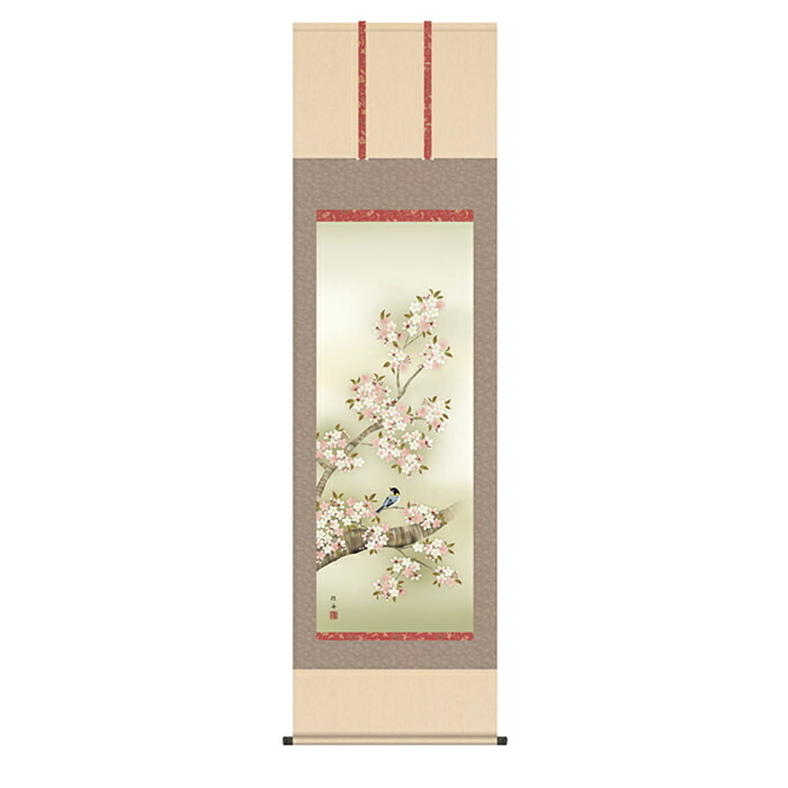 掛け軸 桜花に小鳥 長江桂舟 54.5x190cm 三幸