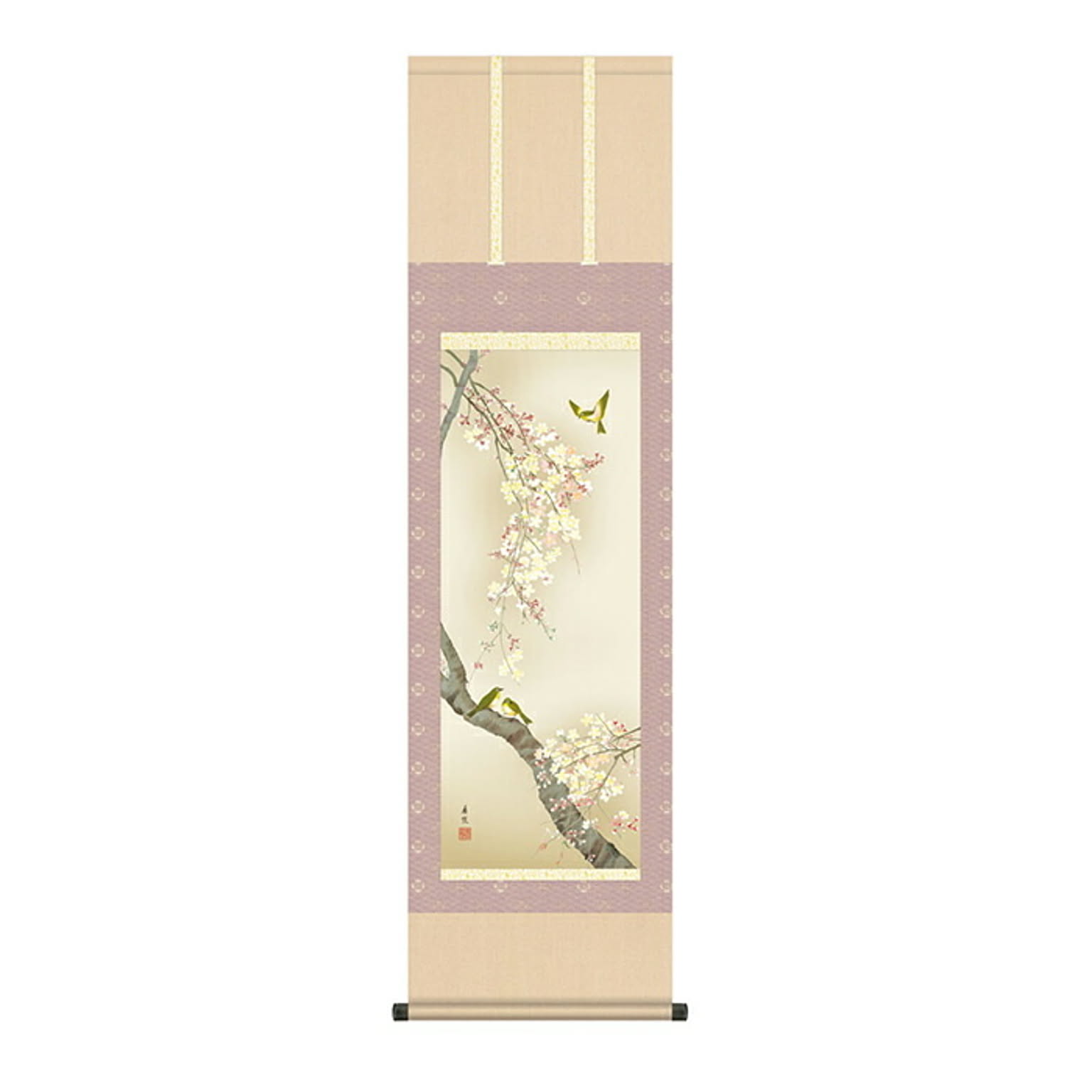 掛け軸 桜花に小鳥 西尾香悦 44.5x164cm 三幸