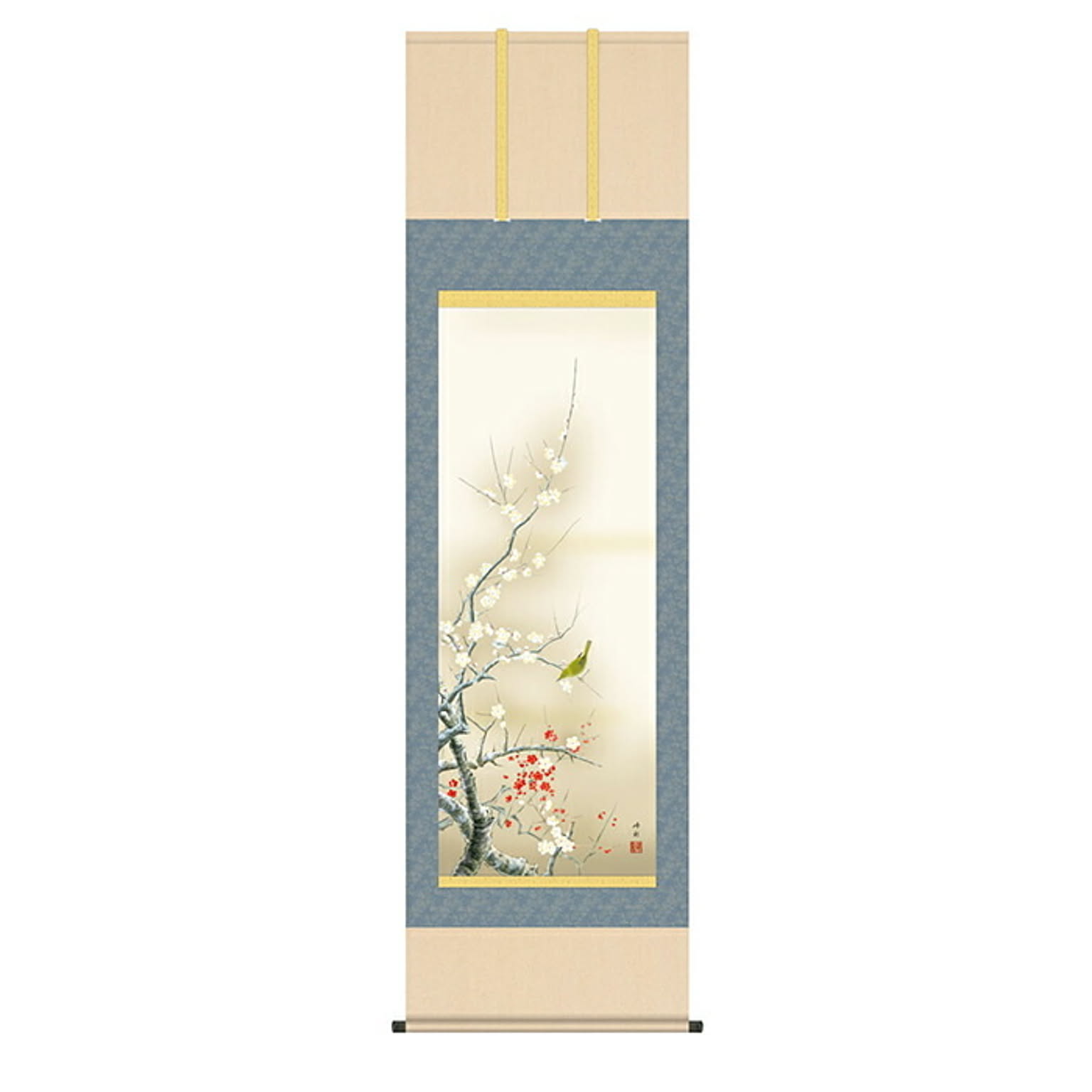 掛け軸 紅白梅に鶯 園田峰彩 54.5x190cm 三幸