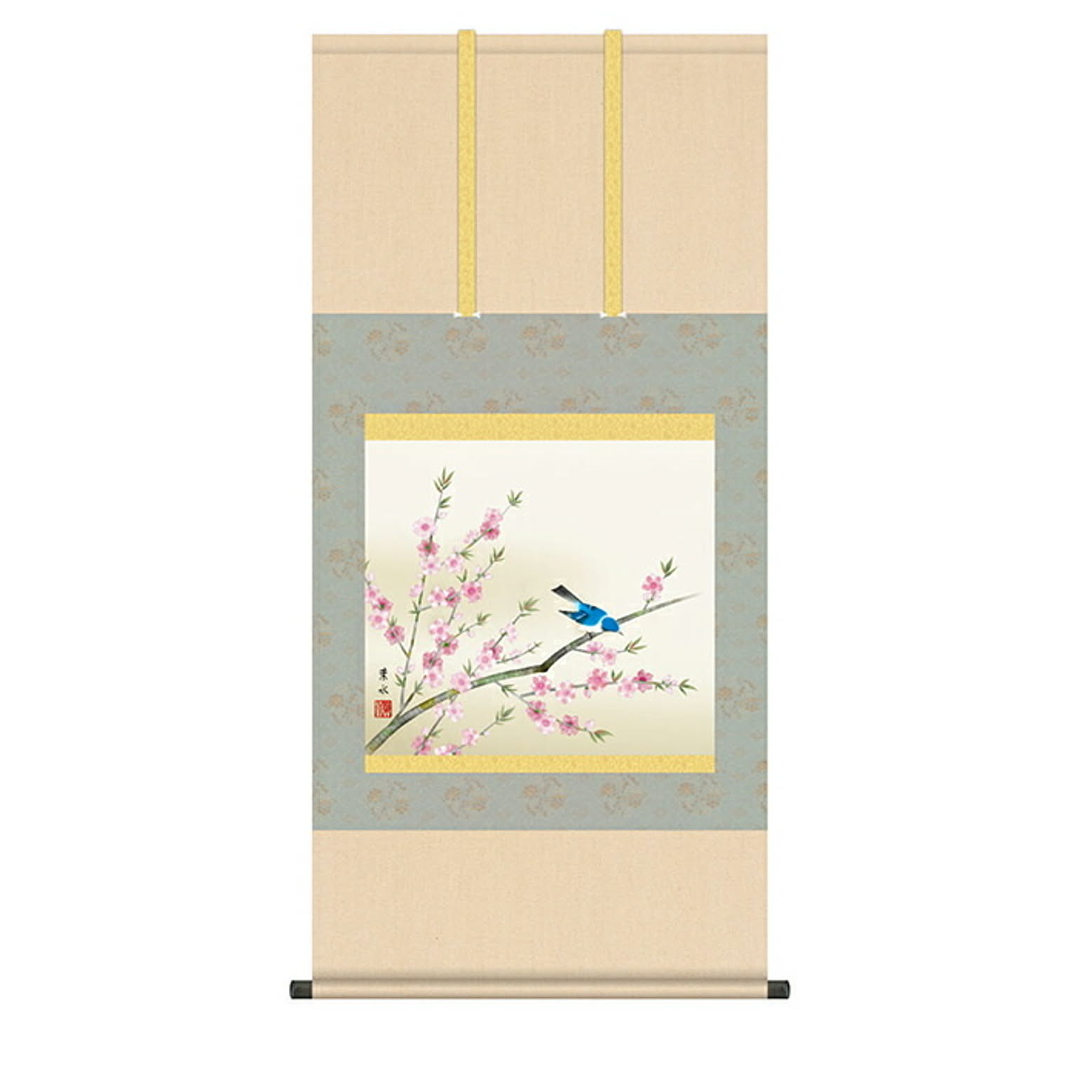 掛け軸 桃花に小鳥 緒方葉水 54.5x115cm 三幸