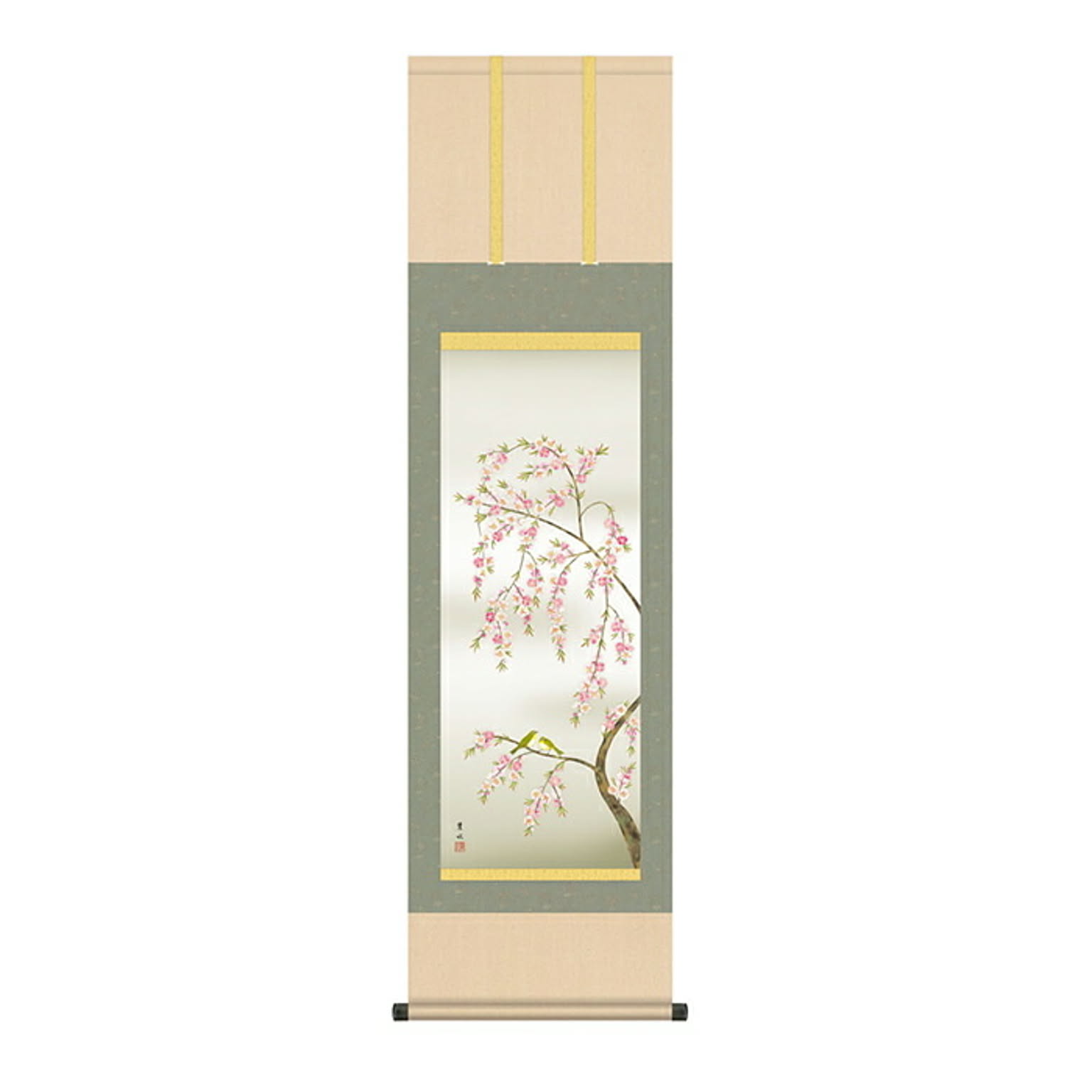 掛け軸 桃花に小鳥 緒方葉水 44.5x164cm 三幸