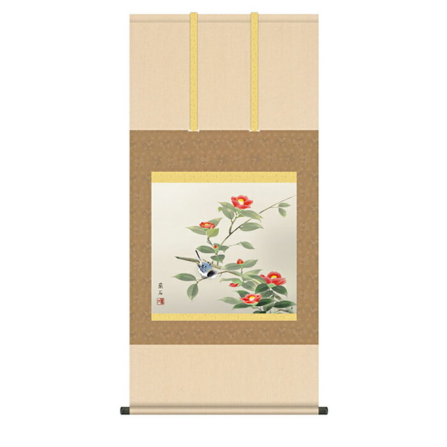掛け軸 椿に小鳥 高見蘭石 54.5x115cm 三幸