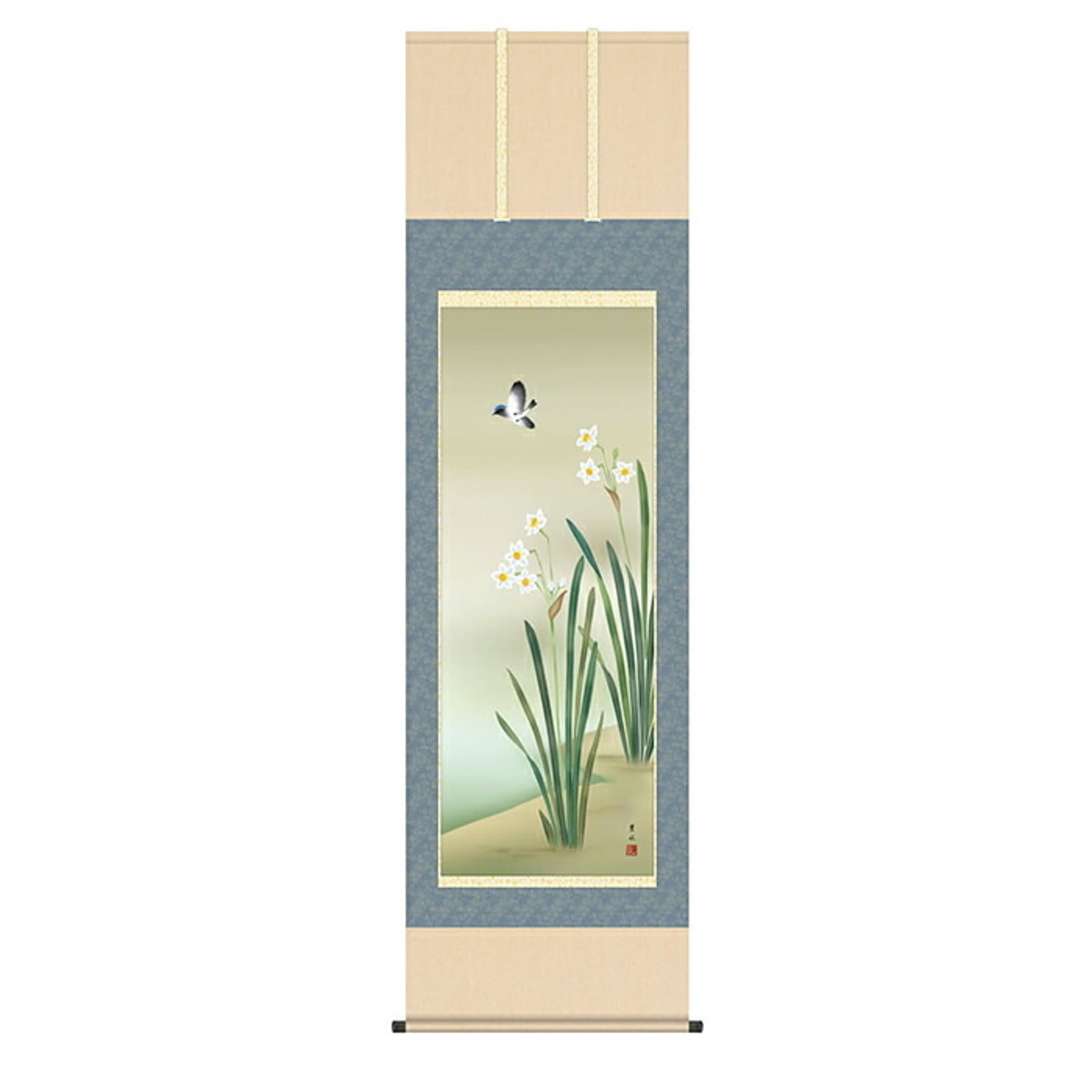 掛け軸 水仙に小鳥 緒方葉水 54.5x190cm 三幸