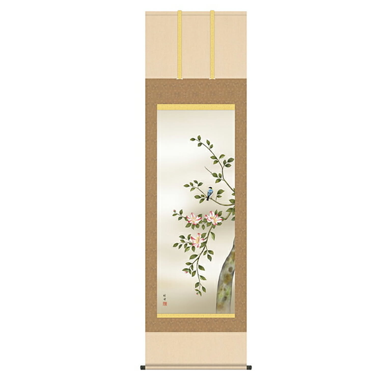 掛け軸 山茶花に小鳥 田村竹世 54.5x190cm 三幸