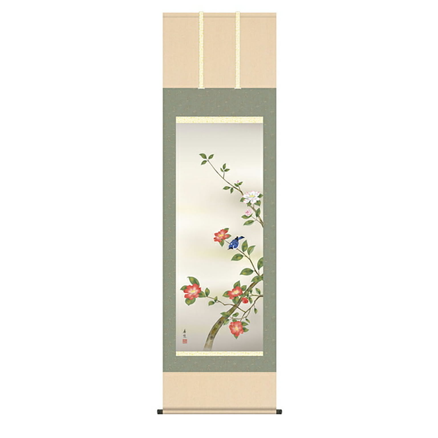 掛け軸 山茶花に小鳥 西尾香悦 54.5x190cm 三幸