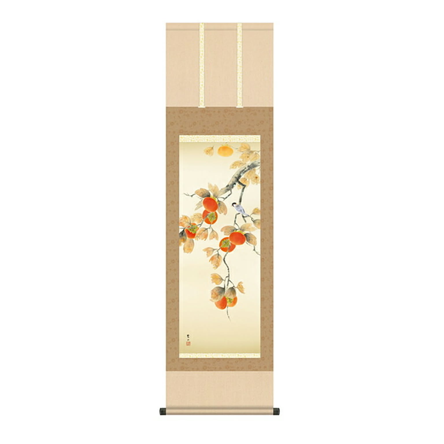掛け軸 柿に小鳥 唐沢碧山 44.5x164cm 三幸