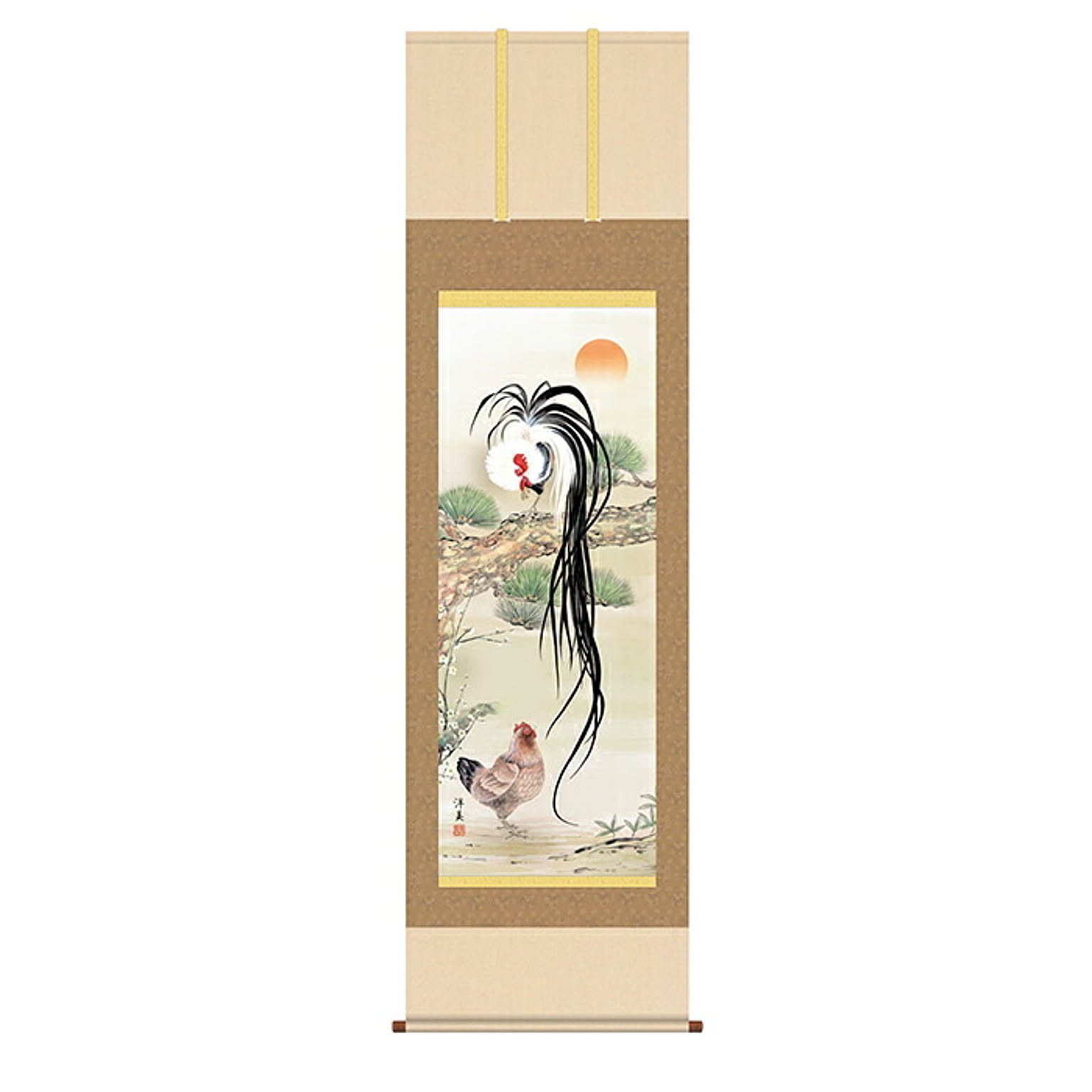 掛け軸 松竹梅双鶏図 打田洋美 44.5x164cm 三幸