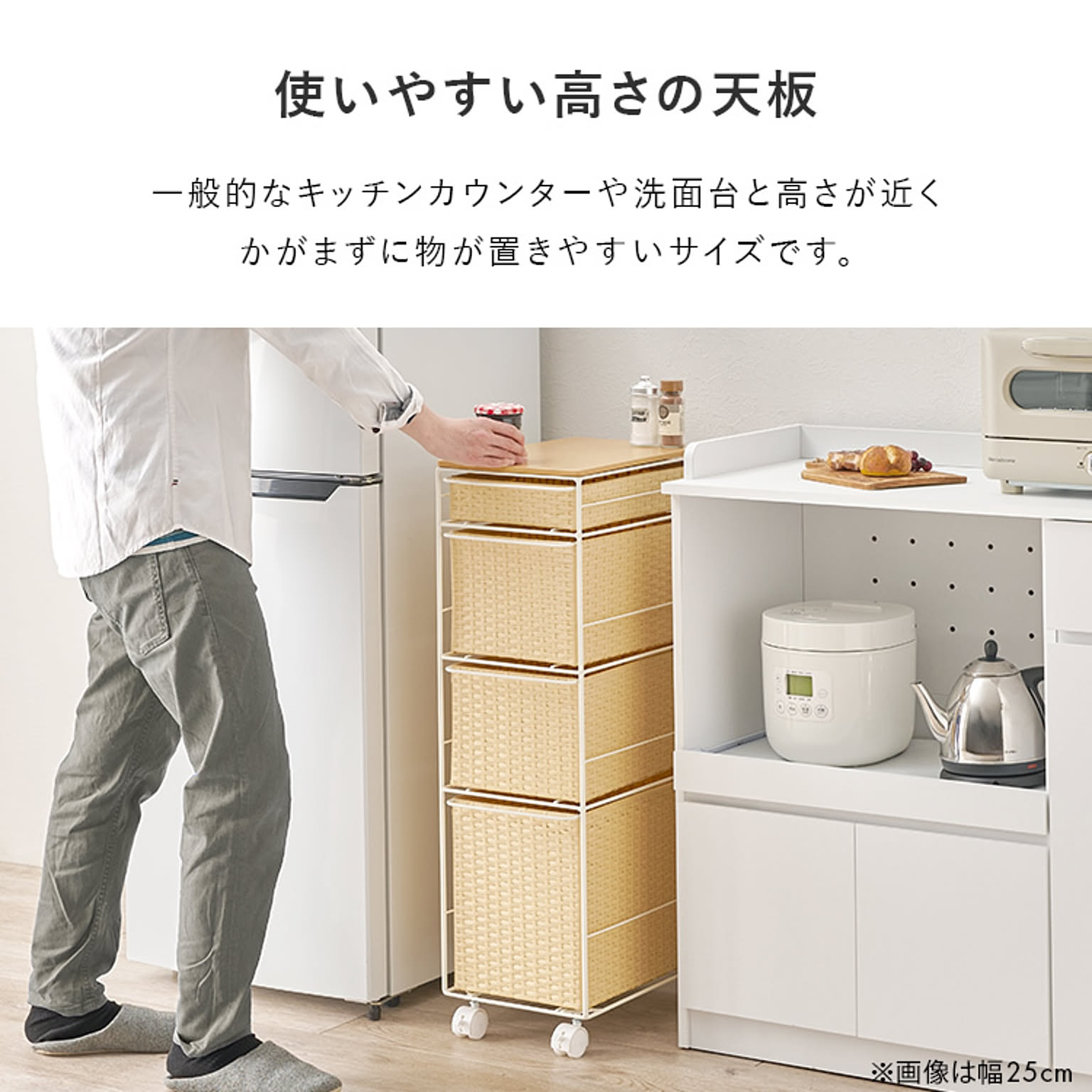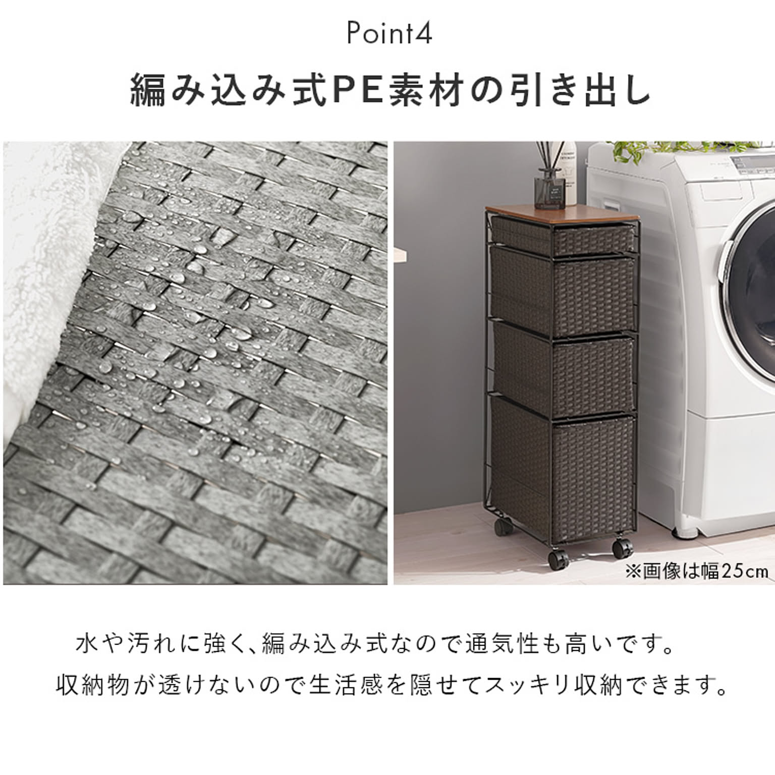 ランドリースペースやキッチンの隙間で使えるチェスト。 樹脂素材を編んだ引出しは水や汚れに強く通気性も抜群。 ★お客様組立★ ●商品サイズ(cm) 幅約20×奥行約40×高さ約85 ●商品重量 約6.5kg ●材質 フレーム:スチール 天板:天然木化粧繊維板 引出し:ポリエチレン ●組立の有無 有り ●組立時間 5分