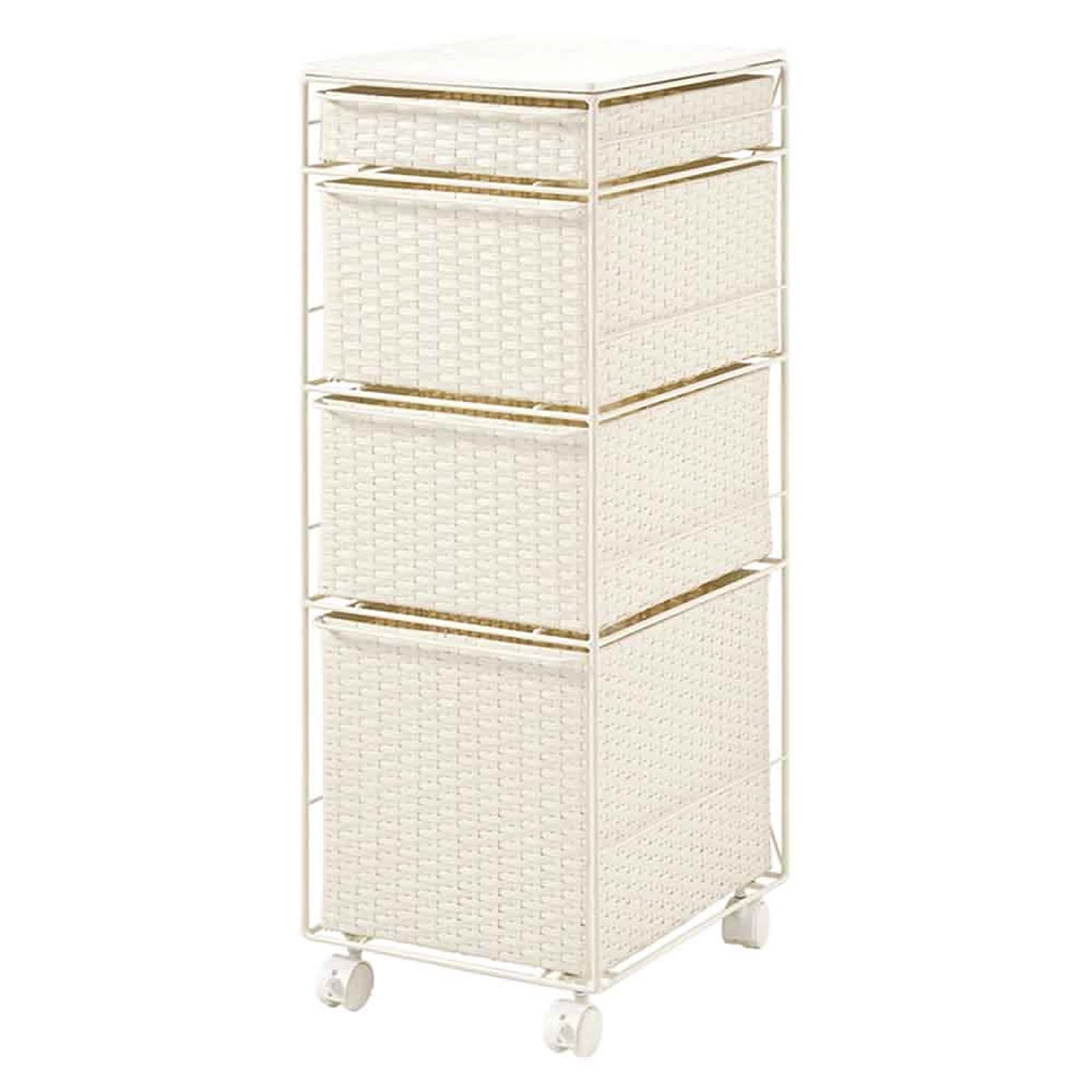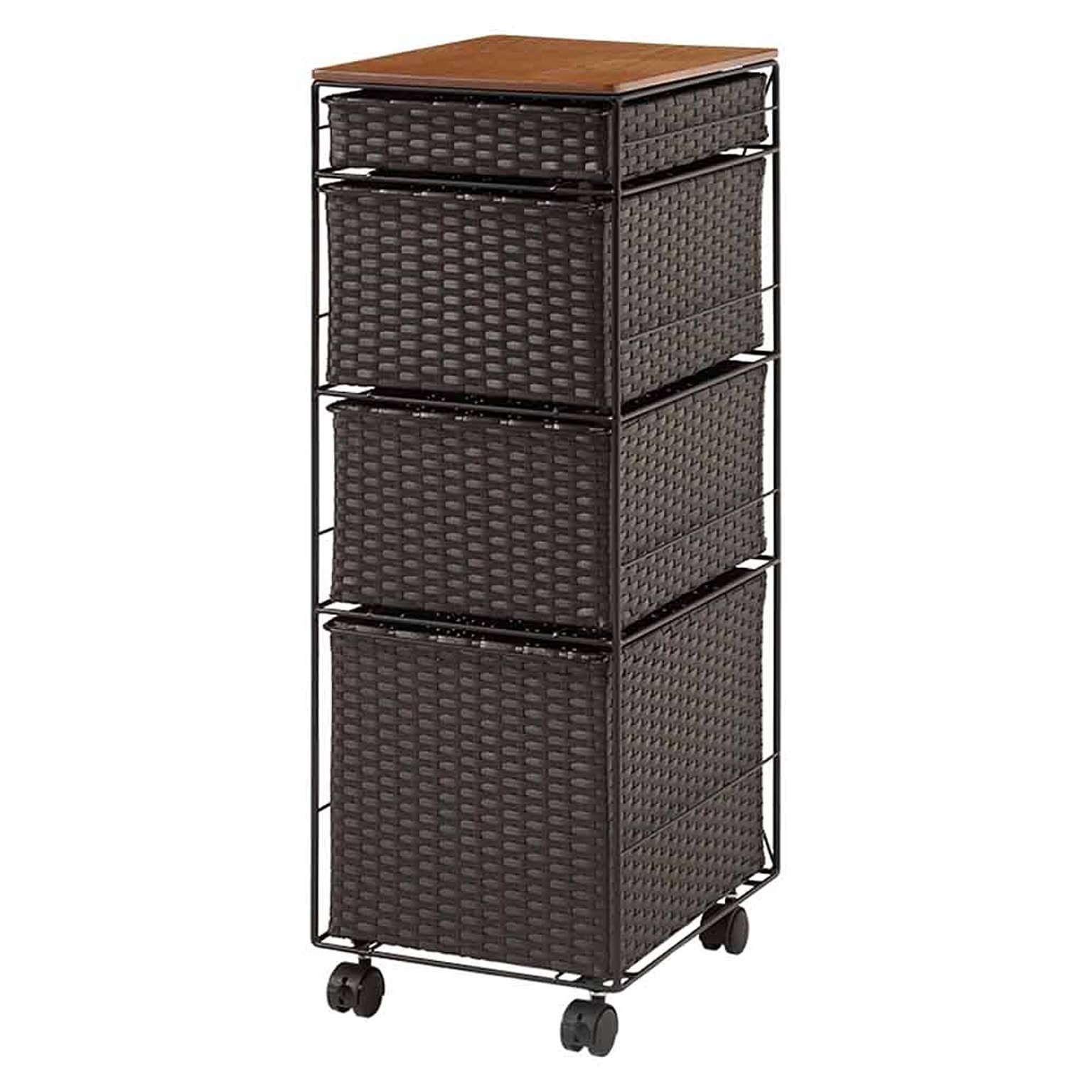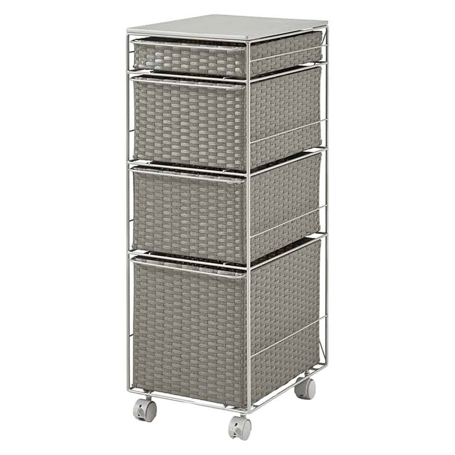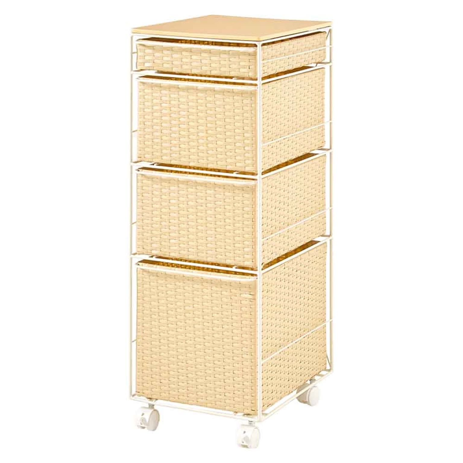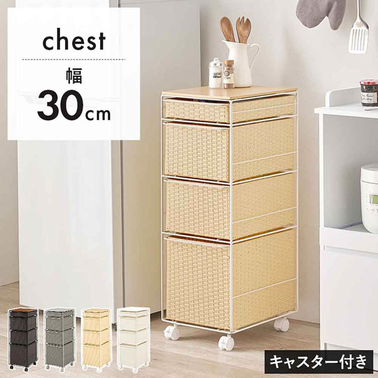 ランドリースペースやキッチンの隙間で使えるチェスト。 樹脂素材を編んだ引出しは水や汚れに強く通気性も抜群。 ★お客様組立★ ●商品サイズ(cm) 幅約30×奥行約40×高さ約85 ●商品重量 約8kg ●材質 フレーム:スチール 天板:天然木化粧繊維板 引出し:ポリエチレン ●組立の有無 有り ●組立時間 5分