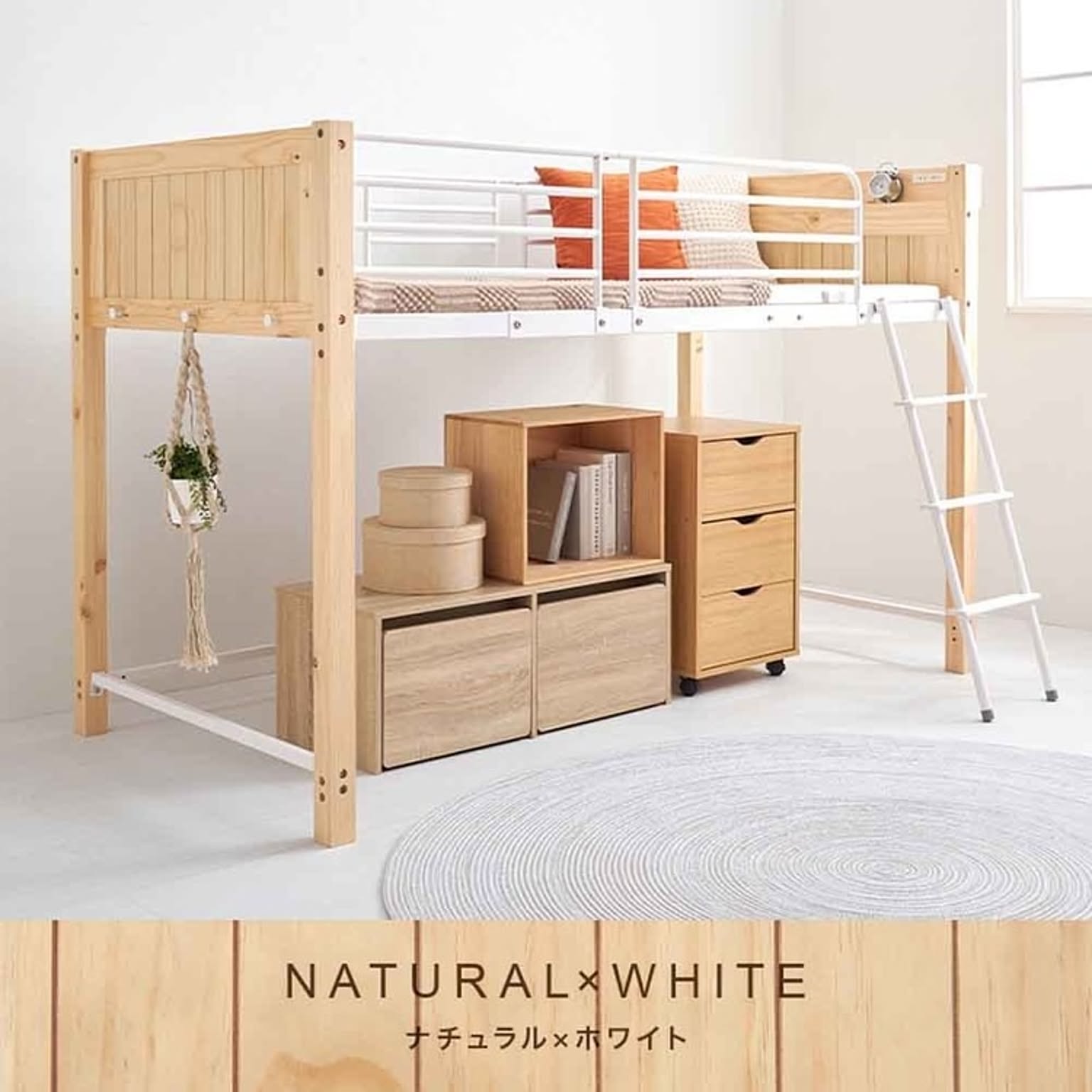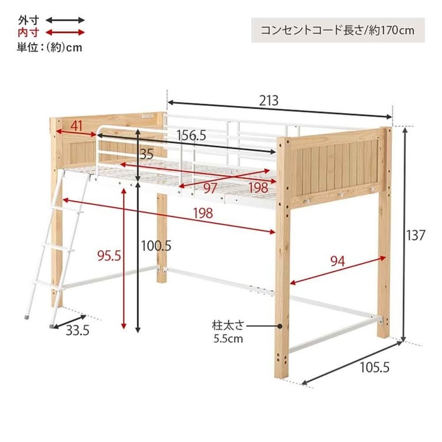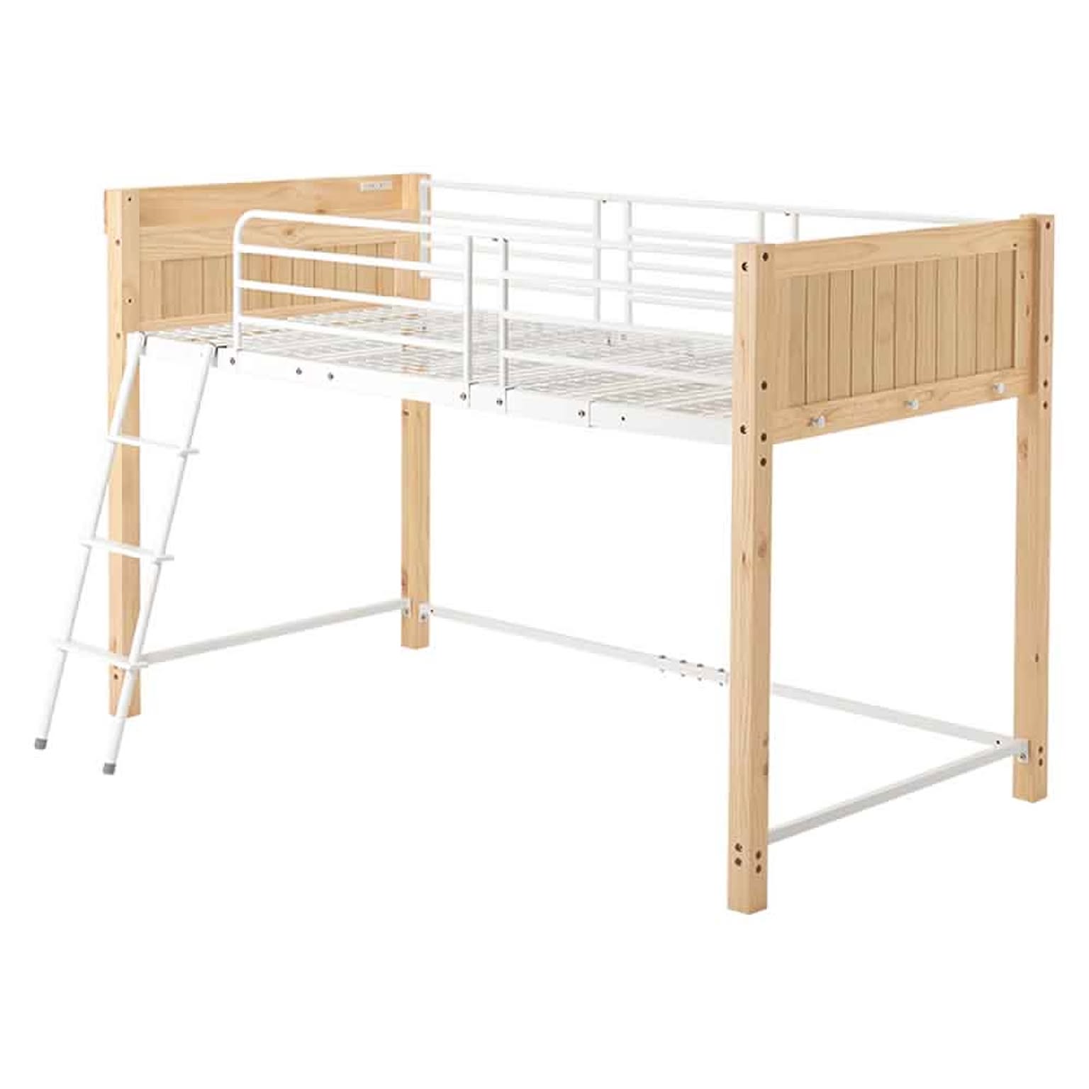 天然木とスチールを合わせたデザイン。 ロフトベッドとしては低めの設計なので圧迫感が少なく上り下りもしやすい高さです。 ★お客様組立★ ※こちらの商品はお取り寄せ商品のため、初期不良以外の返品・交換は承れませんので、あらかじめご了承ください。 ●商品サイズ(cm) 幅約105.5×奥行約213×高さ約137 ●商品重量 約50kg ●主材 パイン・スチール ●組立の有無 有り ●組立時間 180分(2名)