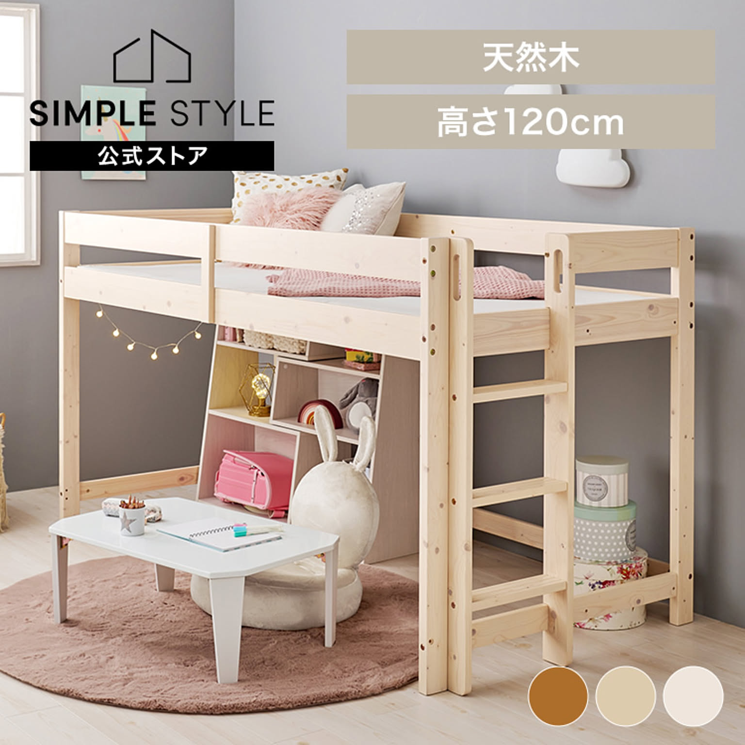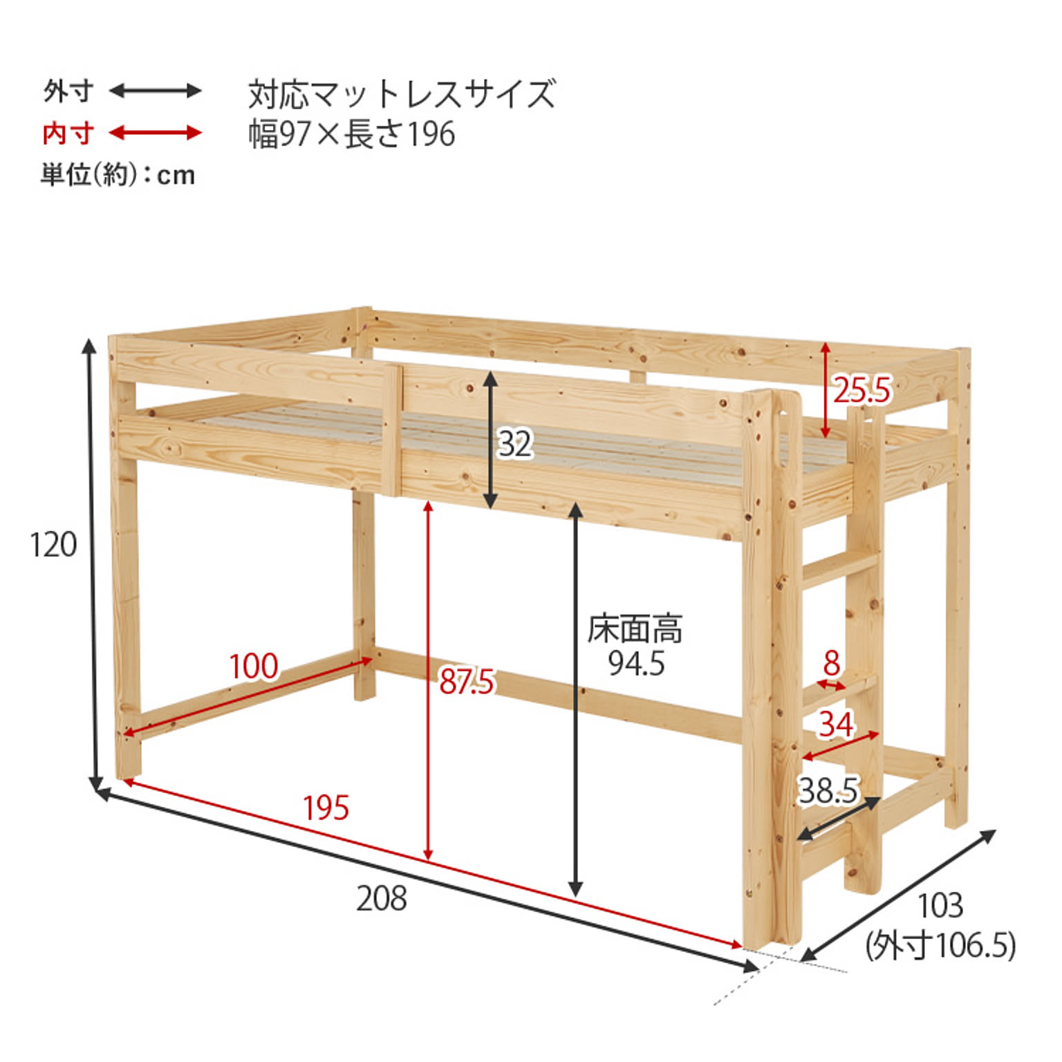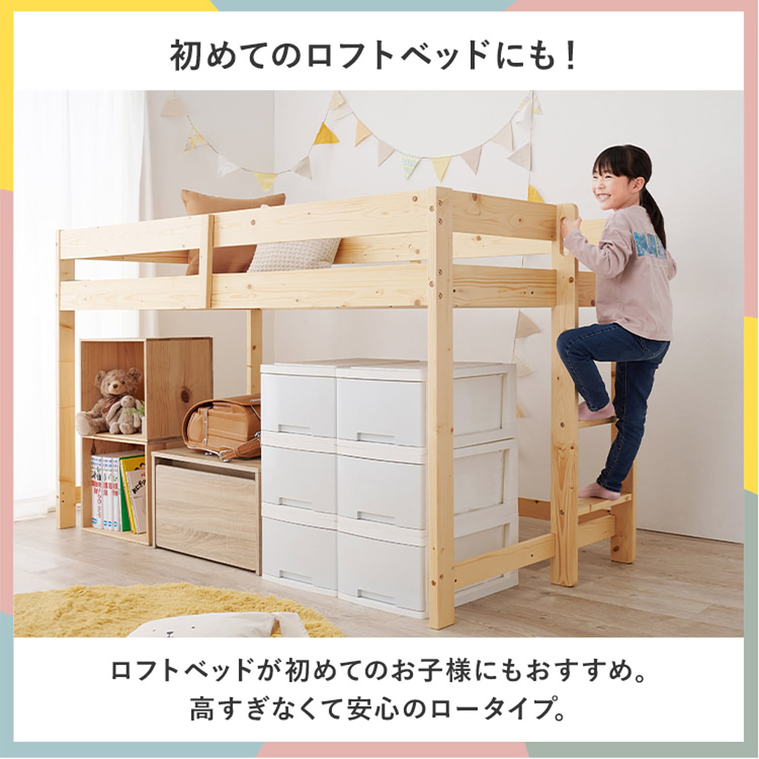 高さ120cmと低めなロフトベッド。 床面下の収納も使いやすい省スペースな垂直のハシゴタイプです。 ★お客様組立★ ※こちらの商品はお取り寄せ商品のため、初期不良以外の返品・交換は承れませんので、あらかじめご了承ください。 ●商品サイズ(cm) 幅約106.5×奥行約208×高さ約120 ●商品重量 約35kg ●材質 主材:パイン スノコ:合板(LVL) ●組立の有無 有り ●組立時間 120分(2名)