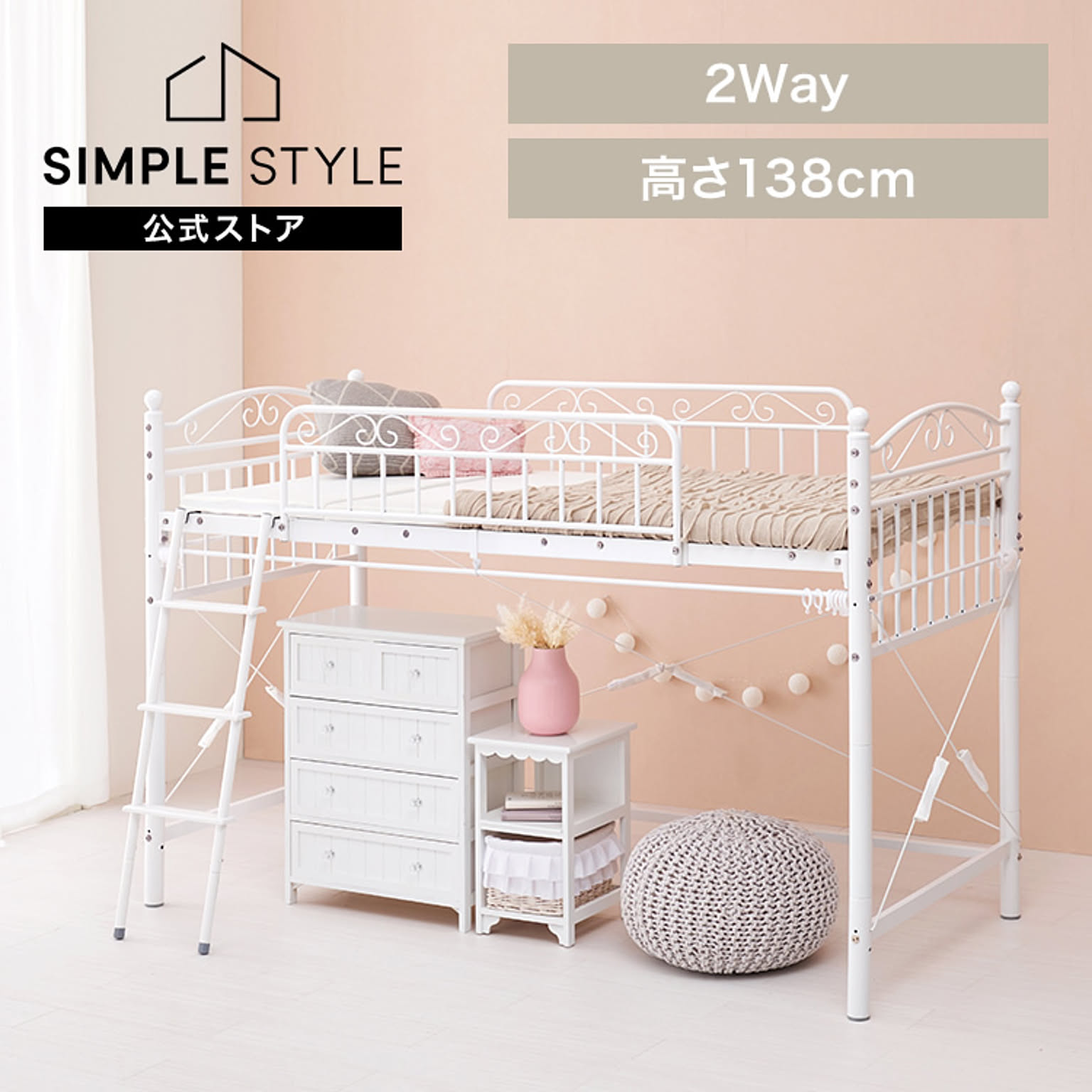 まるでプリンセスが住むお城のようなエレガントなデザインのパイプロフトベッドです。 市販のカーテンを取り付けて使え、小物などの収納スペースも確保できるロータイプ。 ★お客様組立★ ※こちらの商品はお取り寄せ商品のため、初期不良以外の返品・交換は承れませんので、あらかじめご了承ください。 ●商品サイズ(cm) 幅約97×奥行約210×高さ約138 ●商品重量 約51kg ●主材 スチールパイプ ●組立の有無 有り ●組立時間 180分(2名)