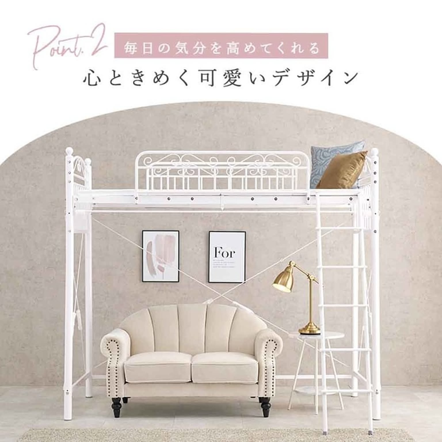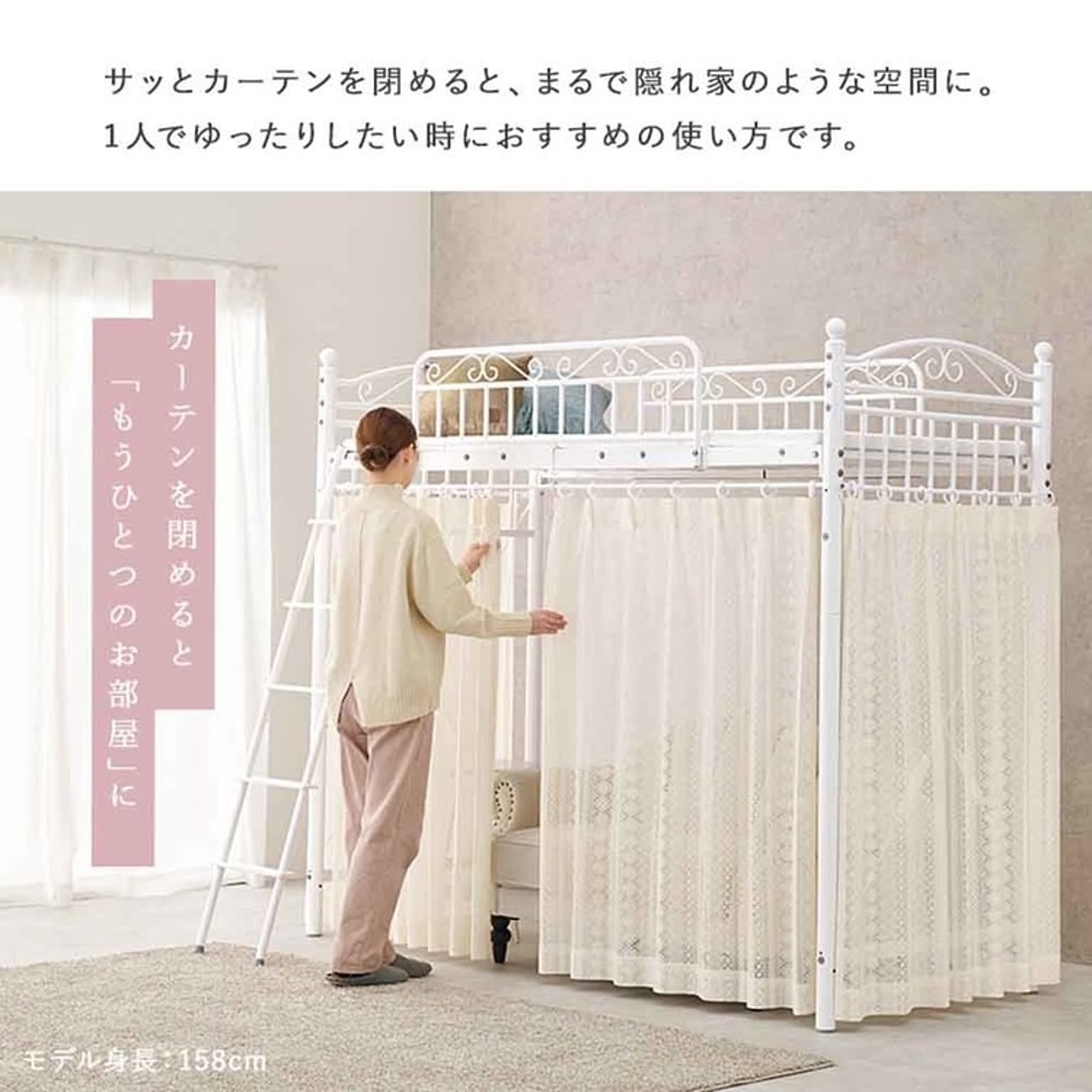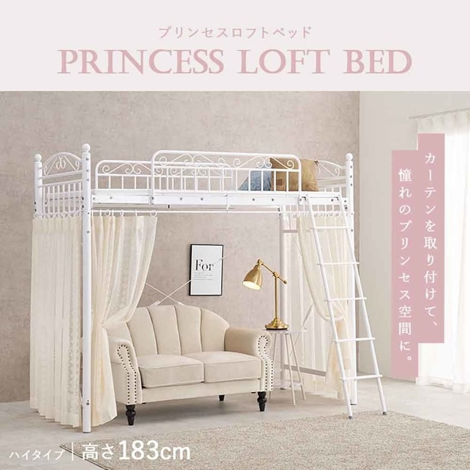 まるでプリンセスが住むお城のようなエレガントなデザインのパイプロフトベッドです。 市販のカーテンを取り付けて使え、好きなものに囲まれた憧れの空間を作れるハイタイプ。 ★お客様組立★ ※こちらの商品はお取り寄せ商品のため、初期不良以外の返品・交換は承れませんので、あらかじめご了承ください。 ●商品サイズ(cm) 幅約97×奥行約210×高さ約183 ●商品重量 約51kg ●主材 スチールパイプ ●組立の有無 有り ●組立時間 180分(2名)