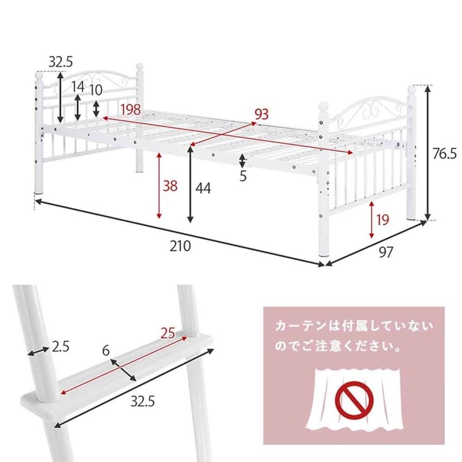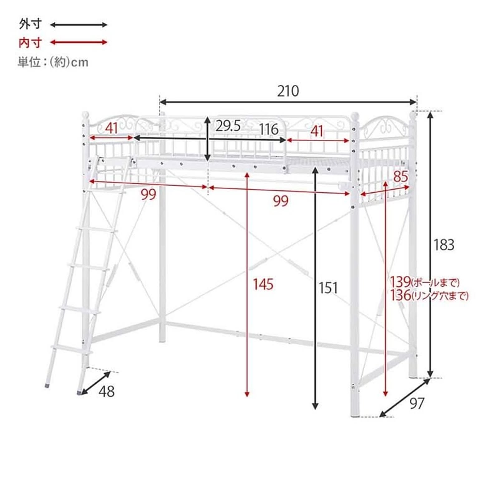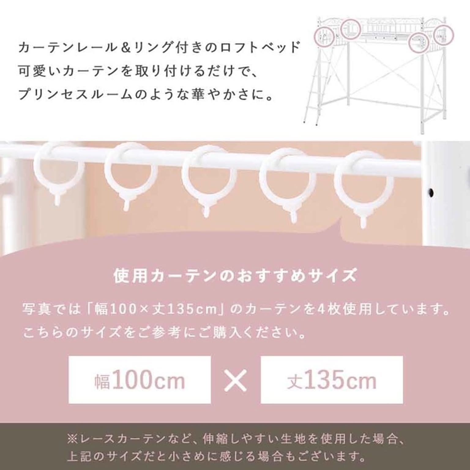 まるでプリンセスが住むお城のようなエレガントなデザインのパイプロフトベッドです。 市販のカーテンを取り付けて使え、好きなものに囲まれた憧れの空間を作れるハイタイプ。 ★お客様組立★ ※こちらの商品はお取り寄せ商品のため、初期不良以外の返品・交換は承れませんので、あらかじめご了承ください。 ●商品サイズ(cm) 幅約97×奥行約210×高さ約183 ●商品重量 約51kg ●主材 スチールパイプ ●組立の有無 有り ●組立時間 180分(2名)