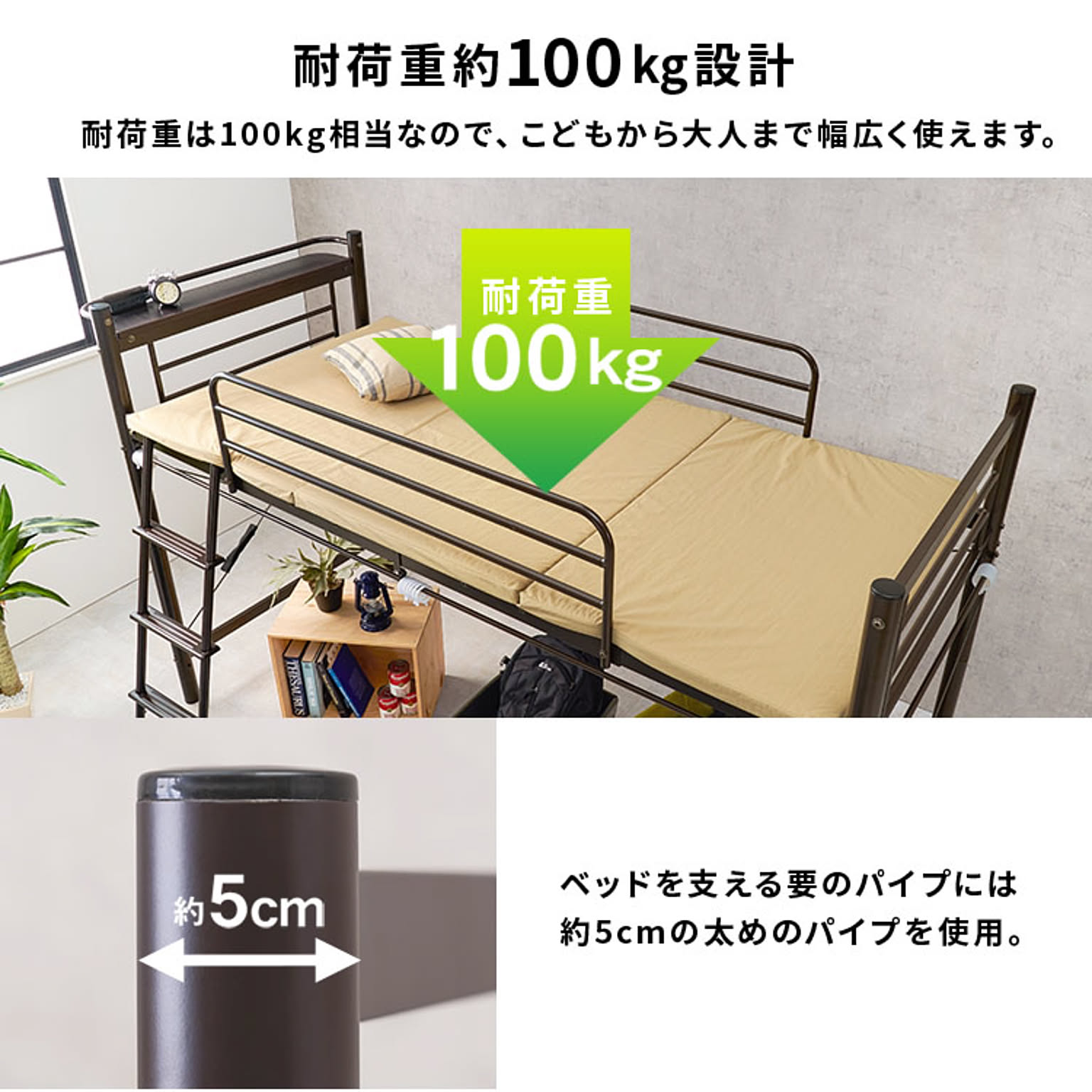 ベッド下の空間に市販のカーテンを取り付け可能なパイプロフトベッド。 ハンガーポールもついているので衣類収納としても活躍。 床面が高すぎず、小物などの収納スペースも確保できるロータイプ。 ★お客様組立★ ※こちらの商品はお取り寄せ商品のため、初期不良以外の返品・交換は承れませんので、あらかじめご了承ください。 ●商品サイズ(cm) 幅約97×奥行約220×高さ約139/77.5 ●商品重量 約54kg ●主材 スチールパイプ ●組立の有無 有り ●組立時間 180分(2名)