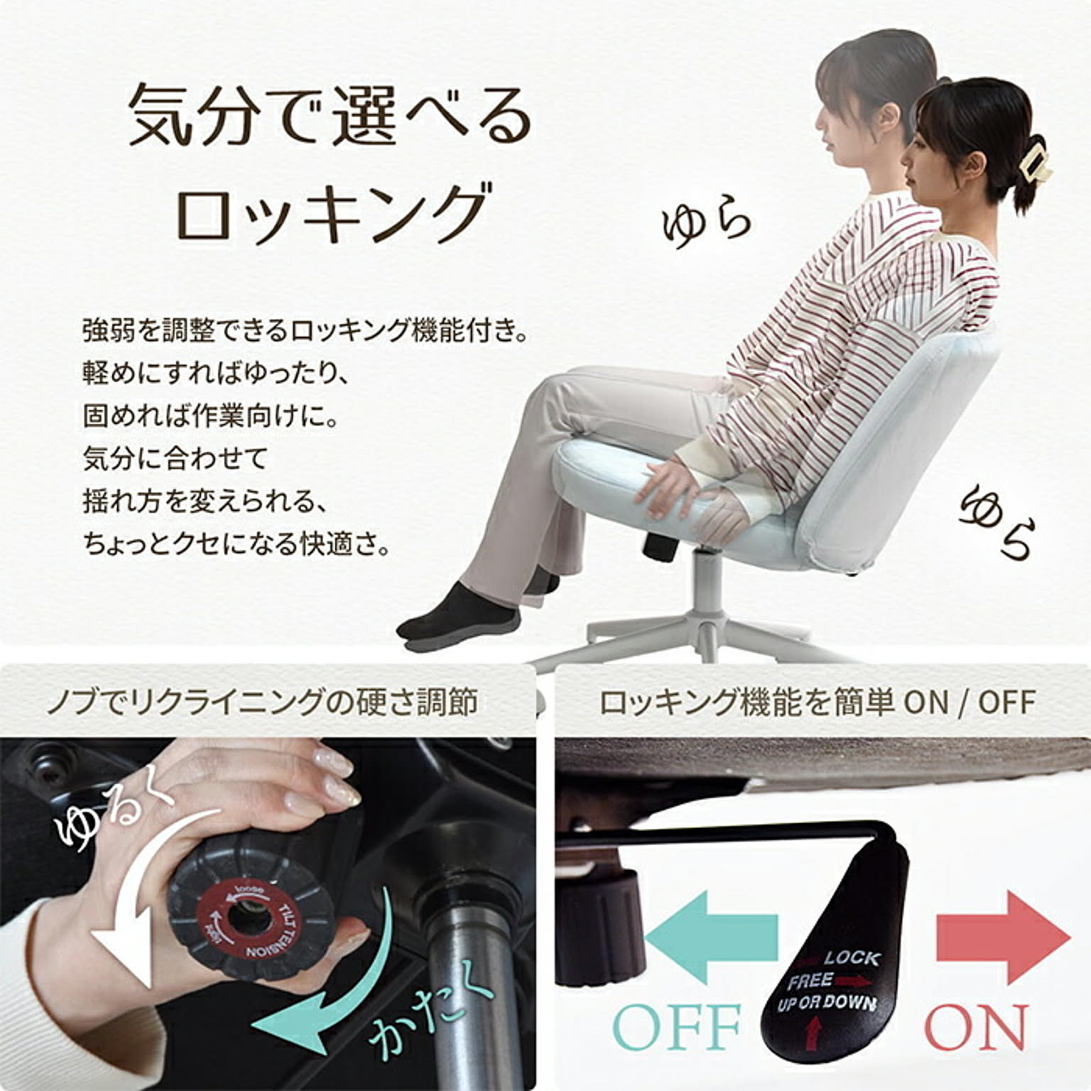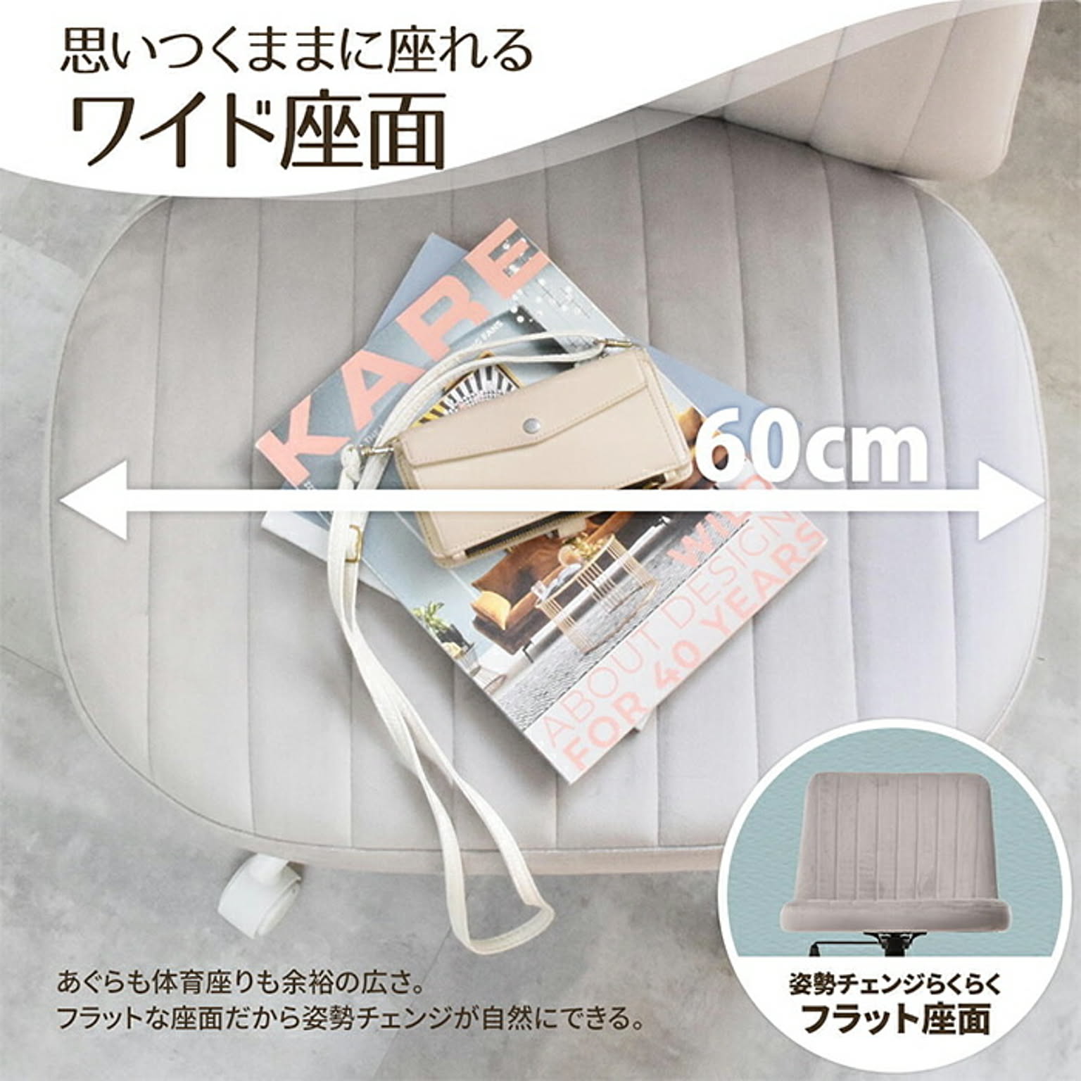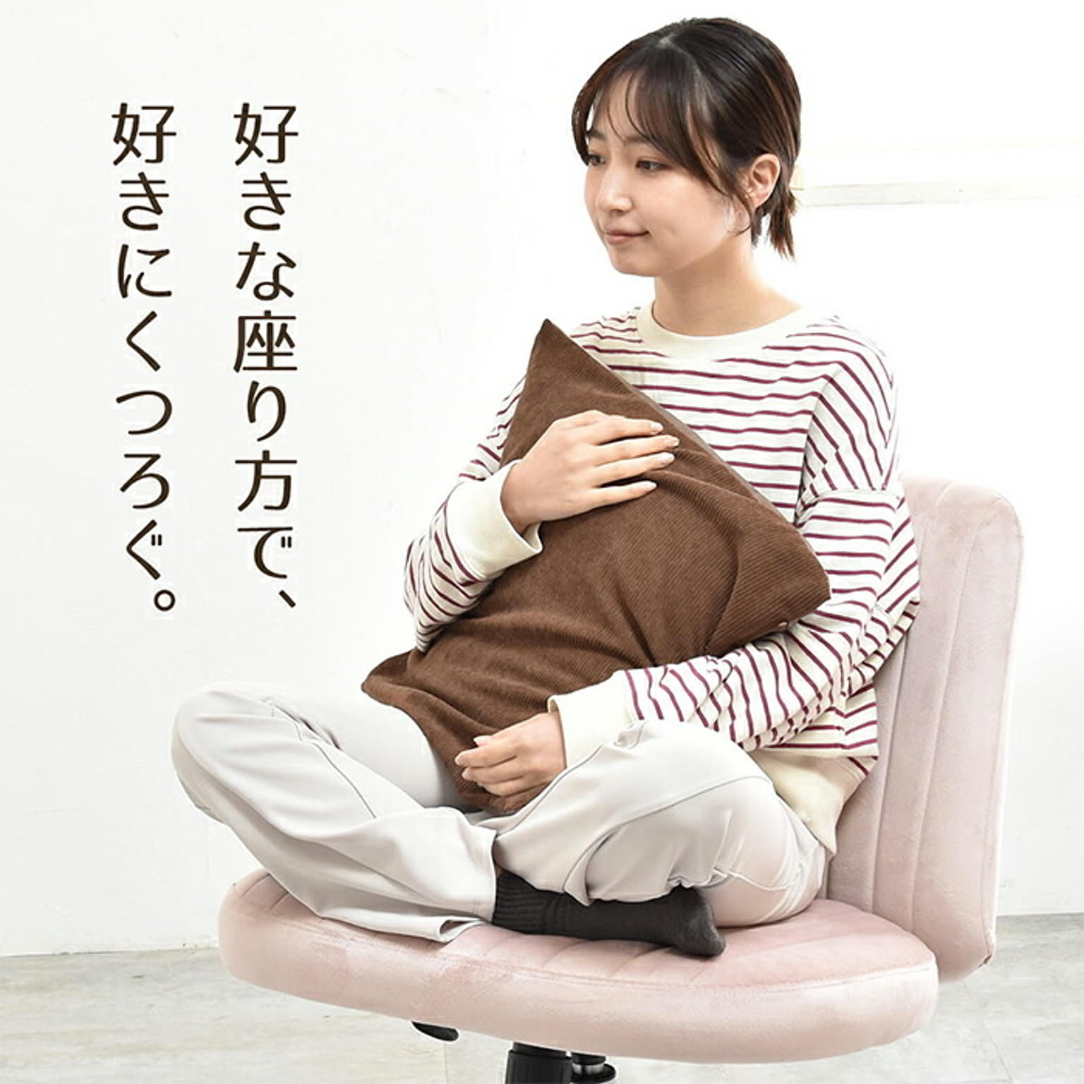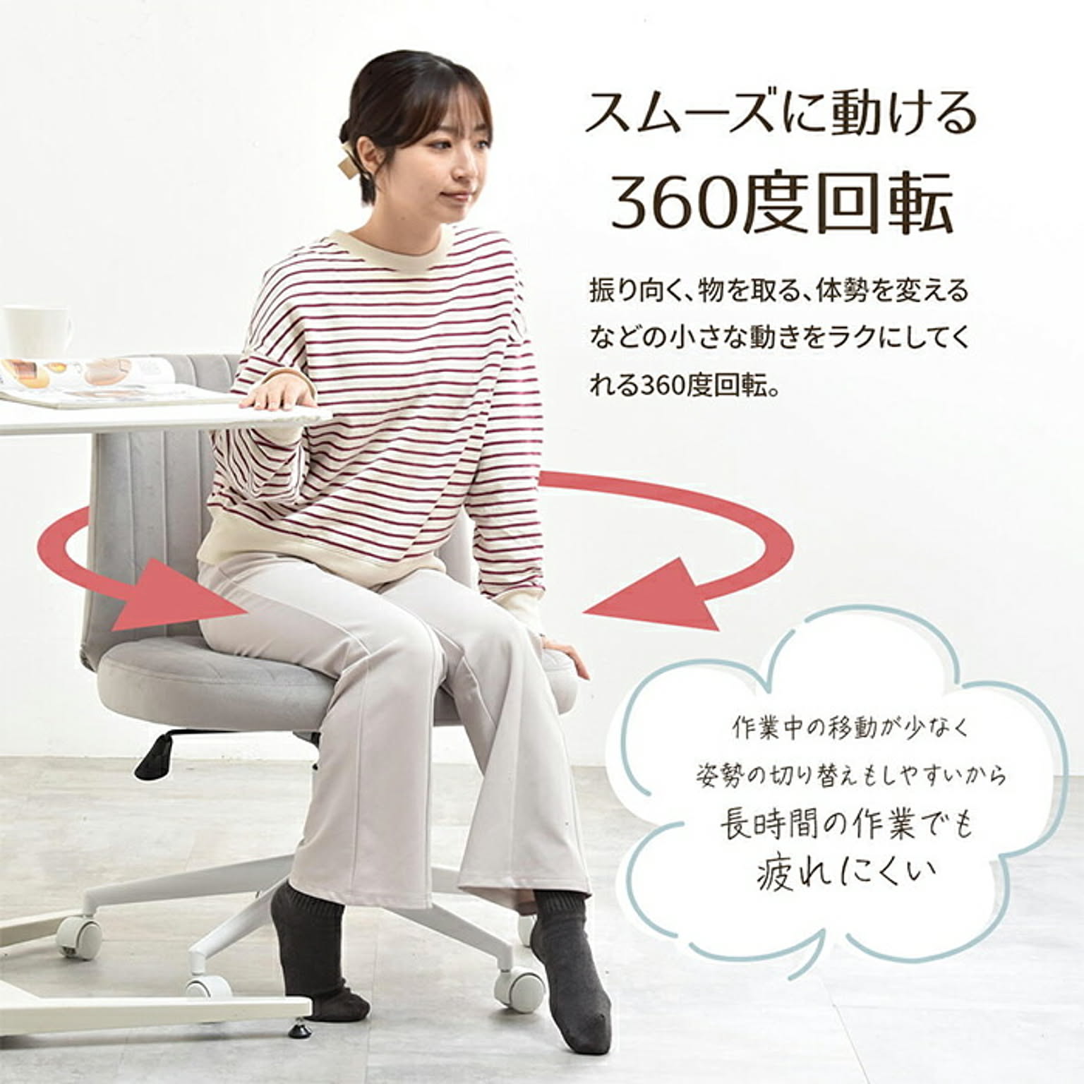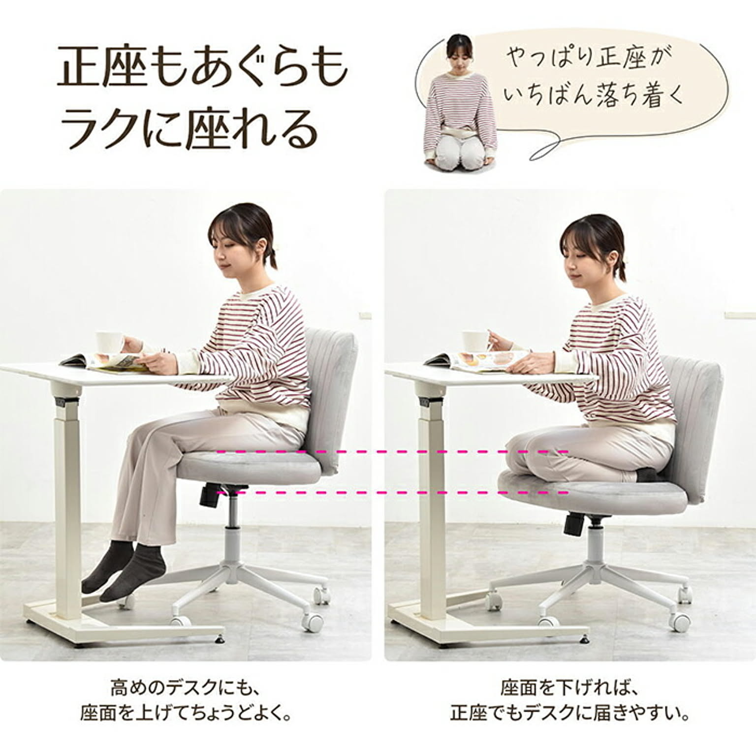 あぐらチェア PPITは、あぐらをかいたり足を投げ出したり、自由な姿勢で座れる新しいタイプのワークチェアです。長時間デスクに向かうときでも体勢を変えやすく、腰や足の負担を軽減しながら、自然と集中力をキープできます。