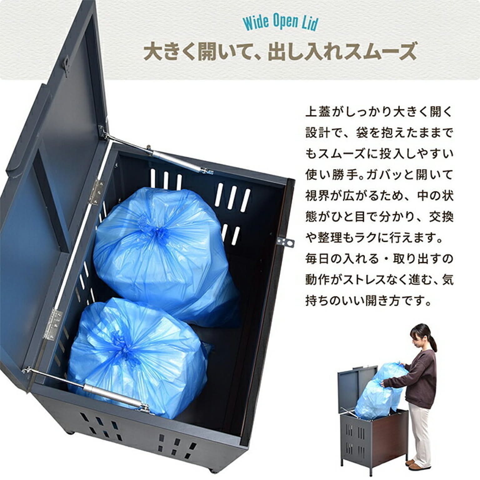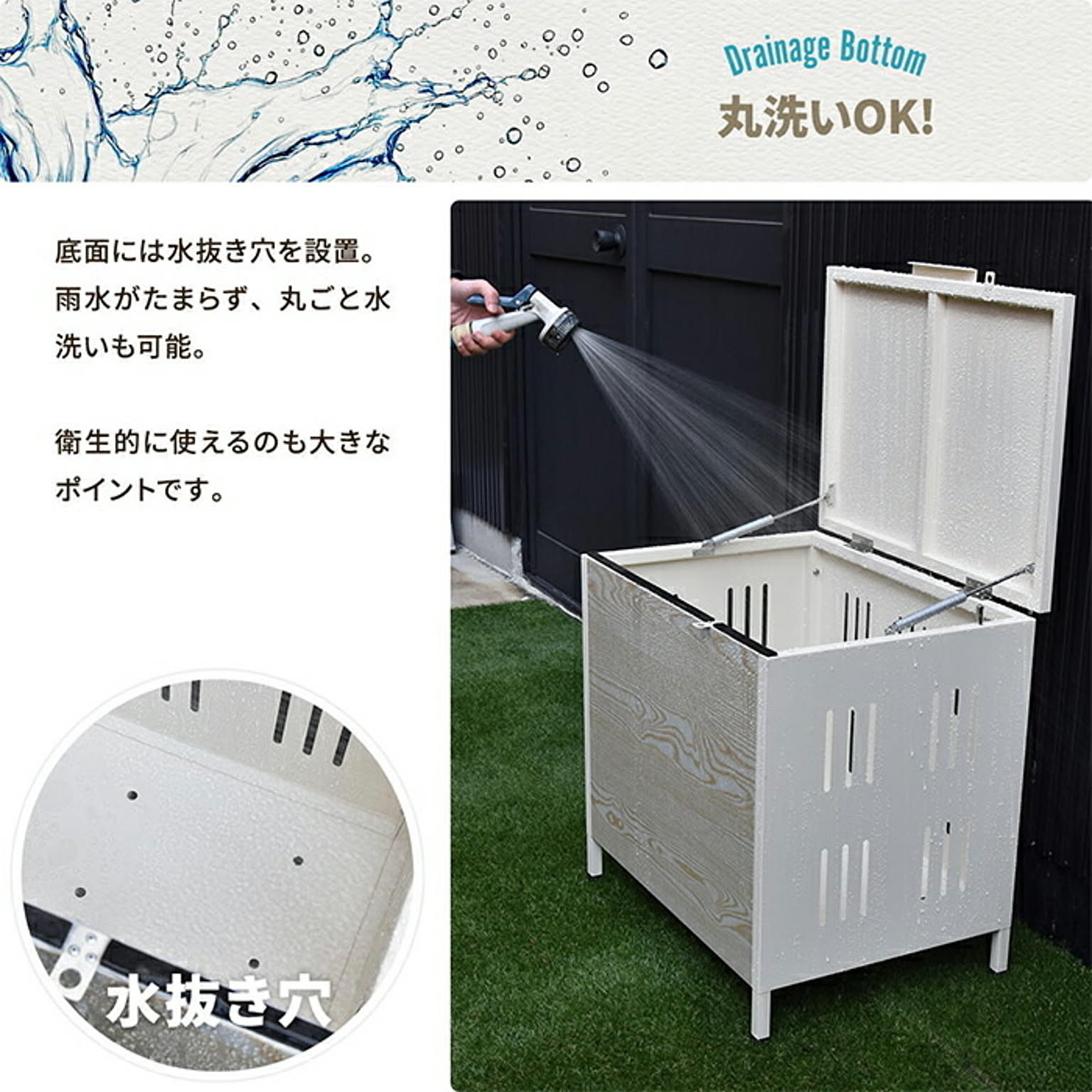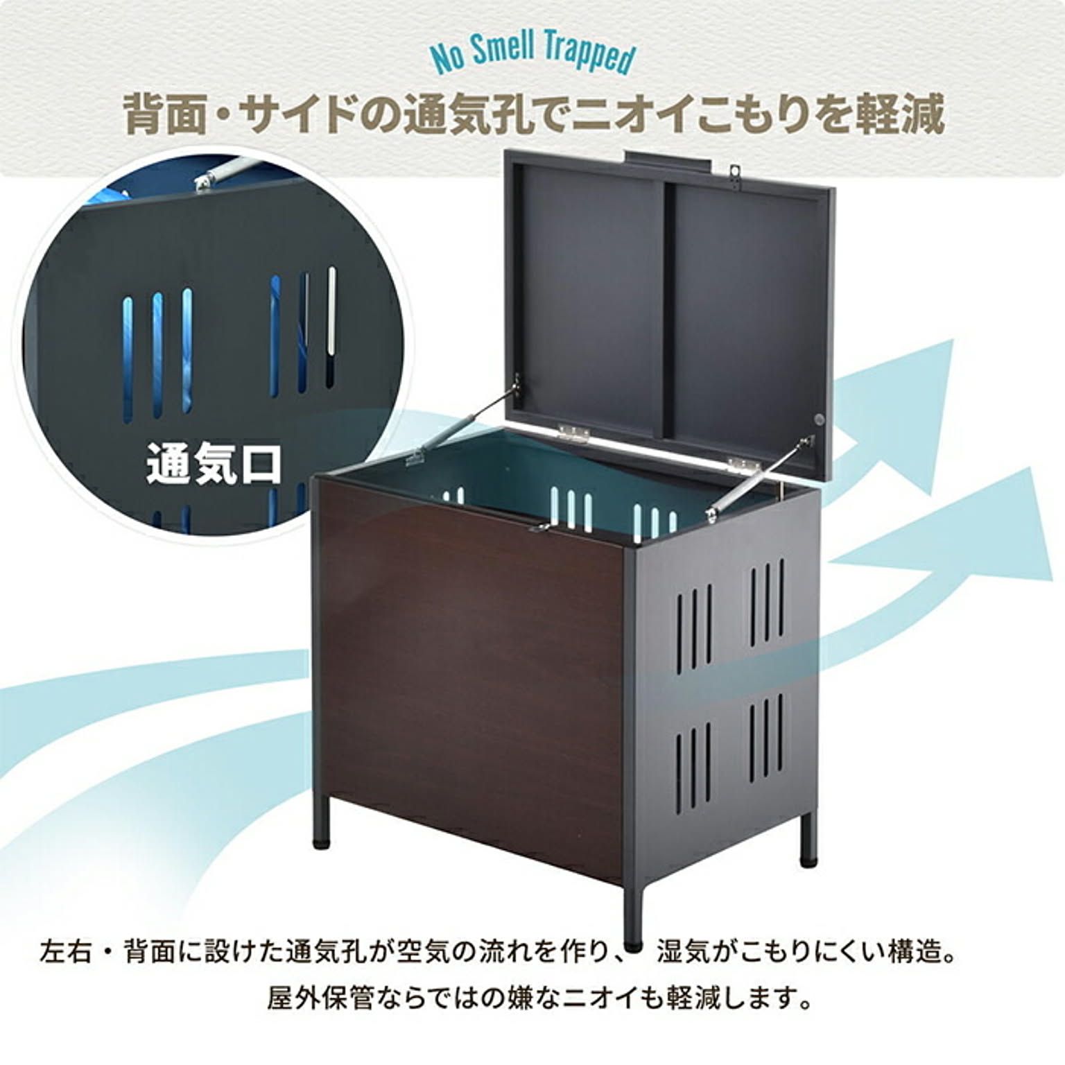 屋外でのゴミ収納やガーデニング用品の保管に便利な多目的収納ボックス。ガス圧ダンパー付きで軽く開閉でき、ソフトクローズ機能で静かに閉まります。耐久性のある亜鉛めっきスチール素材に木目調デザインを合わせ、玄関先やお庭に自然に馴染むデザインです。