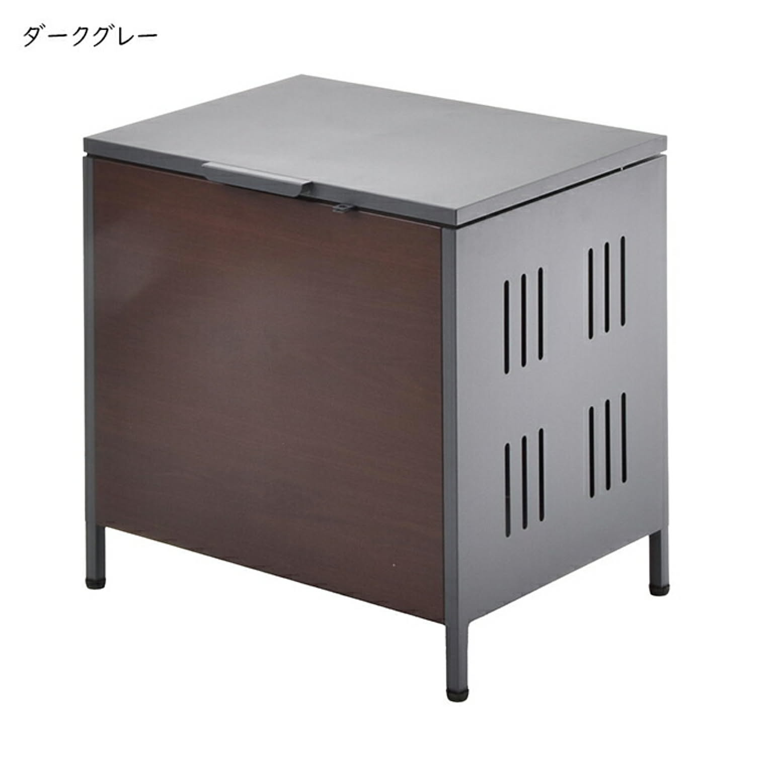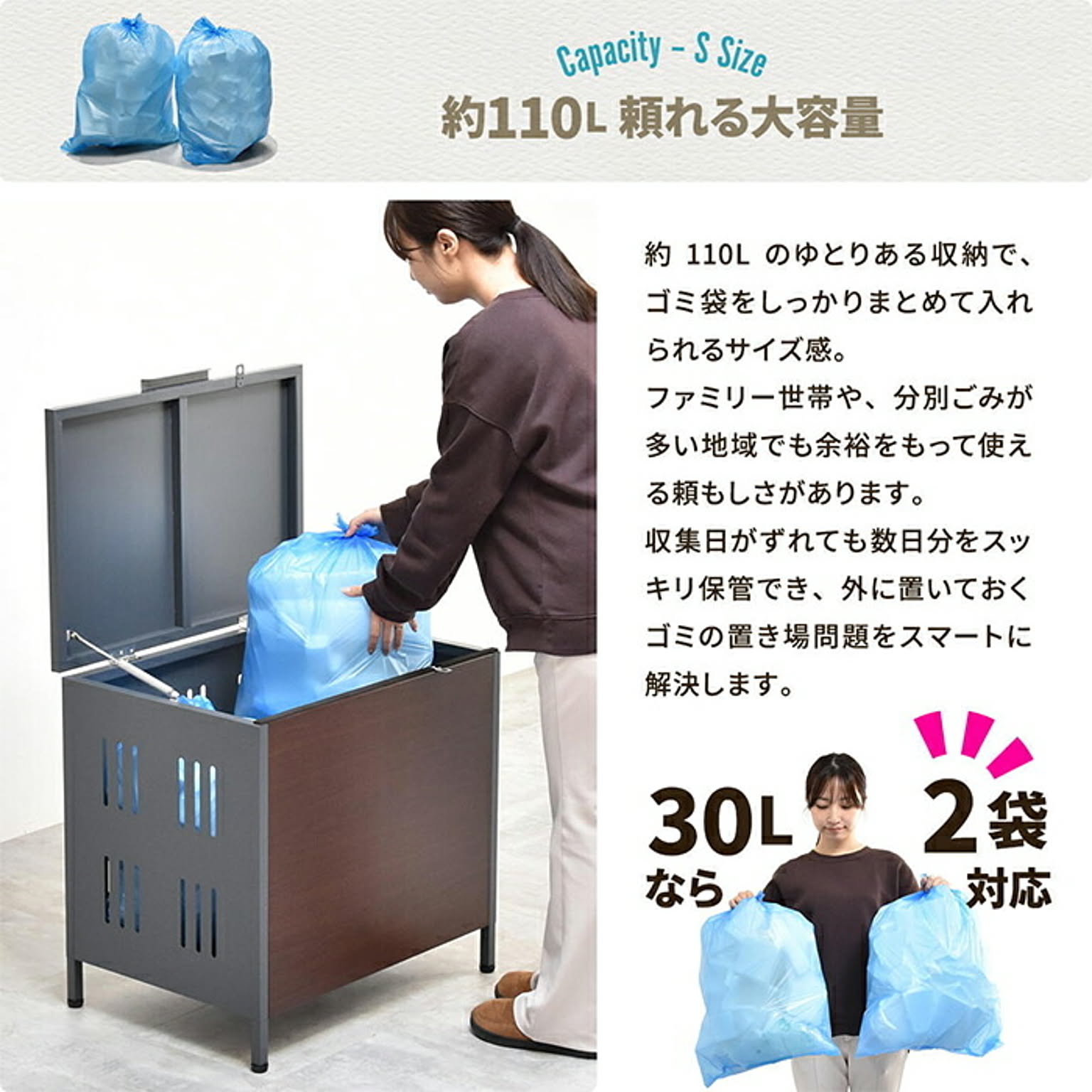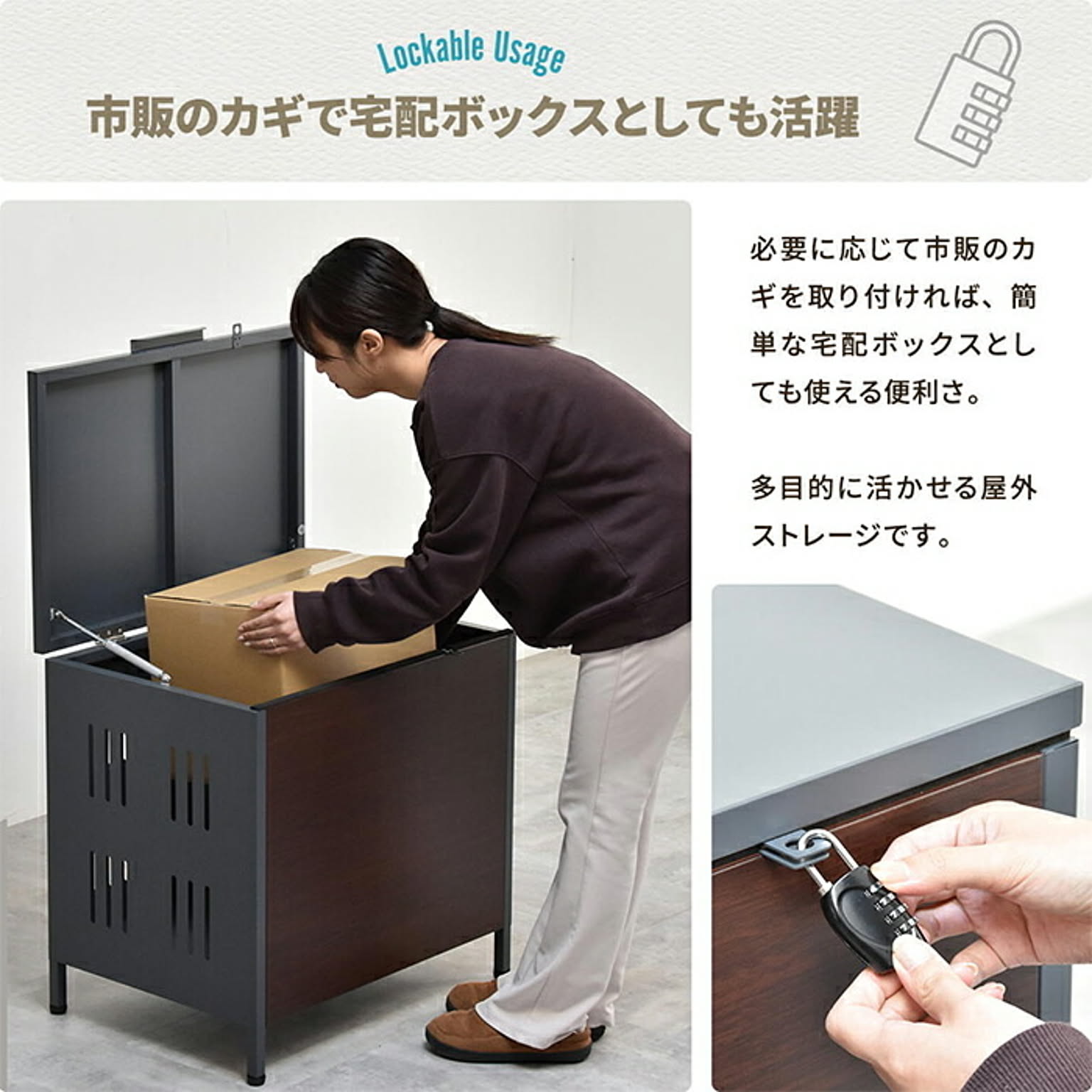 屋外でのゴミ収納やガーデニング用品の保管に便利な多目的収納ボックス。ガス圧ダンパー付きで軽く開閉でき、ソフトクローズ機能で静かに閉まります。耐久性のある亜鉛めっきスチール素材に木目調デザインを合わせ、玄関先やお庭に自然に馴染むデザインです。