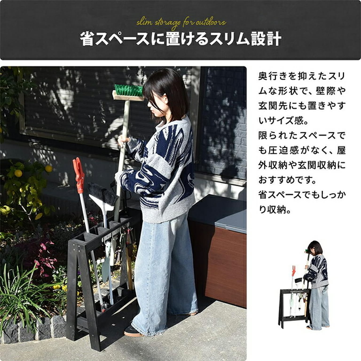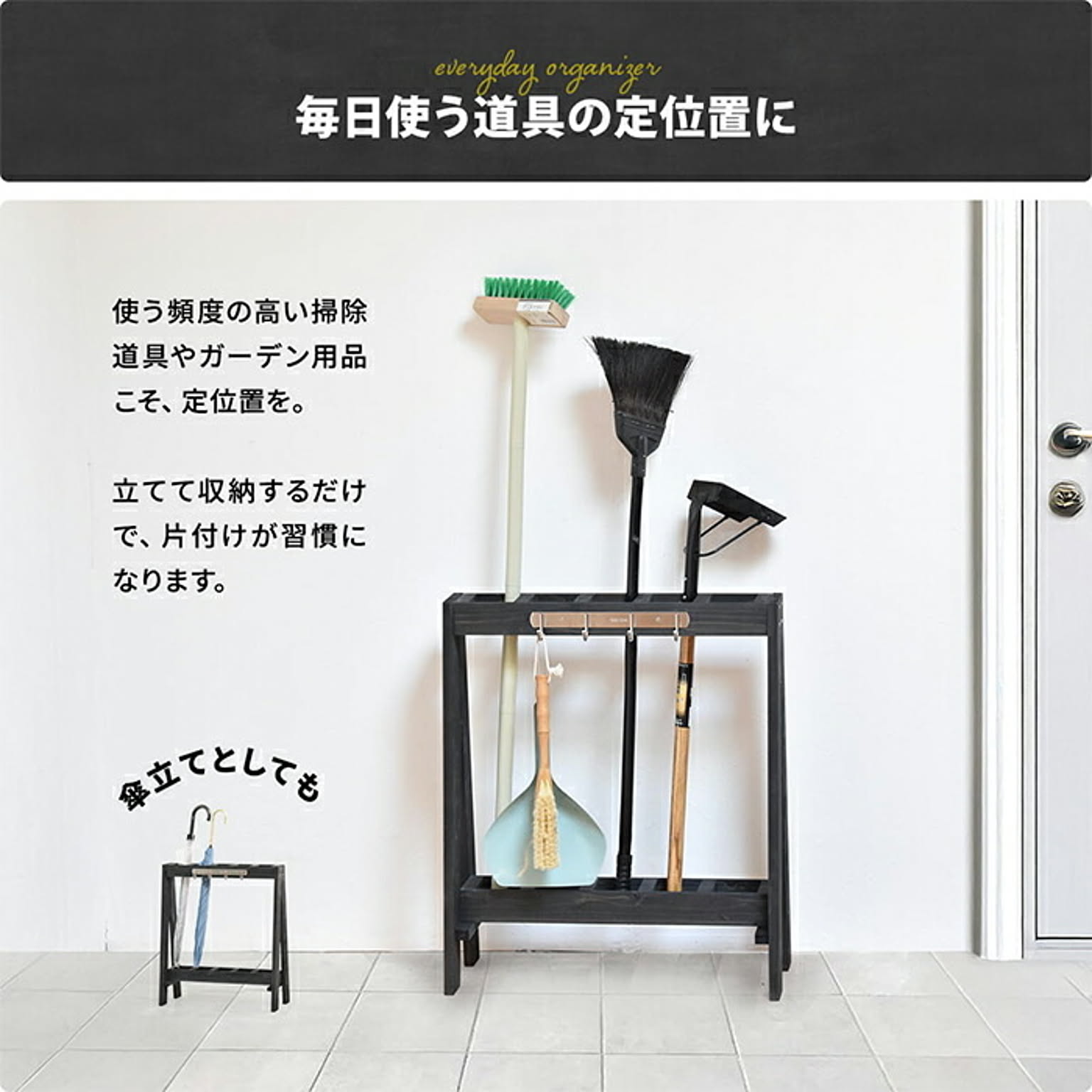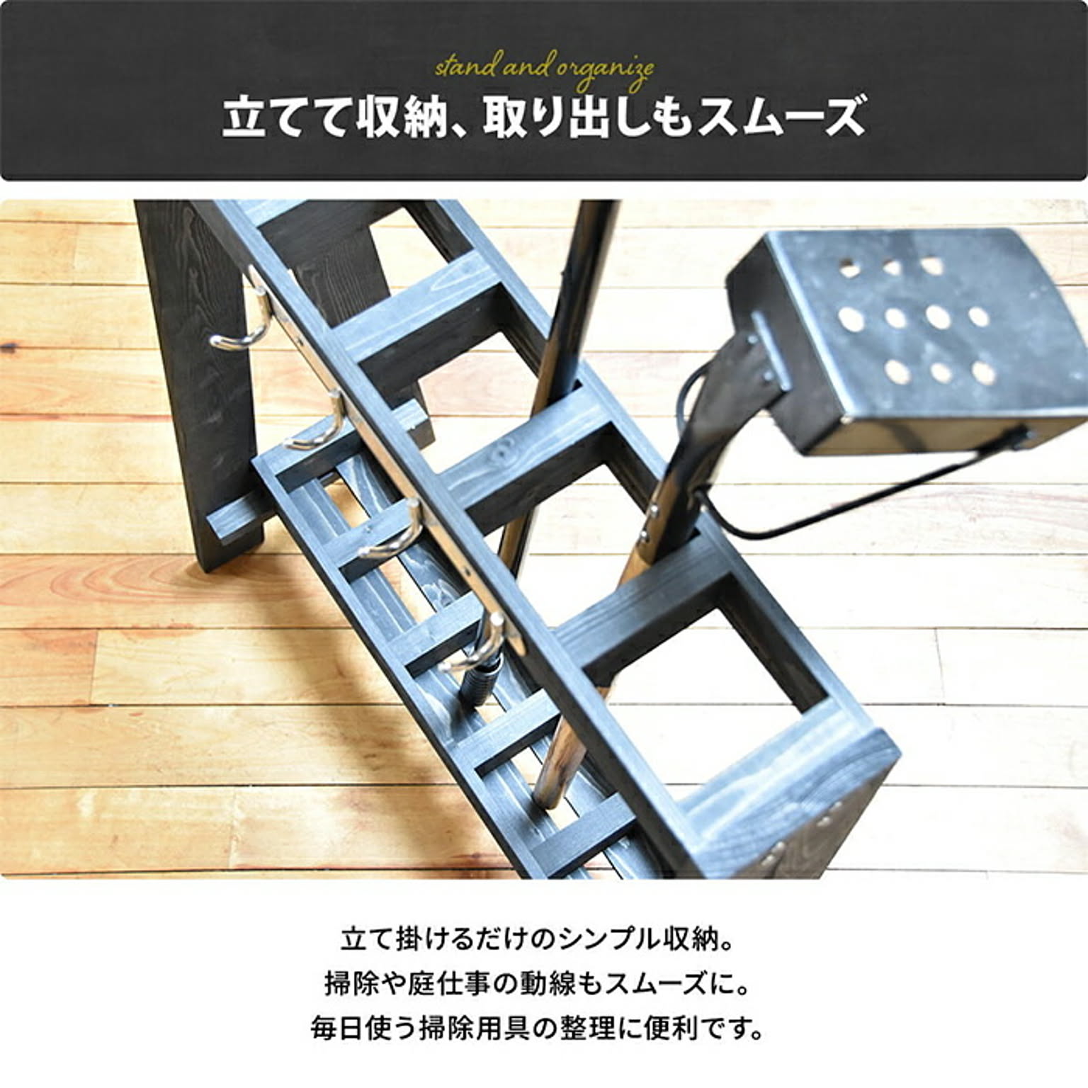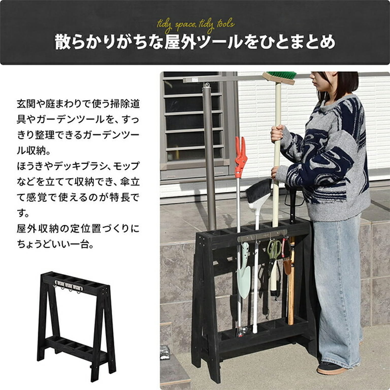 玄関や庭まわりで使う掃除道具やガーデンツールを、傘立て感覚で立てて収納できる木製ガーデンツールスタンド。スリム設計で省スペースに置け、ほうきやデッキブラシ、小物類までひとまとめに整理できます。フック付きで使いやすく、屋外収納や玄関整理におすすめです。