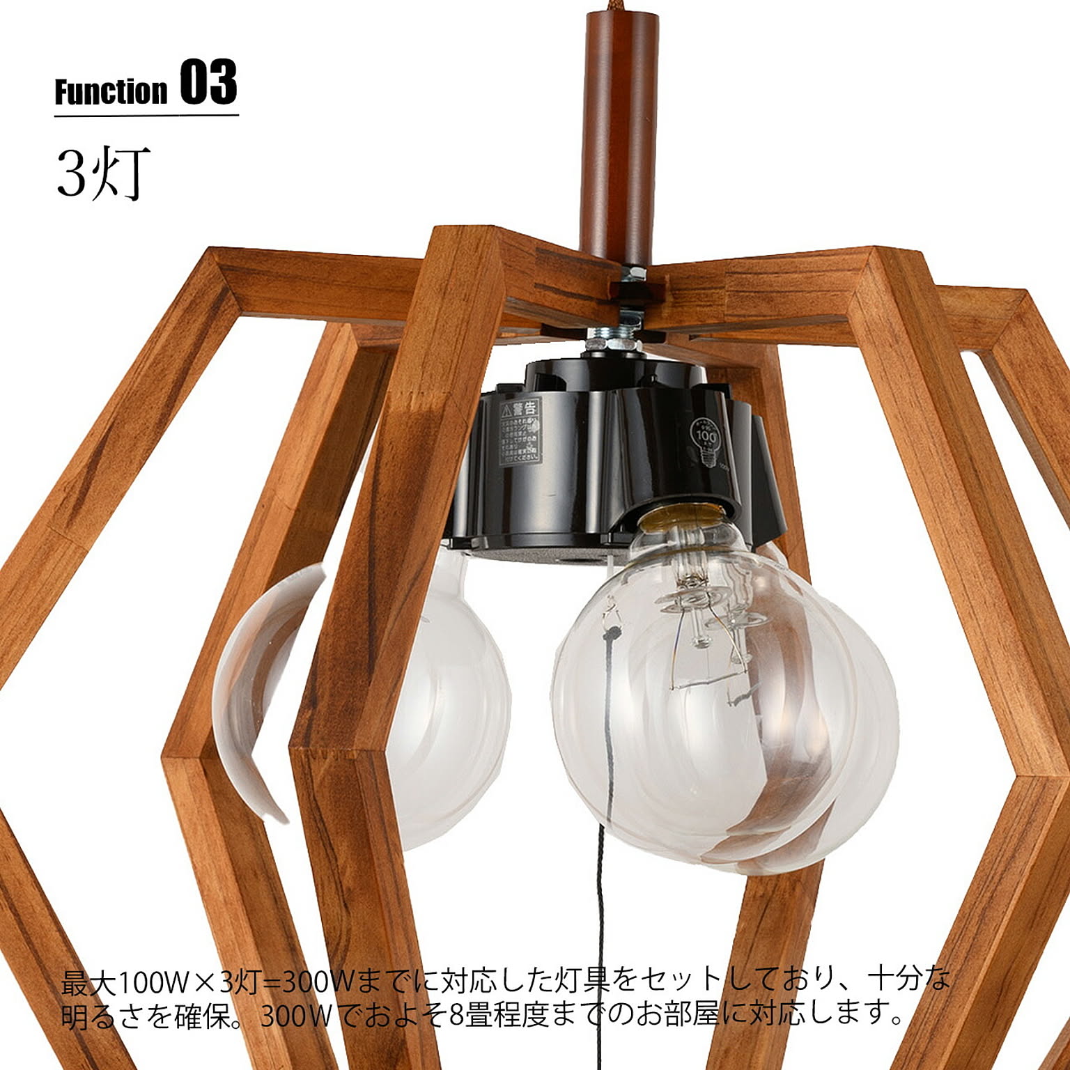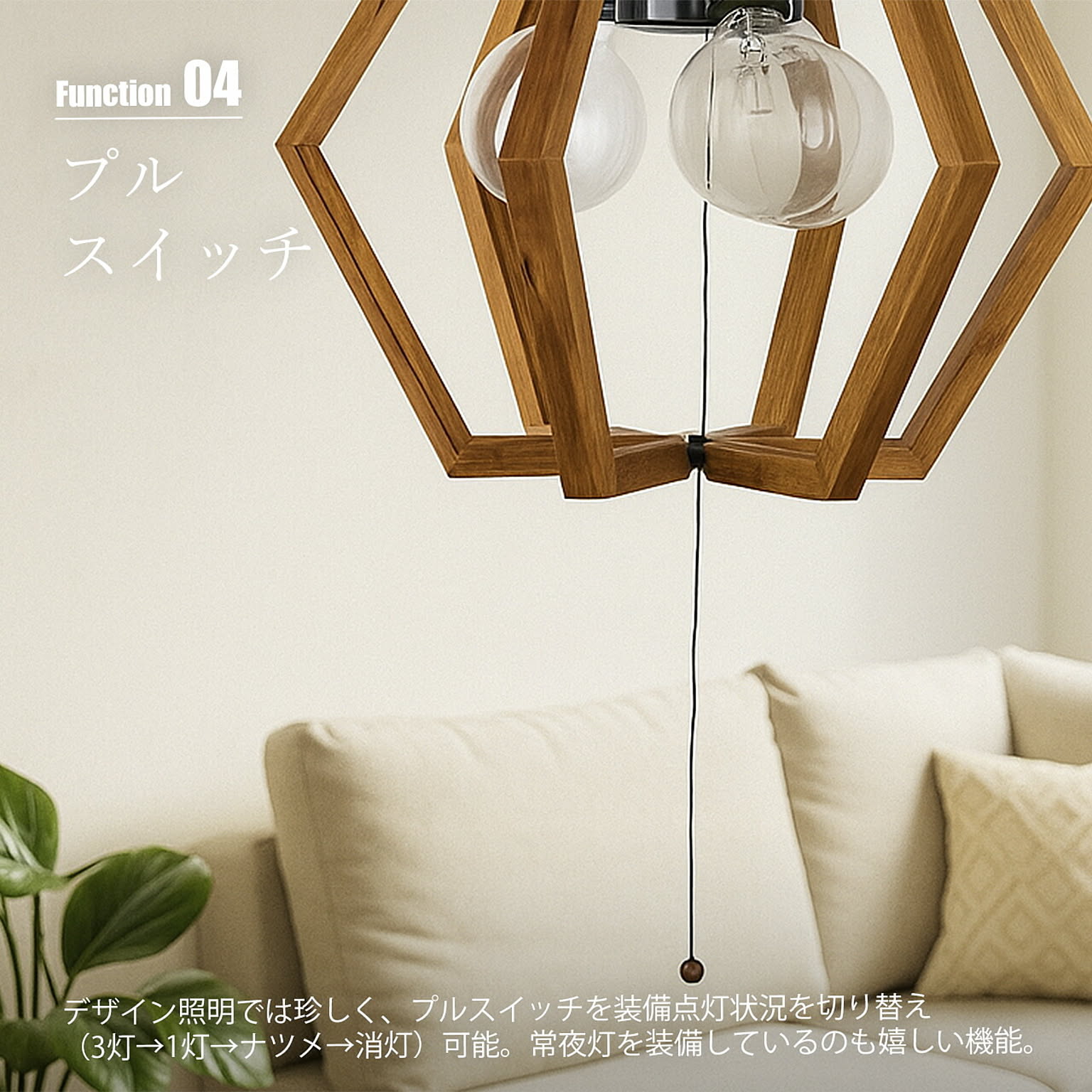 木枠をダイヤモンドのような形状に組み上げて、ナチュラル素材の中にも幾何学的な要素を盛り込んだ印象的なシルエット。建造物のような構造美と温かみある木の素材感を味わえます。〜100W×3灯と明るさも十分に確保しプルスイッチで(3灯→1灯→ナツメ→消灯)と切り替え可能。夜間の点灯時には灯りに照らされる木枠内側と、それに反した外側の暗さのコントラストが美しく、木枠を通して光が投影された壁面に陰影が出来ることで空間自体も幻想的に。