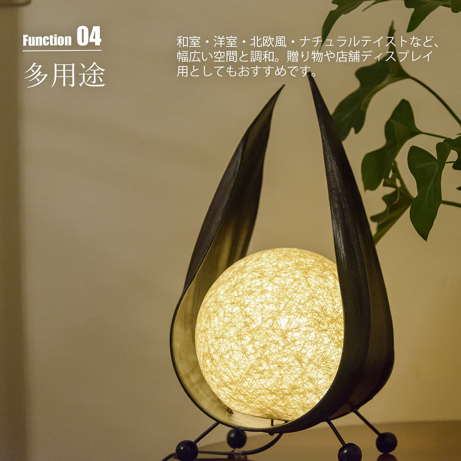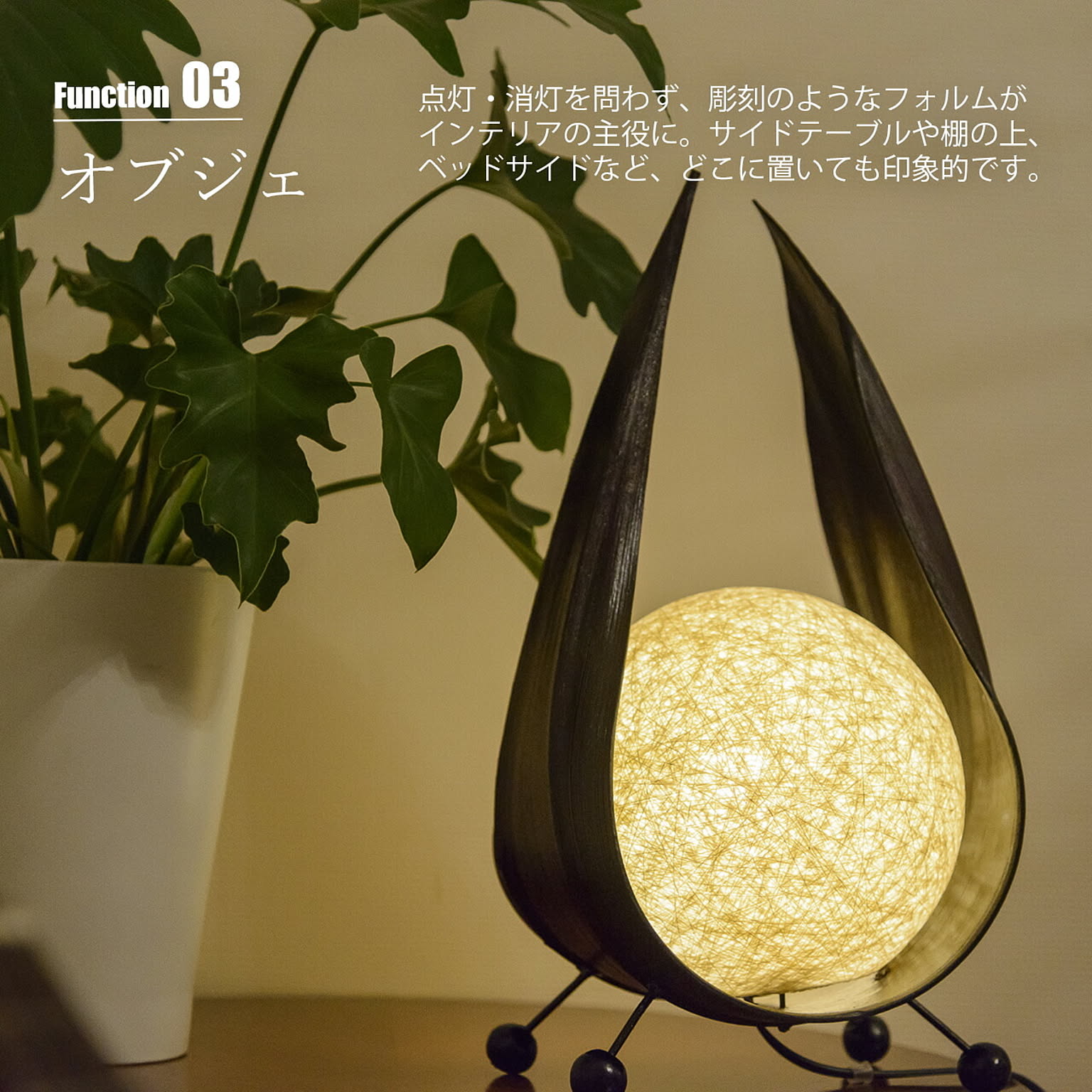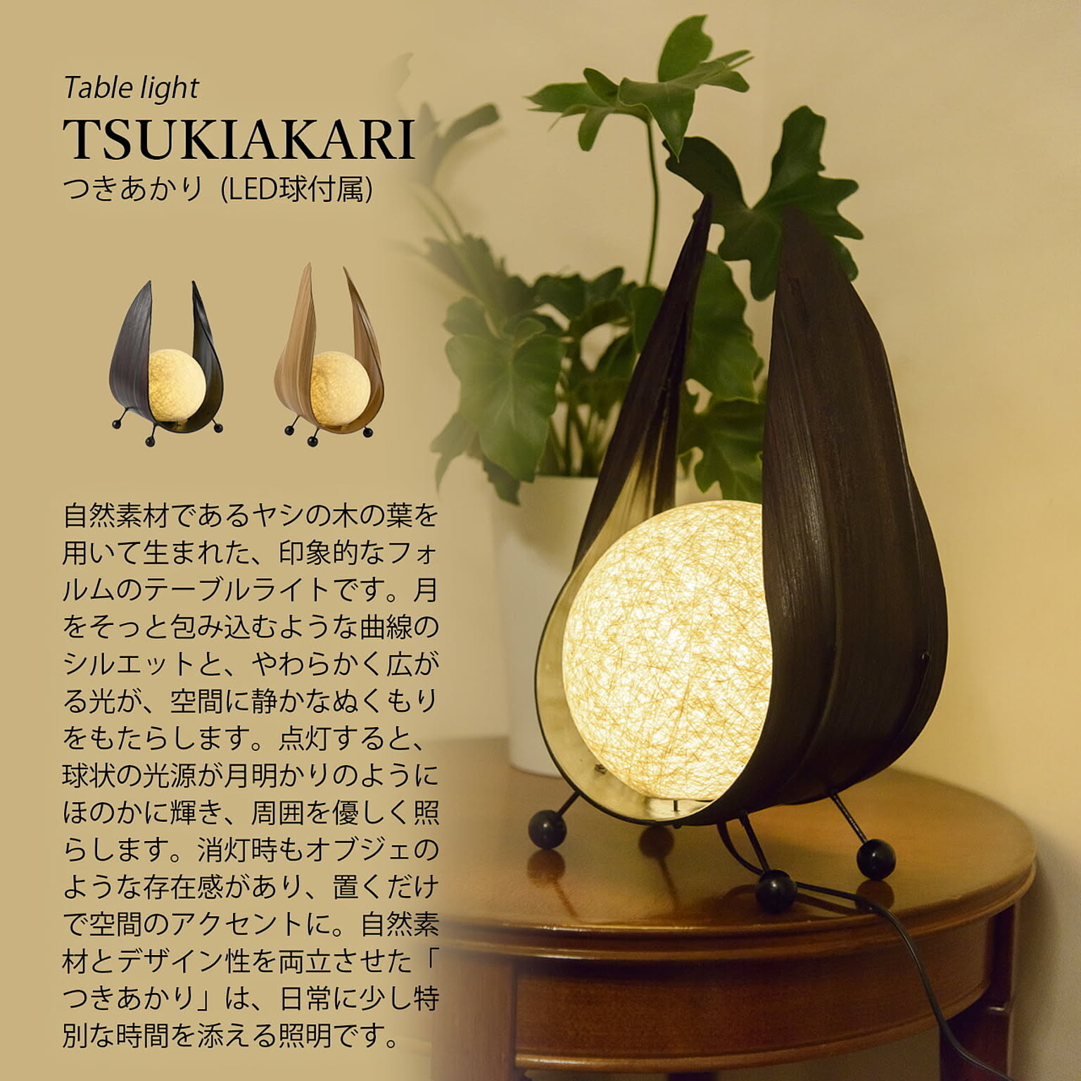 自然素材であるヤシの木の葉を用いて生まれた、印象的なフォルムのテーブルライトです。月をそっと包み込むような曲線のシルエットと、やわらかく広がる光が、空間に静かなぬくもりをもたらします。点灯すると、球状の光源が月明かりのようにほのかに輝き、周囲を優しく照らします。消灯時もオブジェのような存在感があり、置くだけで空間のアクセントに。自然素材とデザイン性を両立させた「つきあかり」は、日常に少し特別な時間を添える照明です。