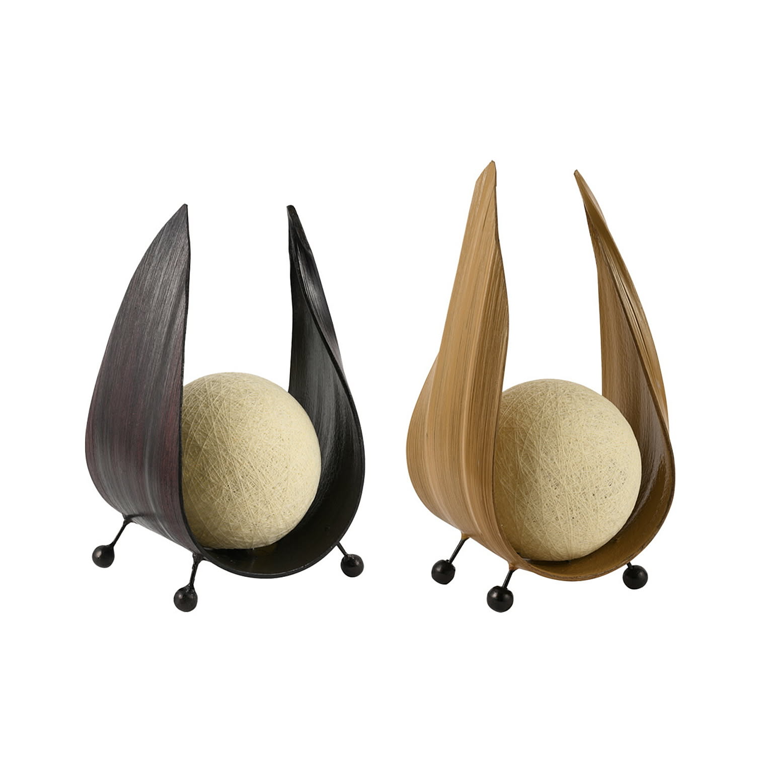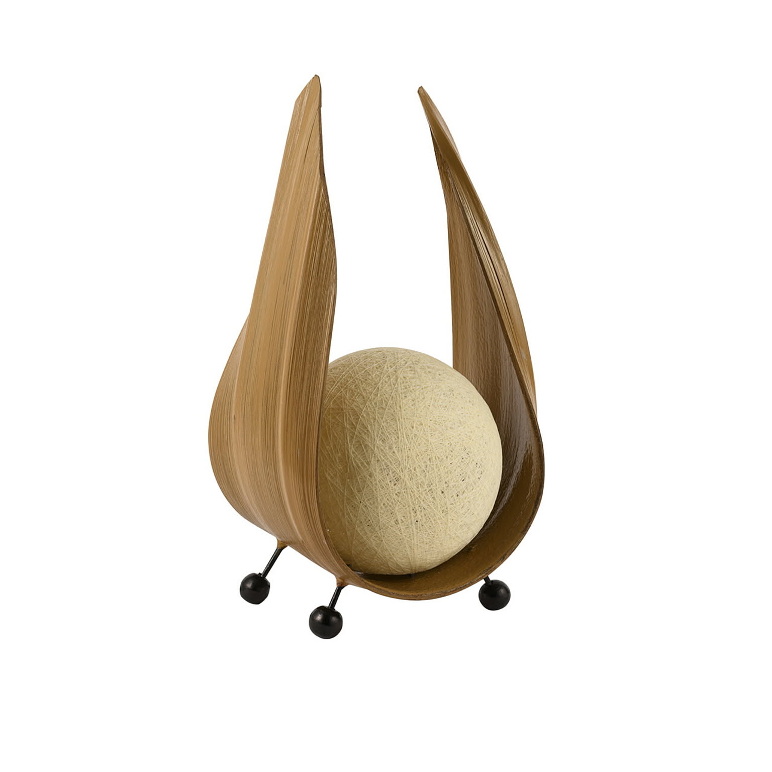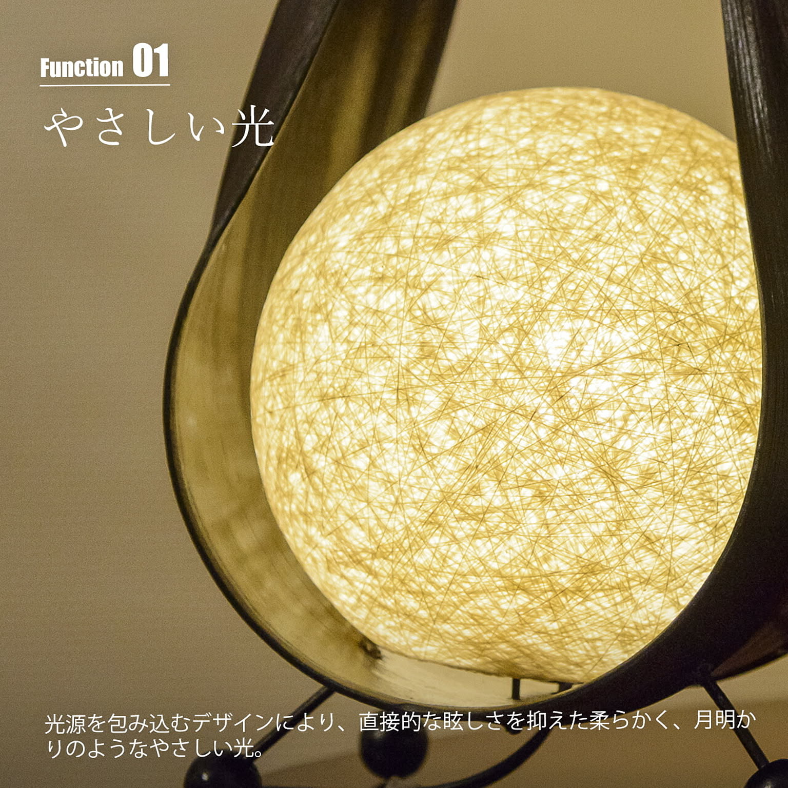 自然素材であるヤシの木の葉を用いて生まれた、印象的なフォルムのテーブルライトです。月をそっと包み込むような曲線のシルエットと、やわらかく広がる光が、空間に静かなぬくもりをもたらします。点灯すると、球状の光源が月明かりのようにほのかに輝き、周囲を優しく照らします。消灯時もオブジェのような存在感があり、置くだけで空間のアクセントに。自然素材とデザイン性を両立させた「つきあかり」は、日常に少し特別な時間を添える照明です。
