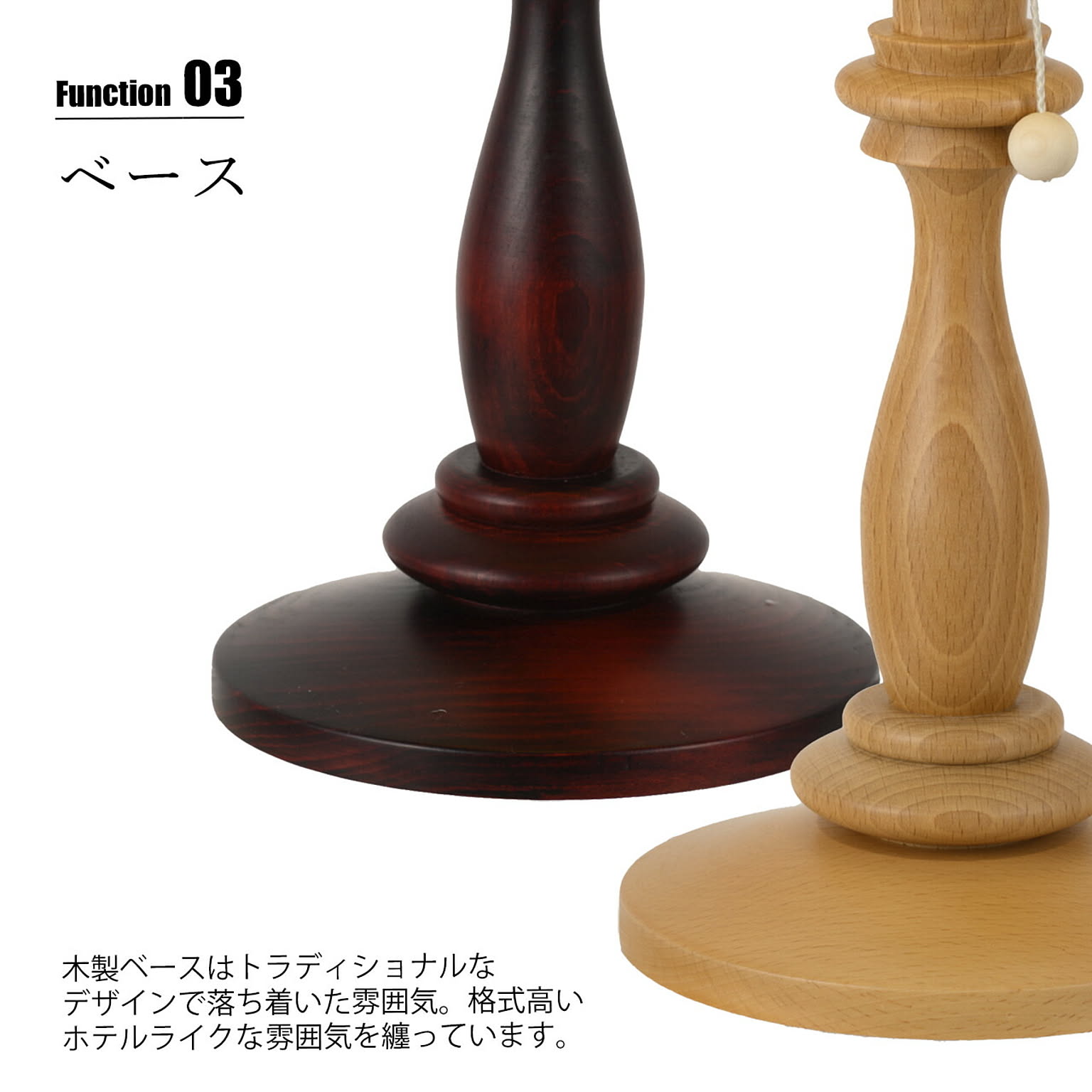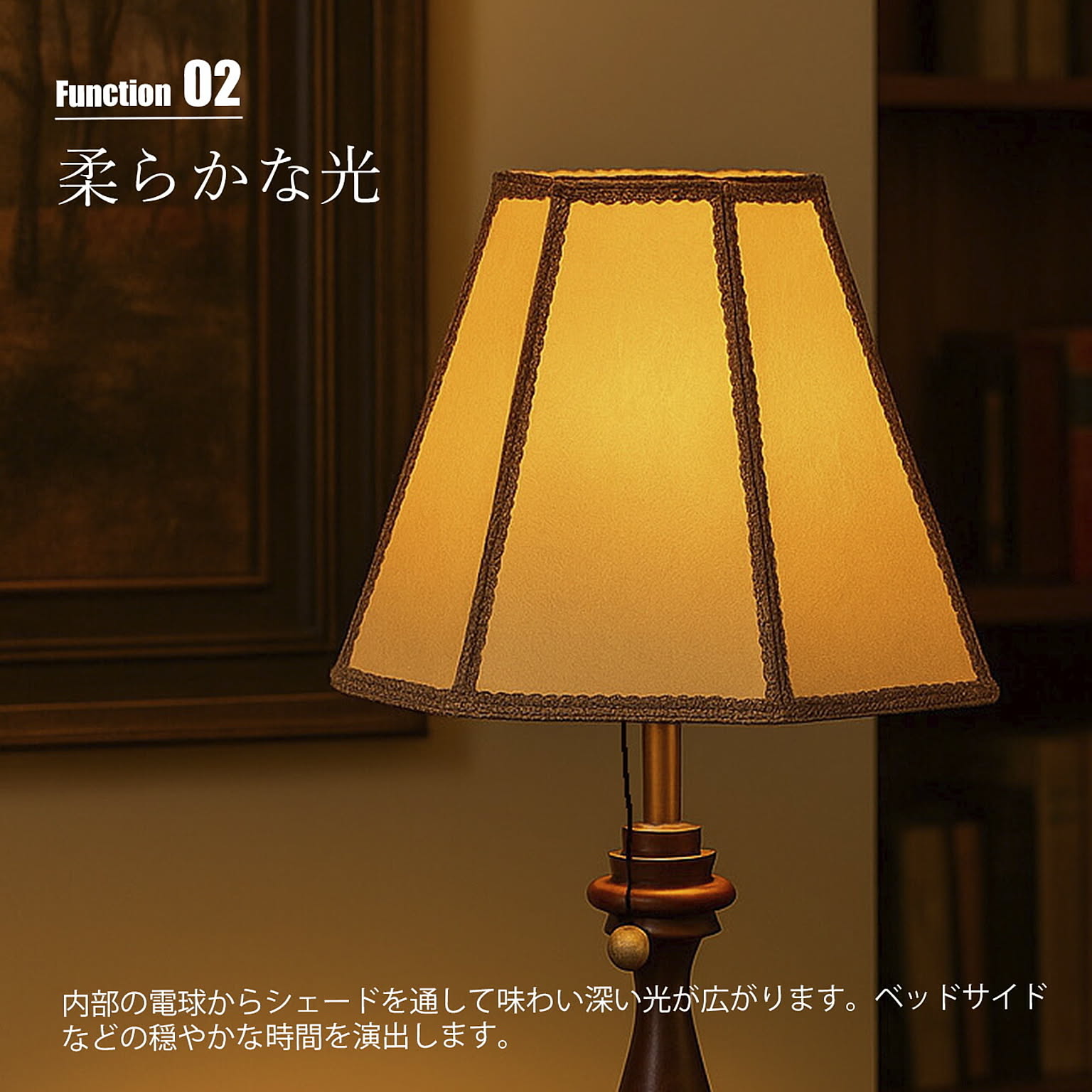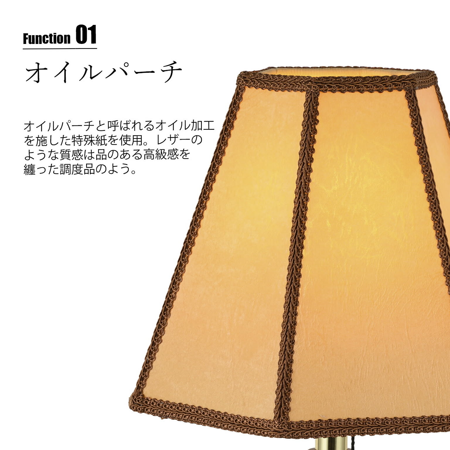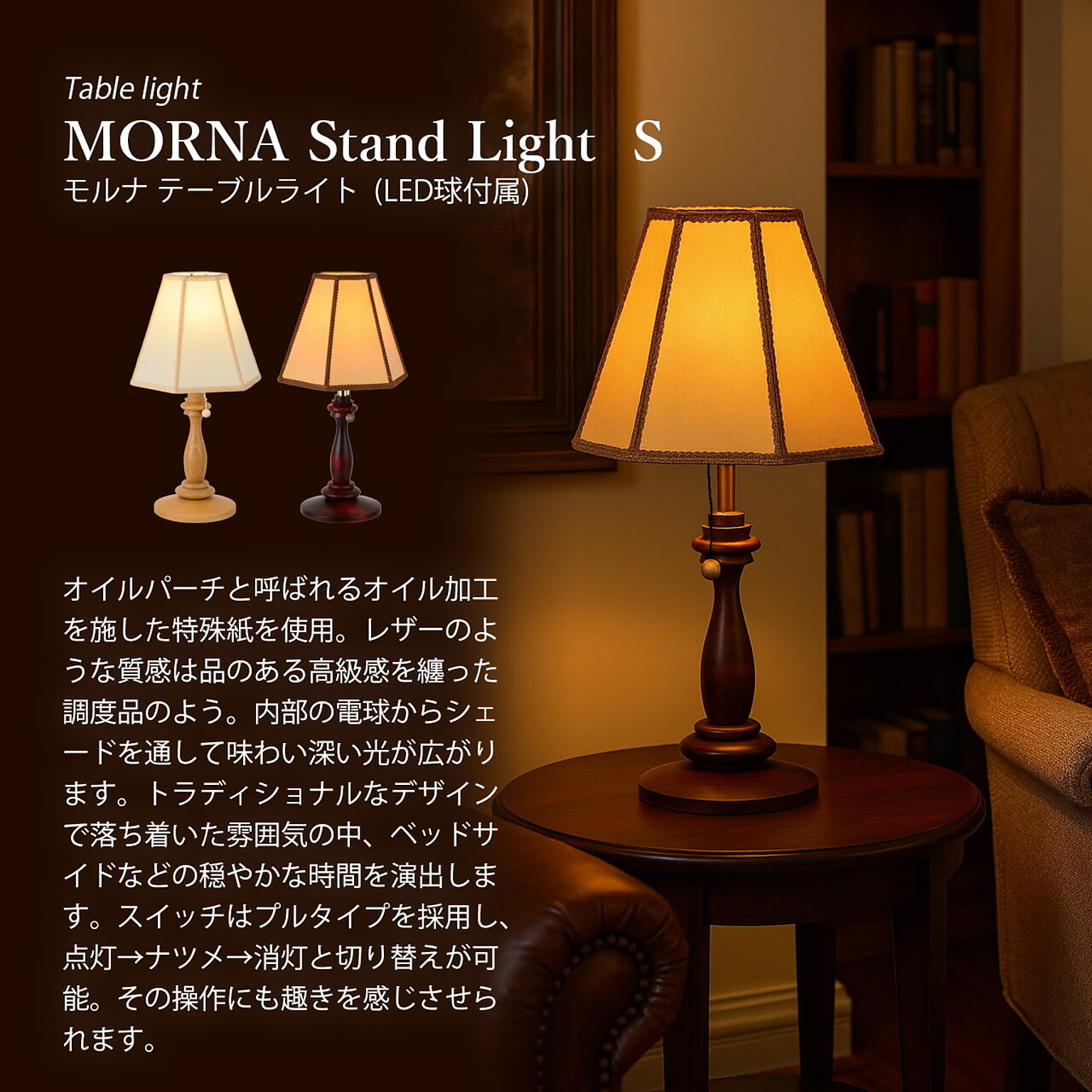 オイルパーチと呼ばれるオイル加工を施した特殊紙を使用。レザーのような質感は品のある高級感を纏った調度品のよう。内部の電球からシェードを通して味わい深い光が広がります。トラディショナルなデザインで落ち着いた雰囲気の中、ベッドサイドなどの穏やかな時間を演出します。スイッチはプルタイプを採用し、点灯→ナツメ→消灯と切り替えが可能。その操作にも趣きを感じさせられます。