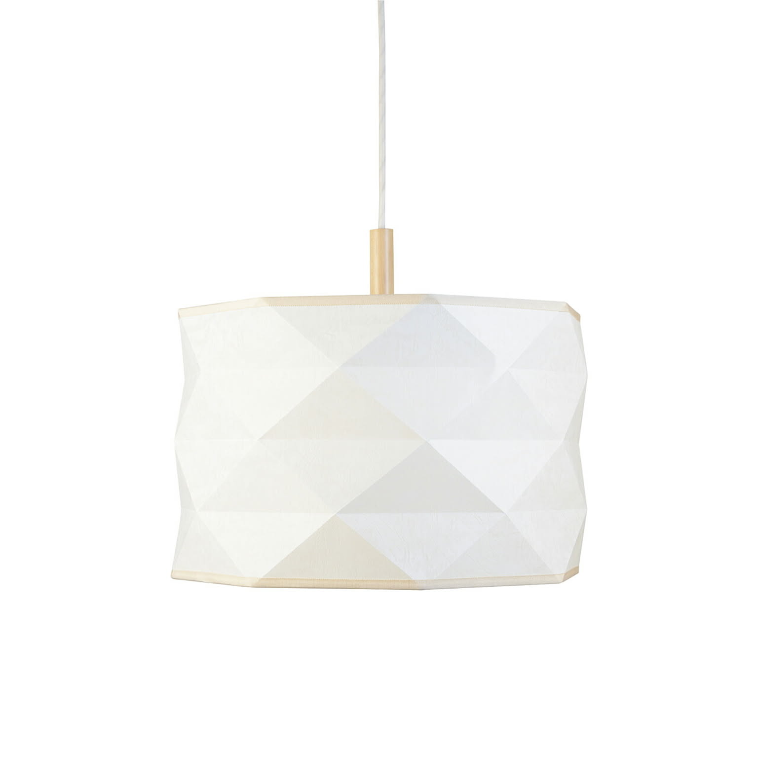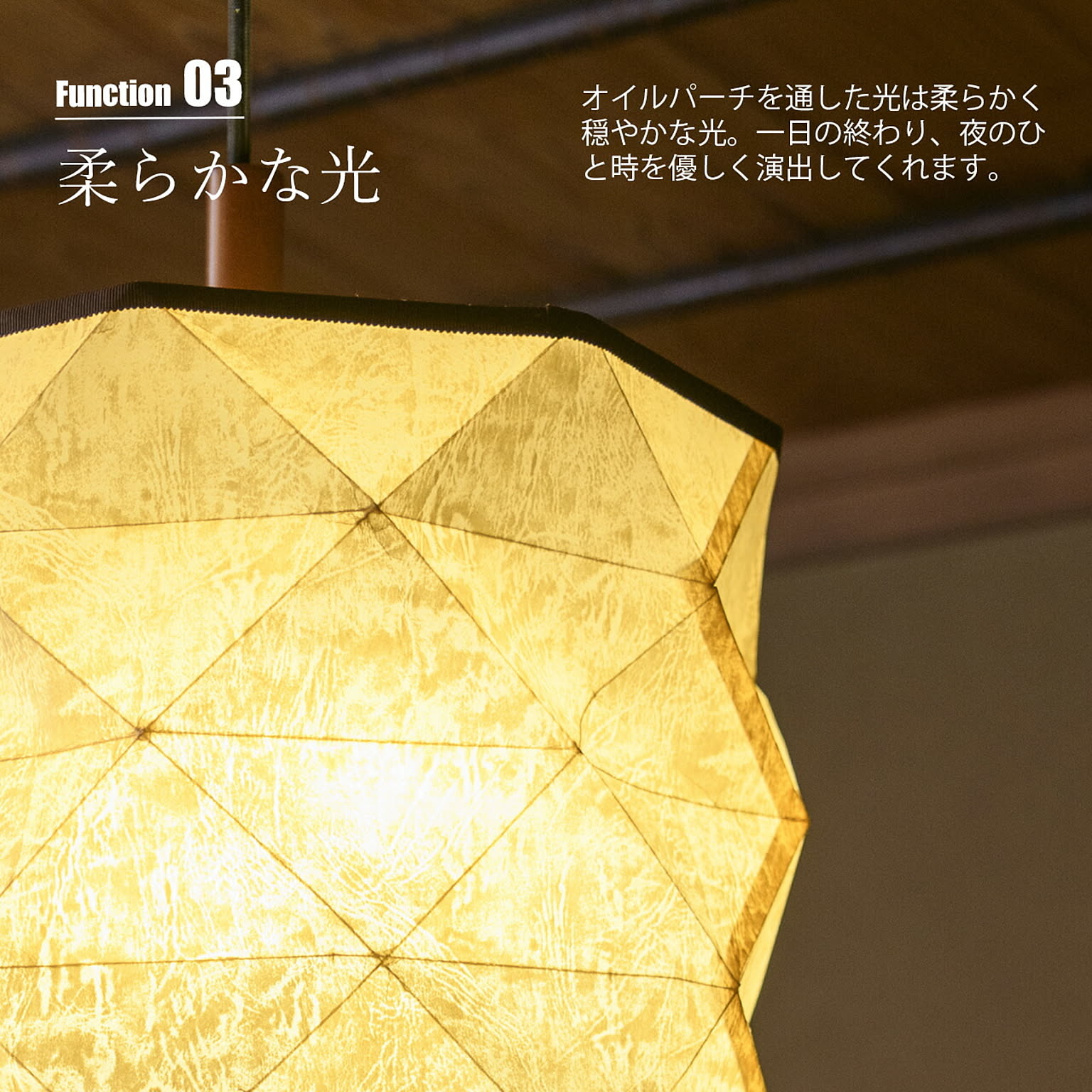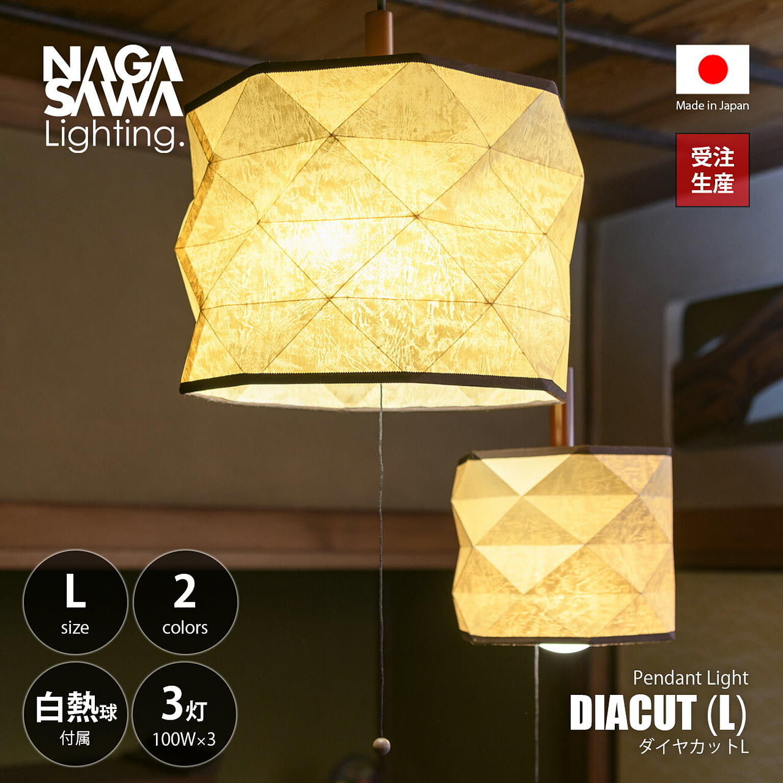 【受注生産:納期目安約2-3週間程度】 オイル加工を施しレザーのような質感が特徴の特殊紙オイルパーチ材を使い、ダイヤ型に折り目を付けたデザインのペンダントライト。日本の熟練職人による丁寧な手仕事が光ります。ノスタルジックでレトロな和モダンな雰囲気を見せつつも、ダイヤカット状に仕上げた幾何学的な雰囲気が相まって幻想的な佇まいになっています。100W×3灯で、十分な明るさとサイズ感。プルスイッチも備えて多様なシーンに応えます。多灯吊りもおすすめで、和モダンやアジアンはもちろん、店舗照明など多様なインテリアにマッチします。