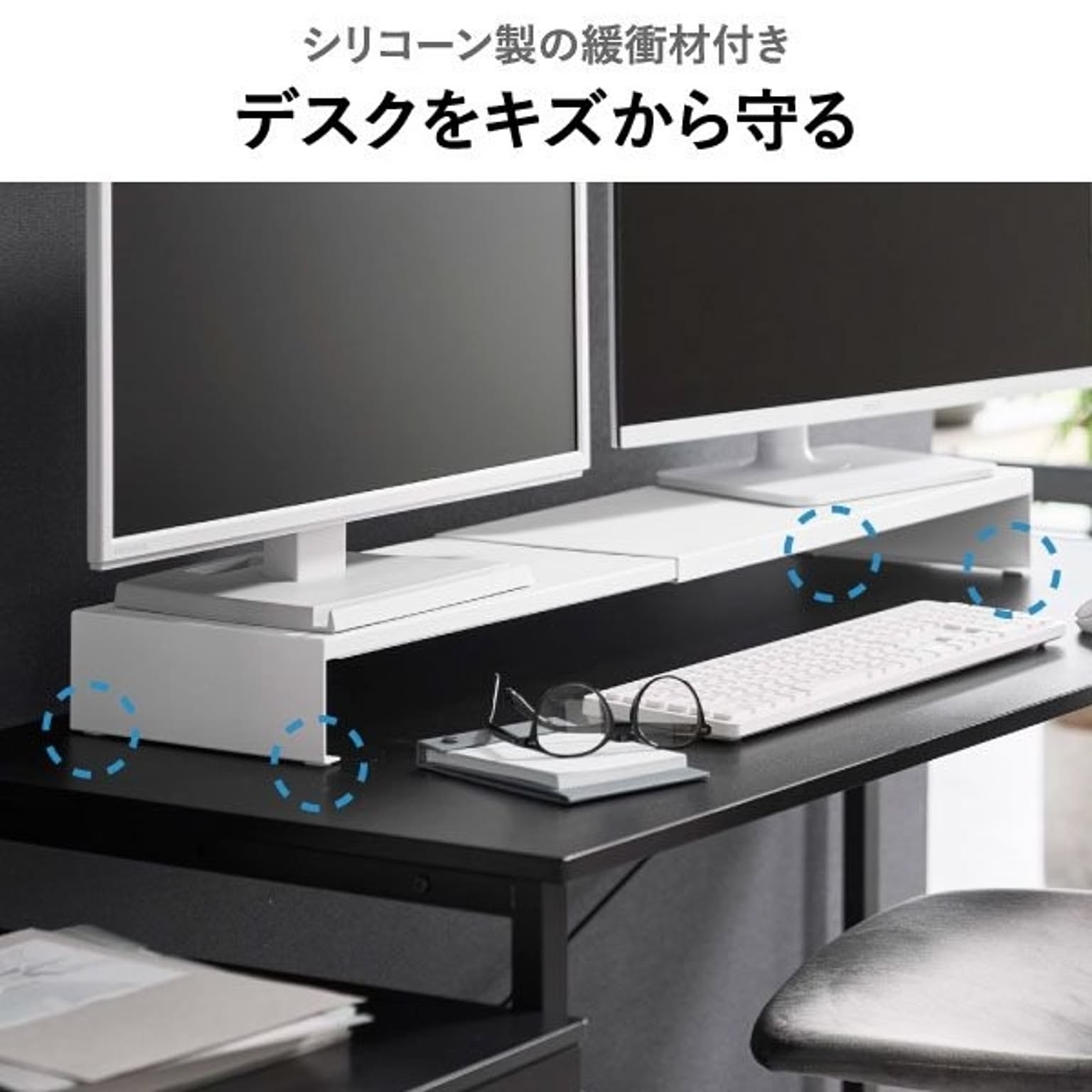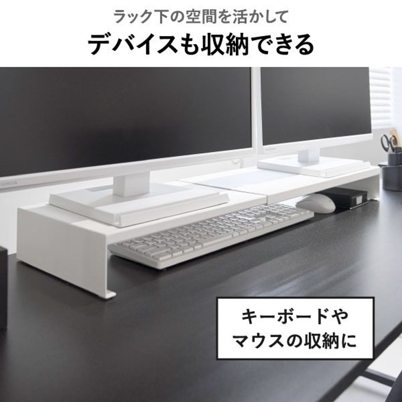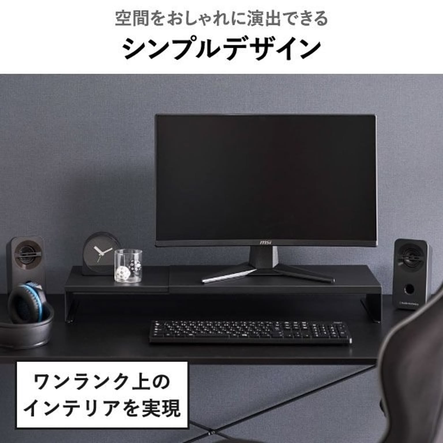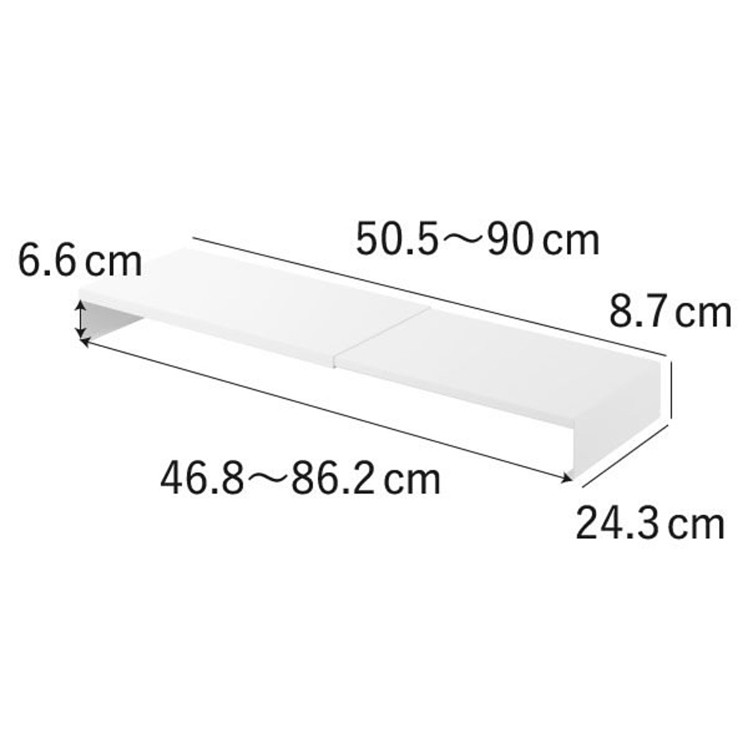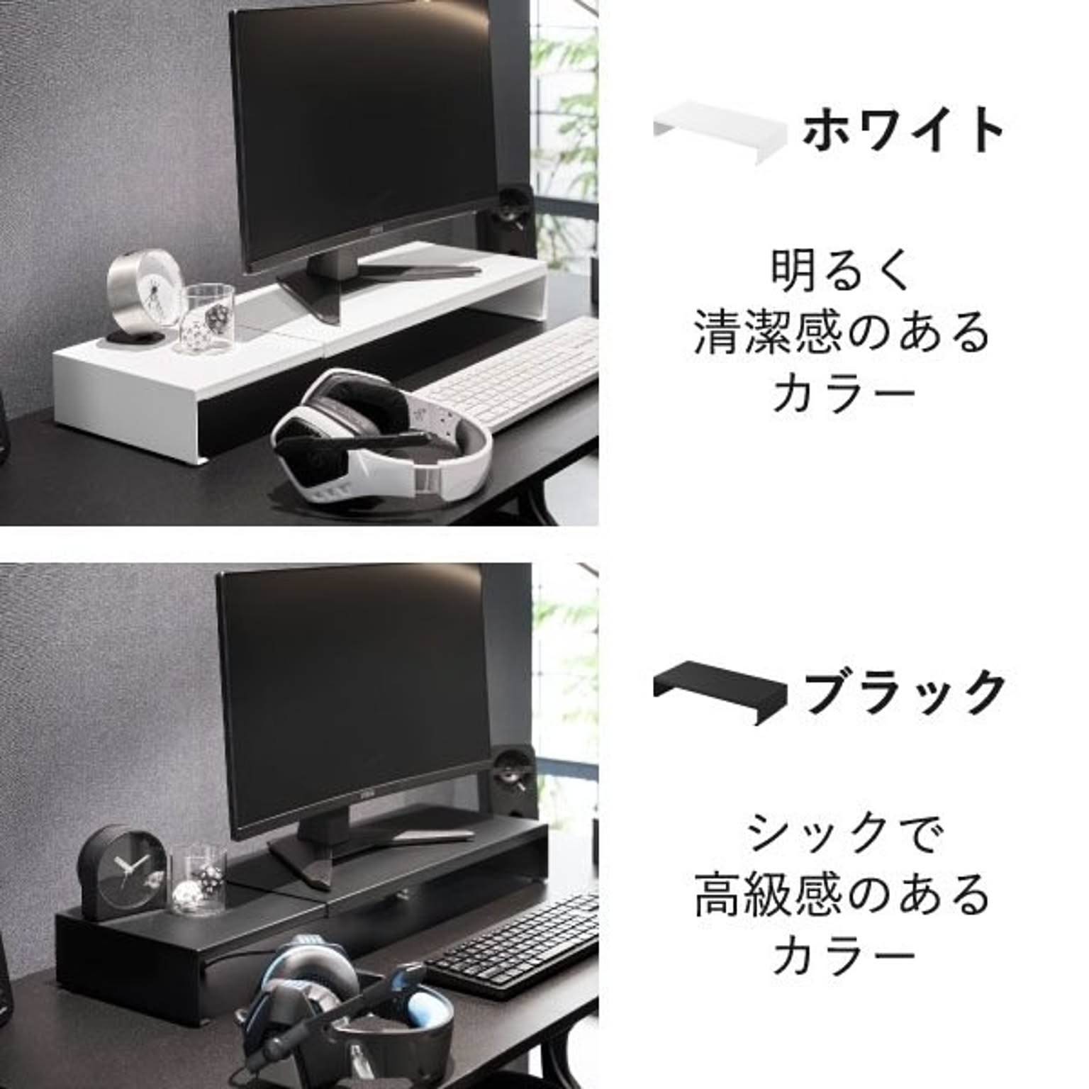 ゲーミングモニターの高さを底上げして、ゲームをしやすい環境を整えるゲーミングラックです。一切の無駄を省いた、シンプルでスタイリッシュなデザインのゲーミングラック。上質なシンプルさが様々な部屋に溶け込み、ワンランク上のインテリアを実現します。浅めのゲーミングデスクにも最適な、スリムなサイズ感のゲーミングラックで、モニターとの距離を適切に保ちつつ、ゲーミングデスク上の限られた空間を賢く活用。このゲーミングラックは、横幅を無段階で調節できる伸縮タイプです。お使いのモニターや、ゲーミングデスクの幅に応じて、自由に調節して使えます。シングルはもちろん、デュアルモニターにも対応できて便利です。ゲーミングラックの幅をあえて広くとることで、雑貨を置く収納スペースを確保できます。コの字型のゲーミングラックで、下の空間を活かしてキーボードやマウスを収納可能。ゲーミングデスク手前側の作業スペースを、広く確保することができます。ゲーミングラック天板の耐荷重は約10kgと、とても頑丈な仕様です。モニターだけでなく、WEBカメラやスピーカーなどの周辺機器もまとめてレイアウトできます。ゲーム用のモニターだけでなく、通常のパソコン用のモニターにもお使いいただけます。スタイリッシュなデザインなので、オフィスの雰囲気を壊すことがなく、よりスマートな印象に。ゲーミングラックは丈夫なスチール製で、表面加工によりキズやサビに強い仕様です。こちらのゲーミングラック底面にはシリコーン製の緩衝材がついていて、ゲーミングデスクが傷付くのを防いでくれます。ゲーミングラックの色は、ホワイトとブラックの2色からお選びいただけます。