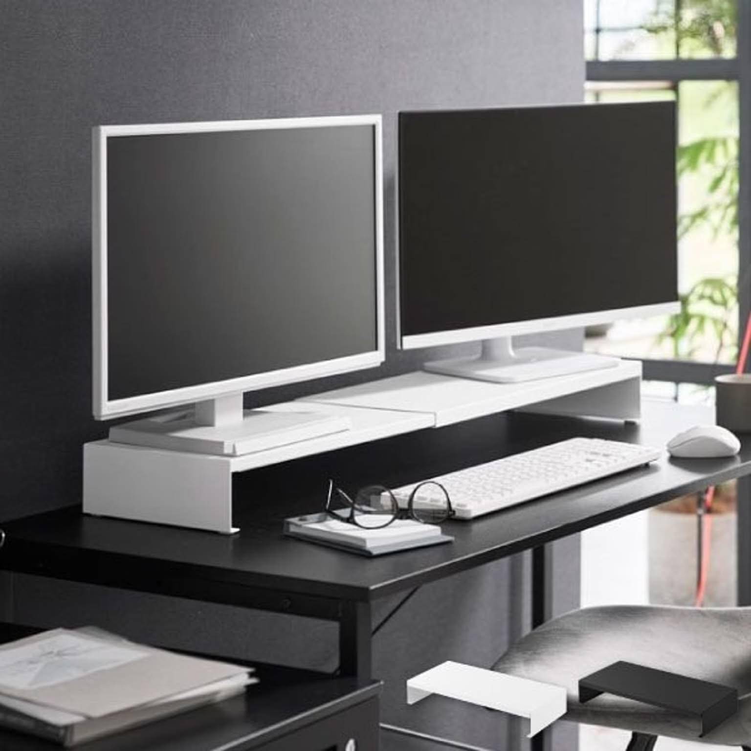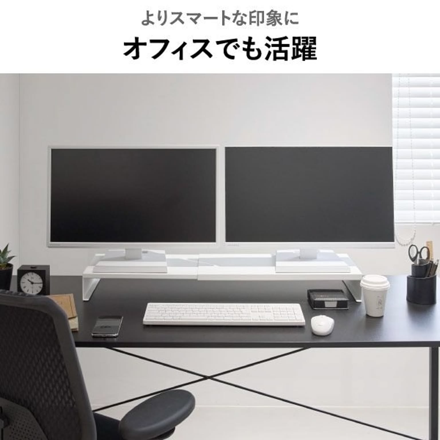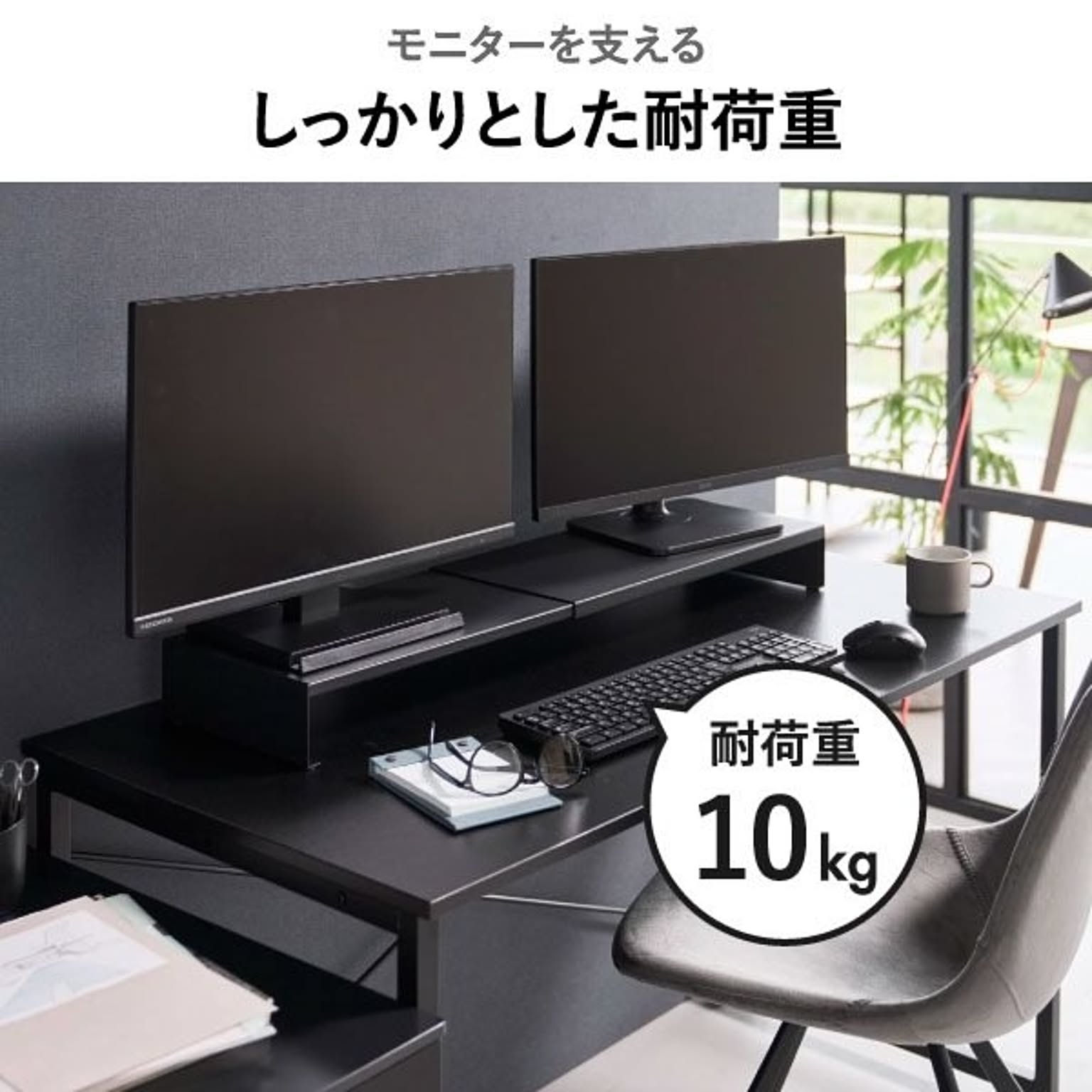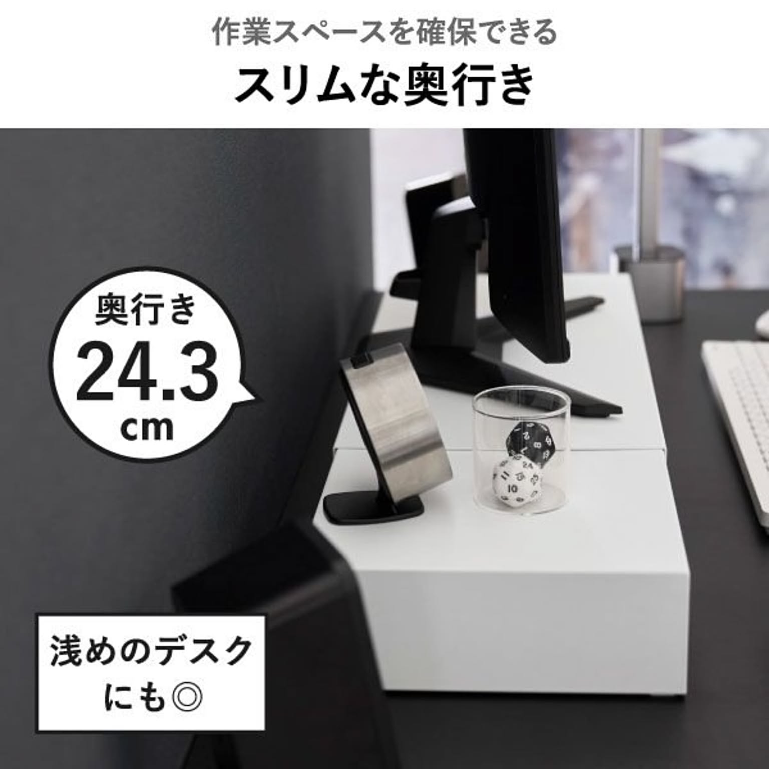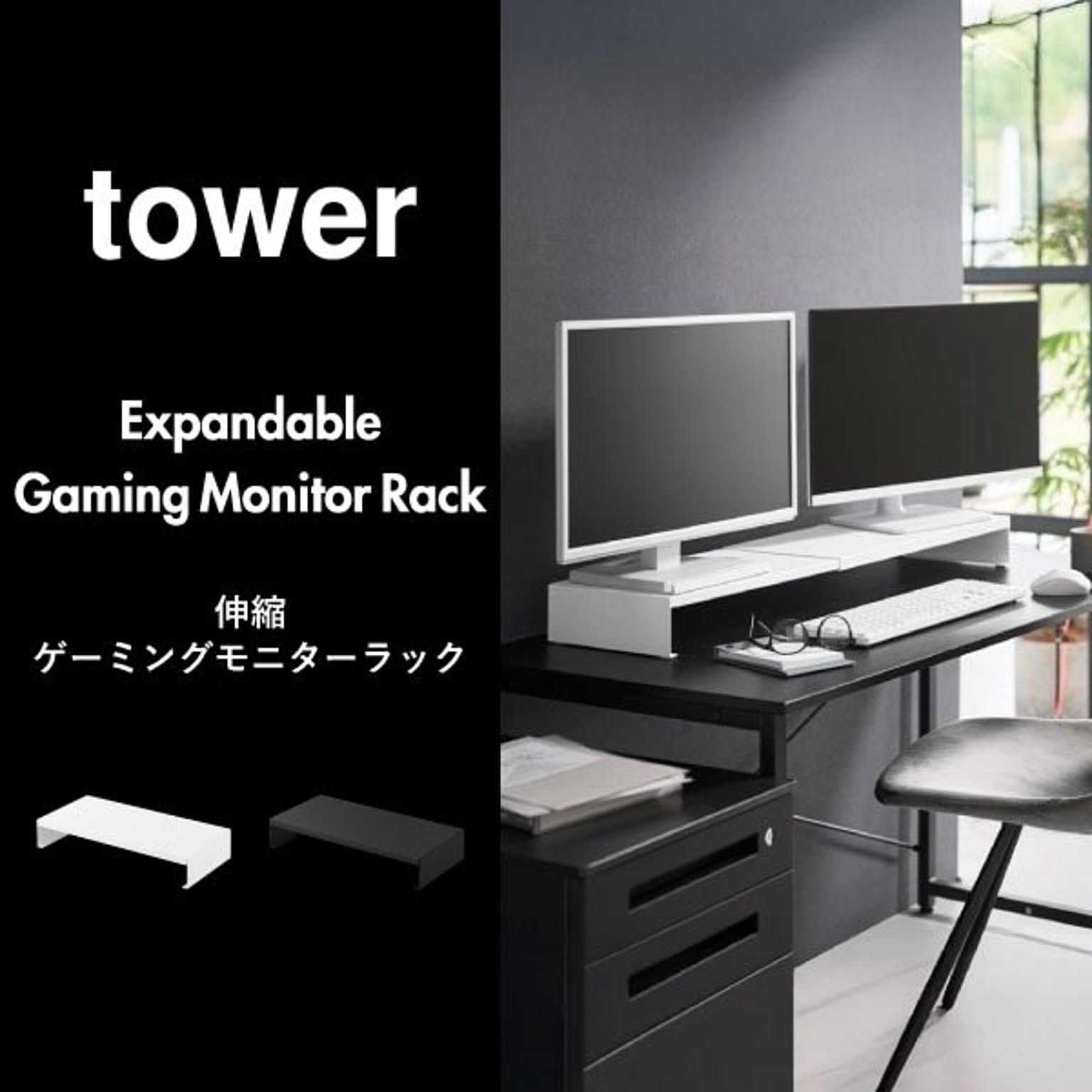 ゲーミングモニターの高さを底上げして、ゲームをしやすい環境を整えるゲーミングラックです。一切の無駄を省いた、シンプルでスタイリッシュなデザインのゲーミングラック。上質なシンプルさが様々な部屋に溶け込み、ワンランク上のインテリアを実現します。浅めのゲーミングデスクにも最適な、スリムなサイズ感のゲーミングラックで、モニターとの距離を適切に保ちつつ、ゲーミングデスク上の限られた空間を賢く活用。このゲーミングラックは、横幅を無段階で調節できる伸縮タイプです。お使いのモニターや、ゲーミングデスクの幅に応じて、自由に調節して使えます。シングルはもちろん、デュアルモニターにも対応できて便利です。ゲーミングラックの幅をあえて広くとることで、雑貨を置く収納スペースを確保できます。コの字型のゲーミングラックで、下の空間を活かしてキーボードやマウスを収納可能。ゲーミングデスク手前側の作業スペースを、広く確保することができます。ゲーミングラック天板の耐荷重は約10kgと、とても頑丈な仕様です。モニターだけでなく、WEBカメラやスピーカーなどの周辺機器もまとめてレイアウトできます。ゲーム用のモニターだけでなく、通常のパソコン用のモニターにもお使いいただけます。スタイリッシュなデザインなので、オフィスの雰囲気を壊すことがなく、よりスマートな印象に。ゲーミングラックは丈夫なスチール製で、表面加工によりキズやサビに強い仕様です。こちらのゲーミングラック底面にはシリコーン製の緩衝材がついていて、ゲーミングデスクが傷付くのを防いでくれます。ゲーミングラックの色は、ホワイトとブラックの2色からお選びいただけます。