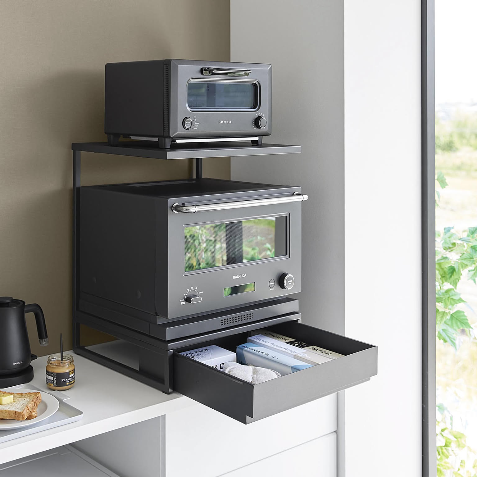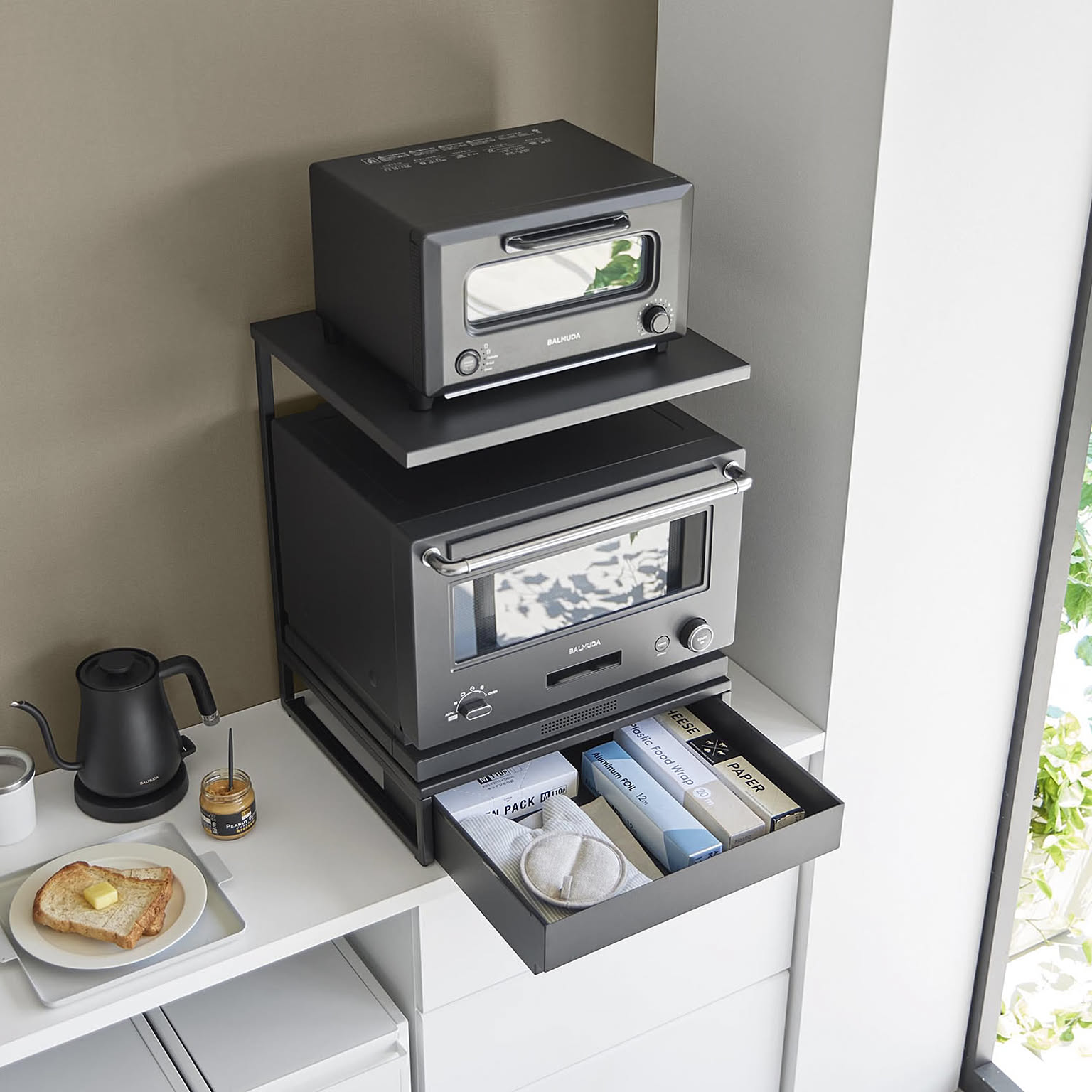 キッチン家電の下に置くだけでスライドテーブルや収納を増やせる、towerシリーズのおしゃれな家電下収納ラックです。