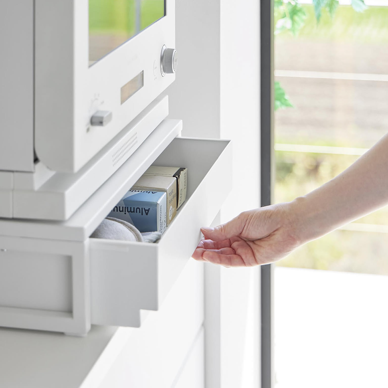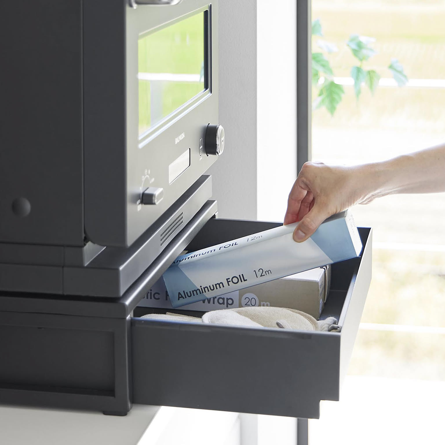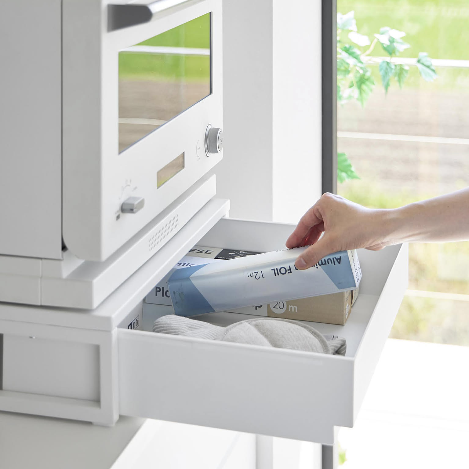 食事にラップをして電子レンジへ入れる時、ごはんを盛り付ける時などに活躍する家電下スライドテーブルです。