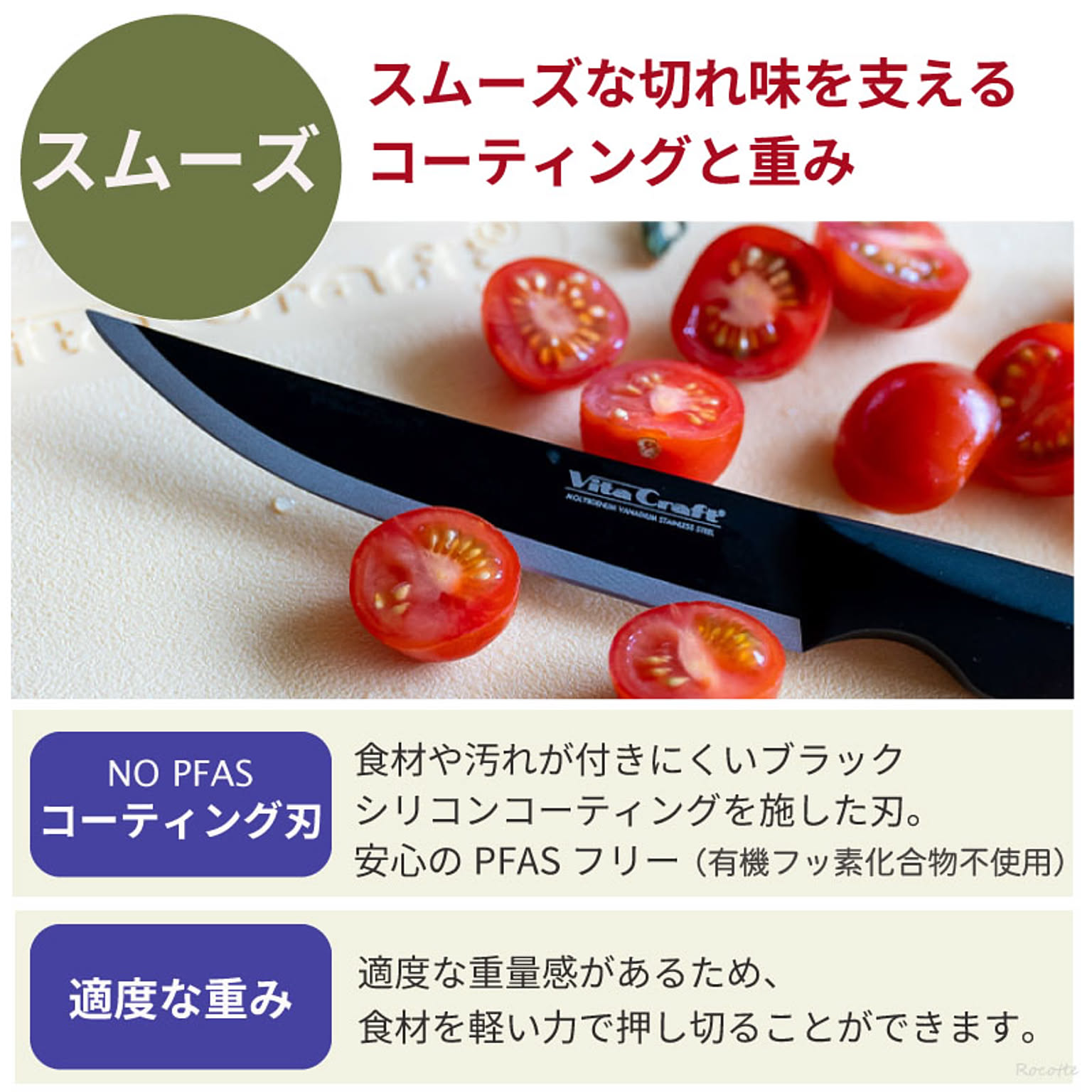 刃には、食材や汚れが付きにくいシリコンコーティング加工。